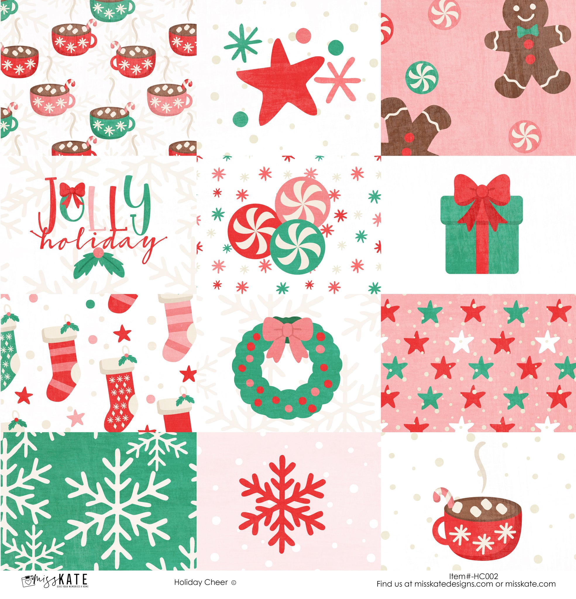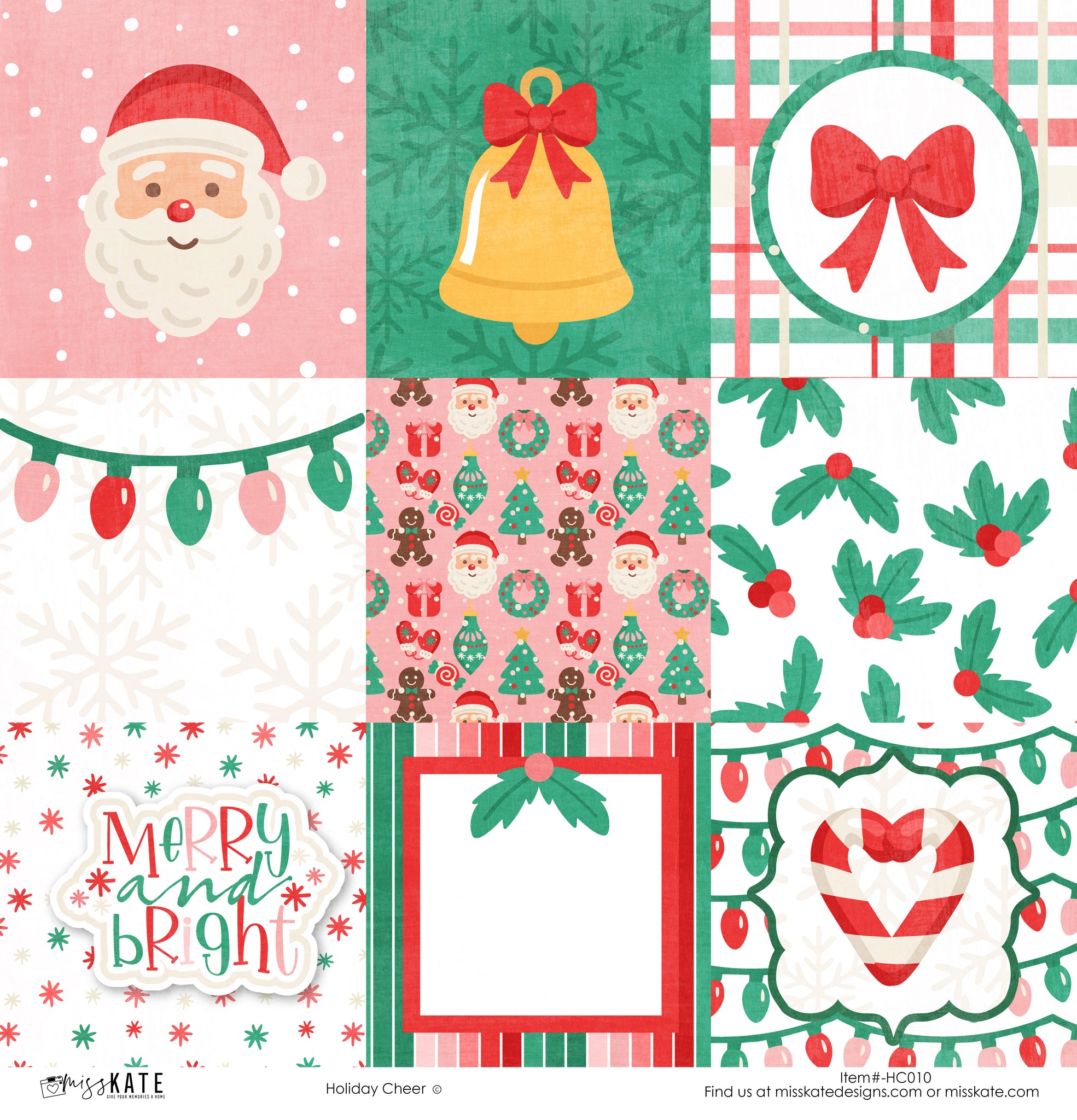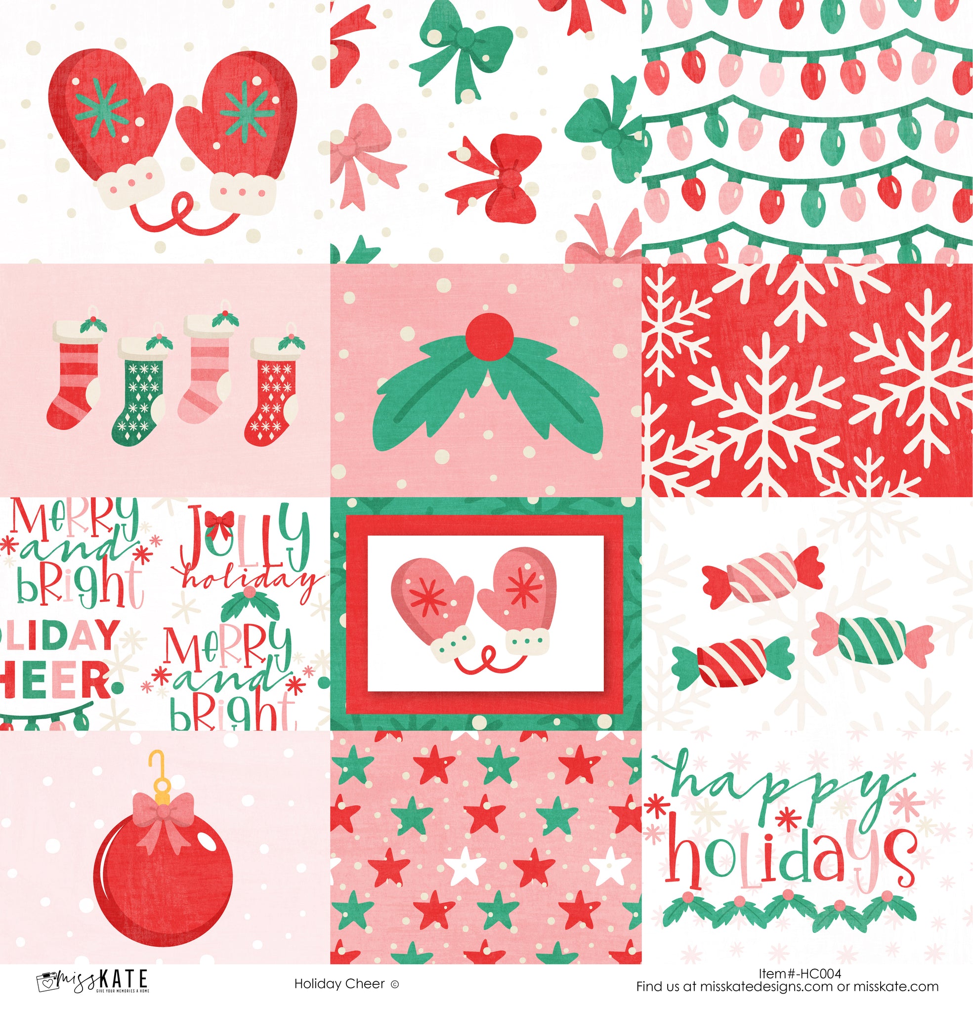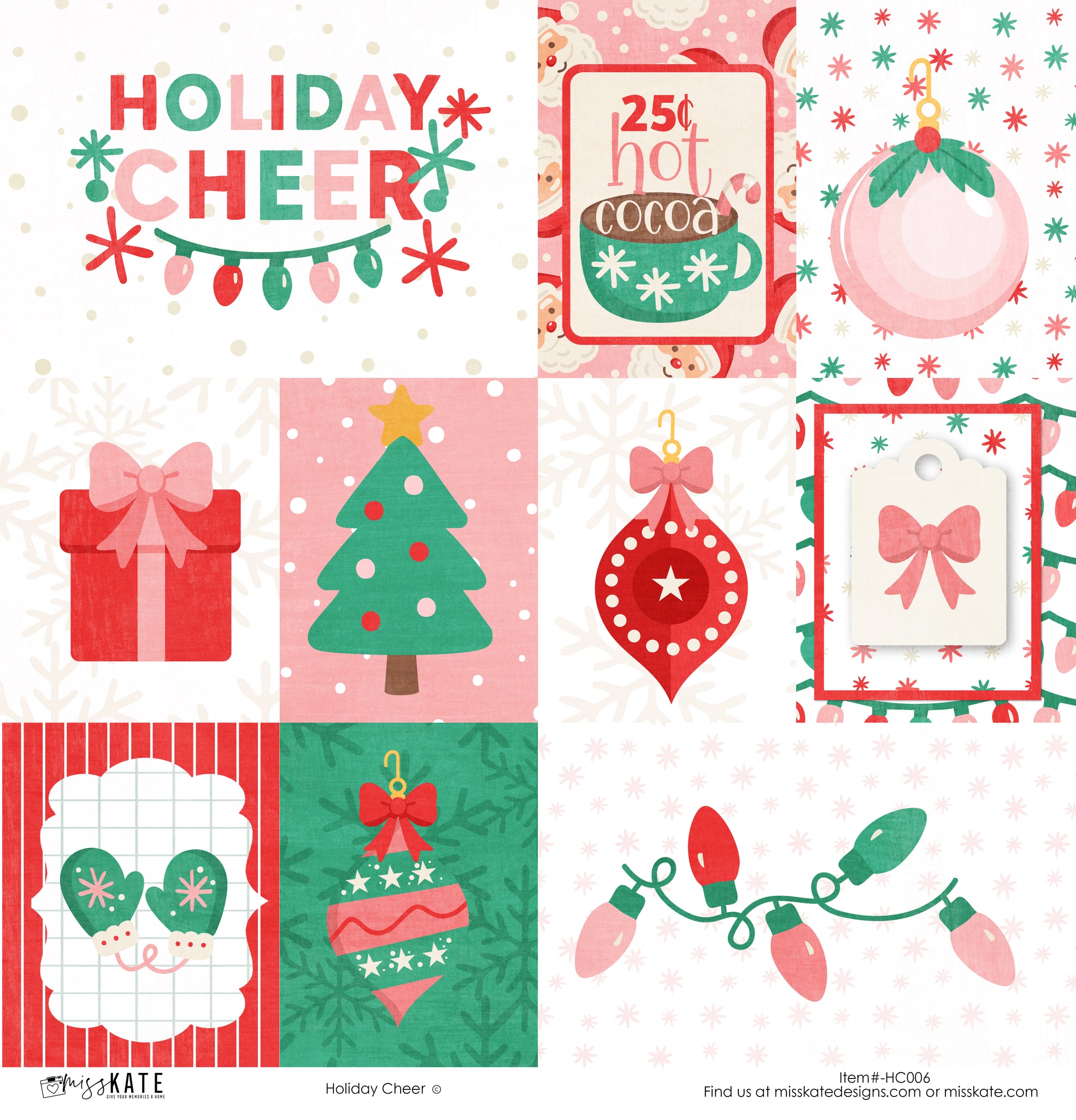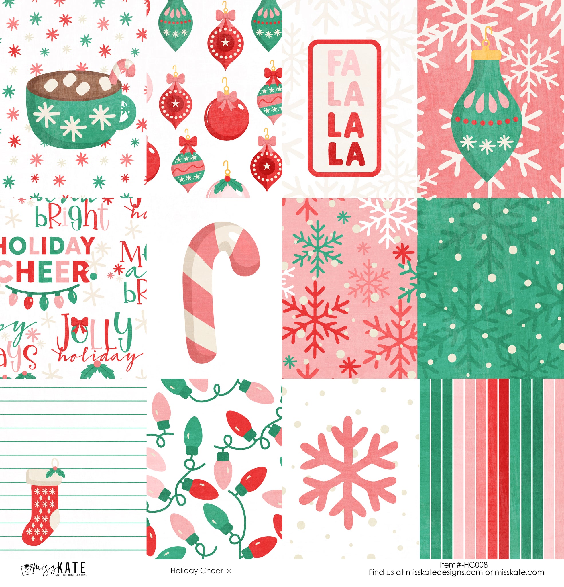 This cheerful holiday paper collection showcases a bright and playful Christmas color palette of red, green, pink, and soft cream tones. A wide variety of festive patterns fill the page, including candy canes, gingerbread cookies, ornaments, holly, snowflakes, Santa faces, plaid, stripes, and whimsical holiday phrases. The mix of classic motifs and modern illustrations creates a joyful, family-friendly feel that’s perfect for documenting seasonal memories. Centered on the page, the “Holiday Cheer” title ties the collection together, while the coordinated sticker sheet along the bottom features matching icons, sentiments, and decorative elements for easy embellishing. Overall, the collection feels warm, nostalgic, and fun—ideal for Christmas scrapbooking, card making, and holiday crafts.