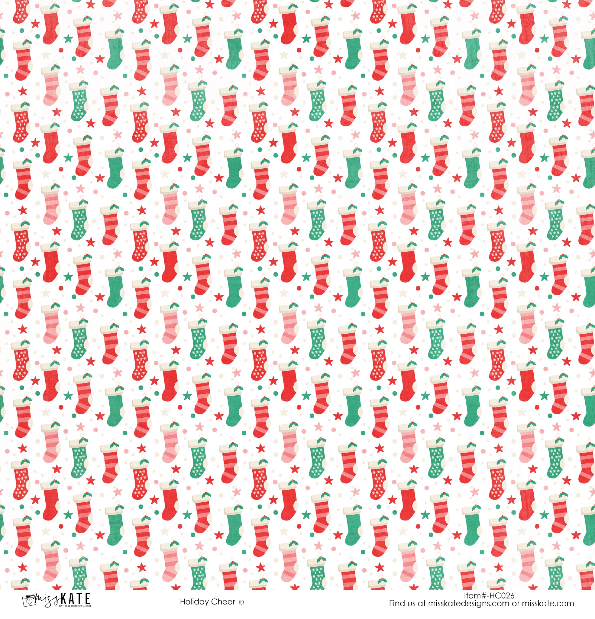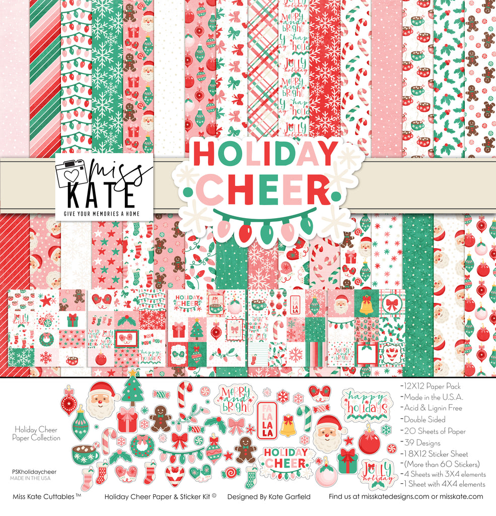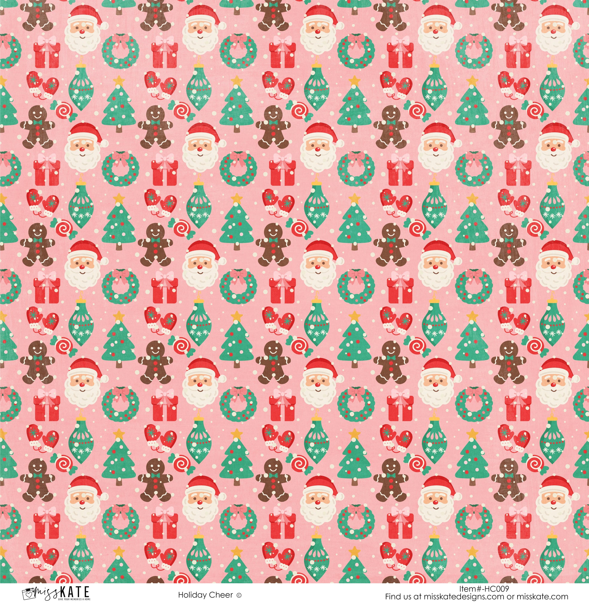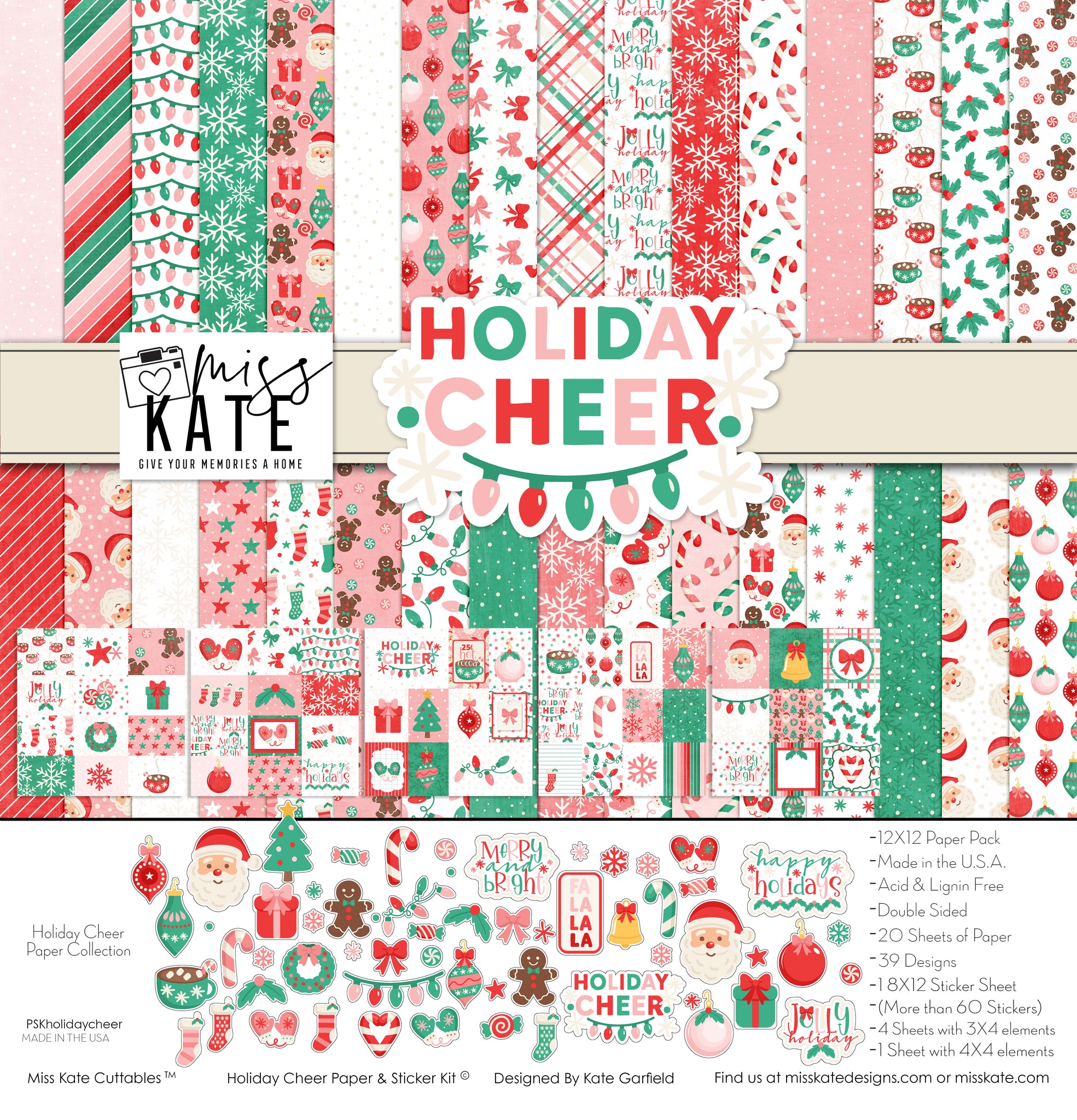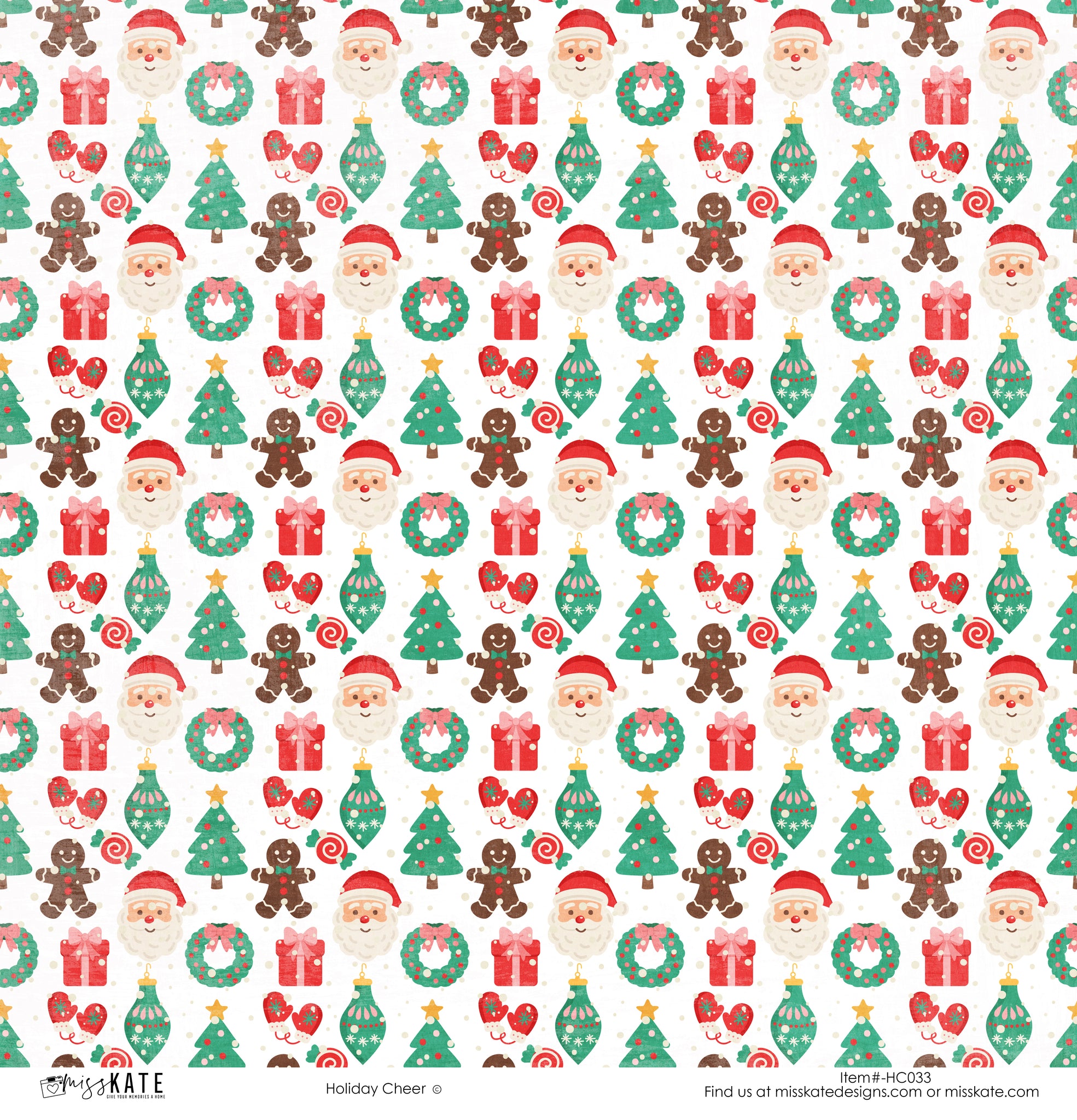 This cheerful holiday paper collection showcases a bright and playful Christmas color palette of red, green, pink, and soft cream tones. A wide variety of festive patterns fill the page, including candy canes, gingerbread cookies, ornaments, holly, snowflakes, Santa faces, plaid, stripes, and whimsical holiday phrases. The mix of classic motifs and modern illustrations creates a joyful, family-friendly feel that’s perfect for documenting seasonal memories. Centered on the page, the “Holiday Cheer” title ties the collection together, while the coordinated sticker sheet along the bottom features matching icons, sentiments, and decorative elements for easy embellishing. Overall, the collection feels warm, nostalgic, and fun—ideal for Christmas scrapbooking, card making, and holiday crafts.