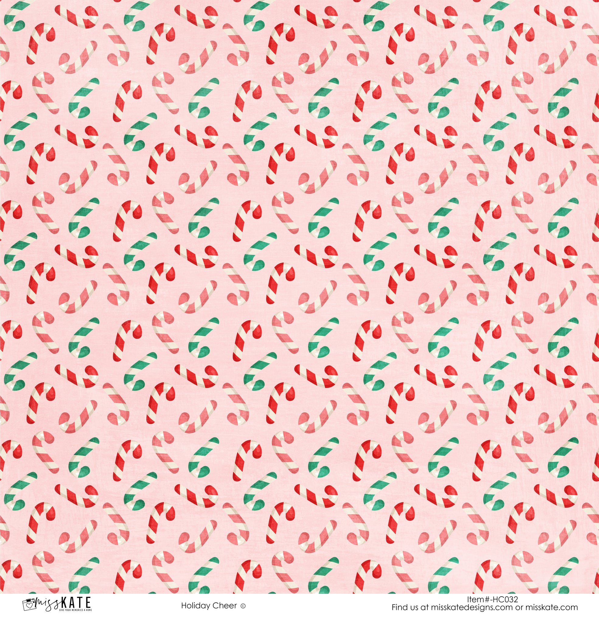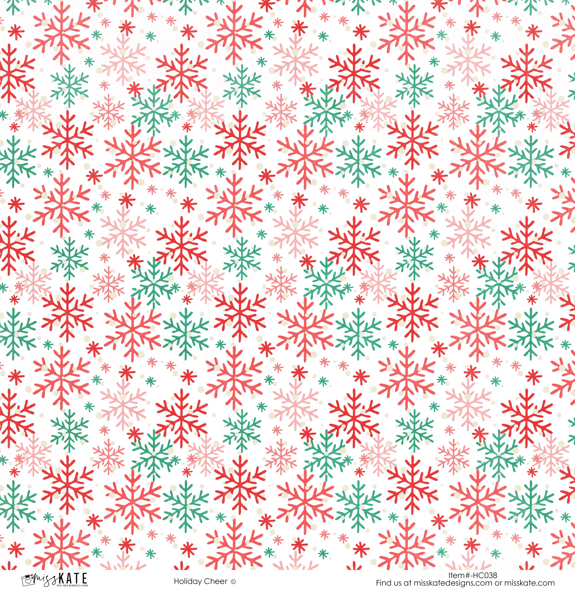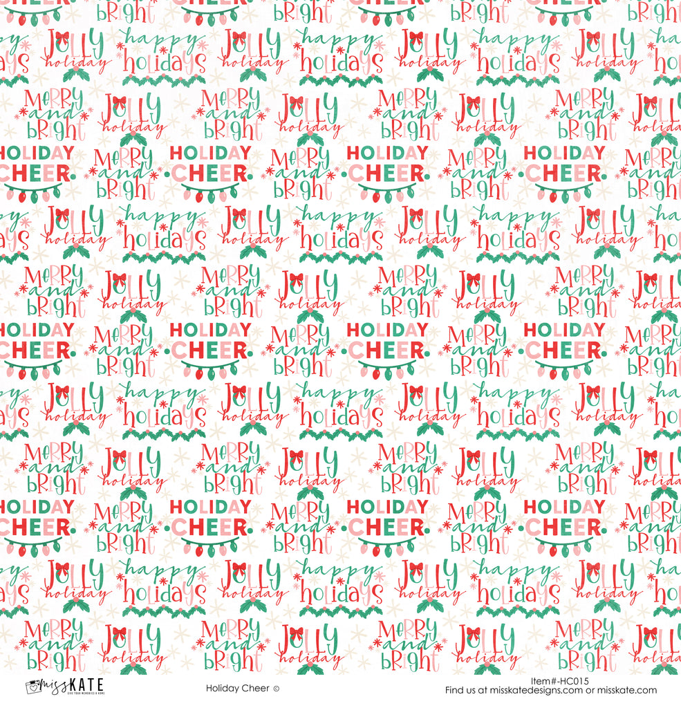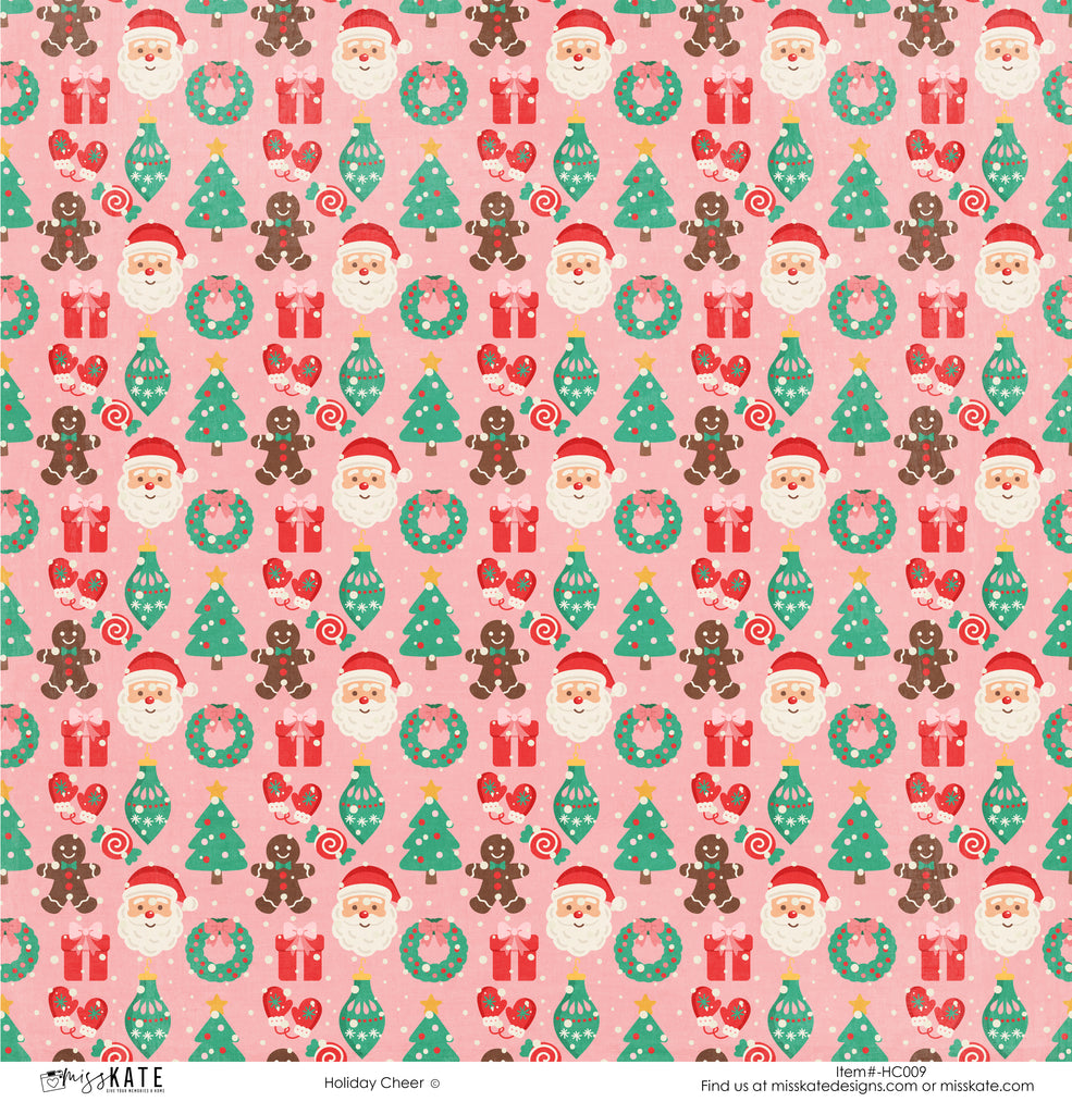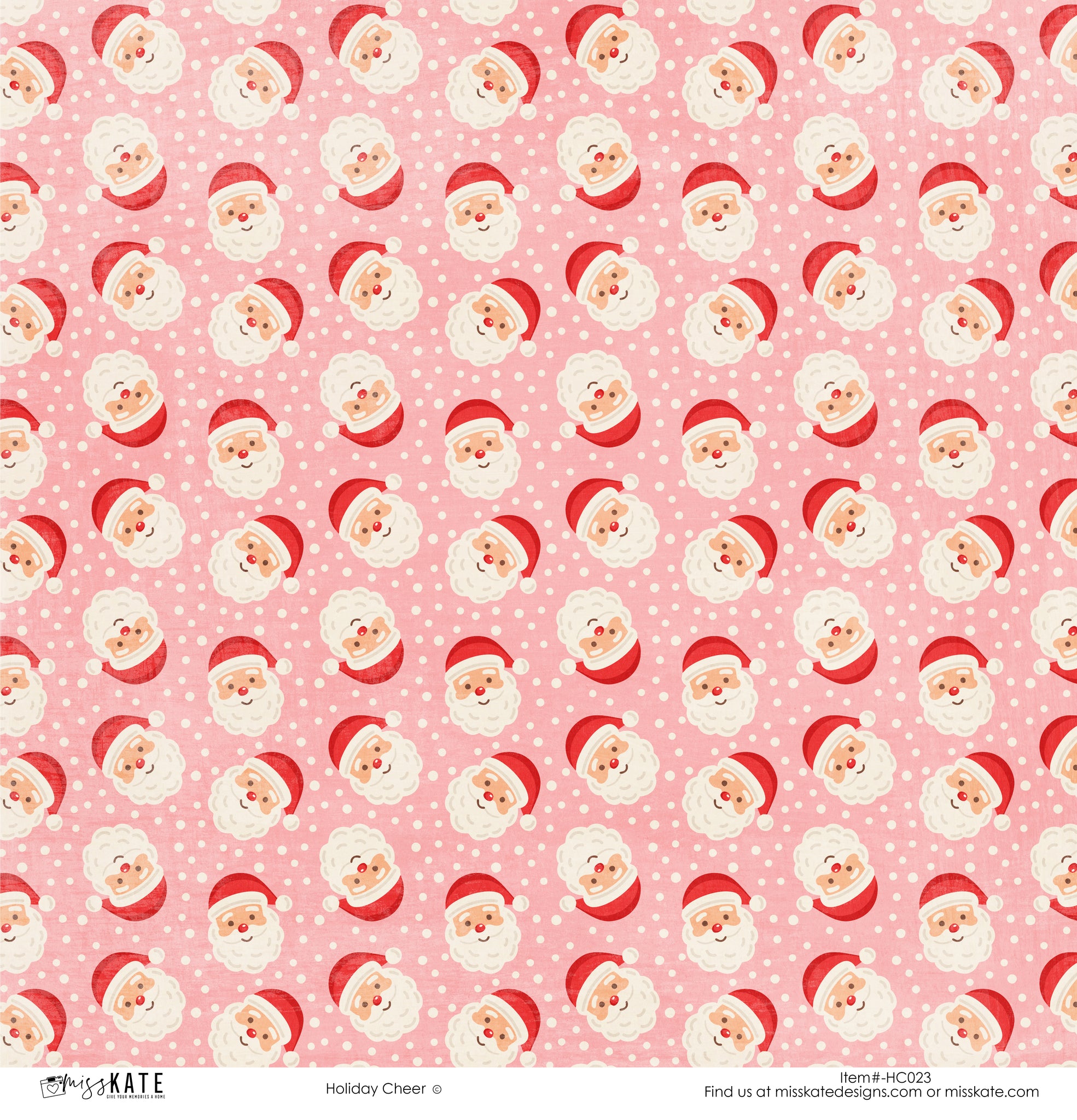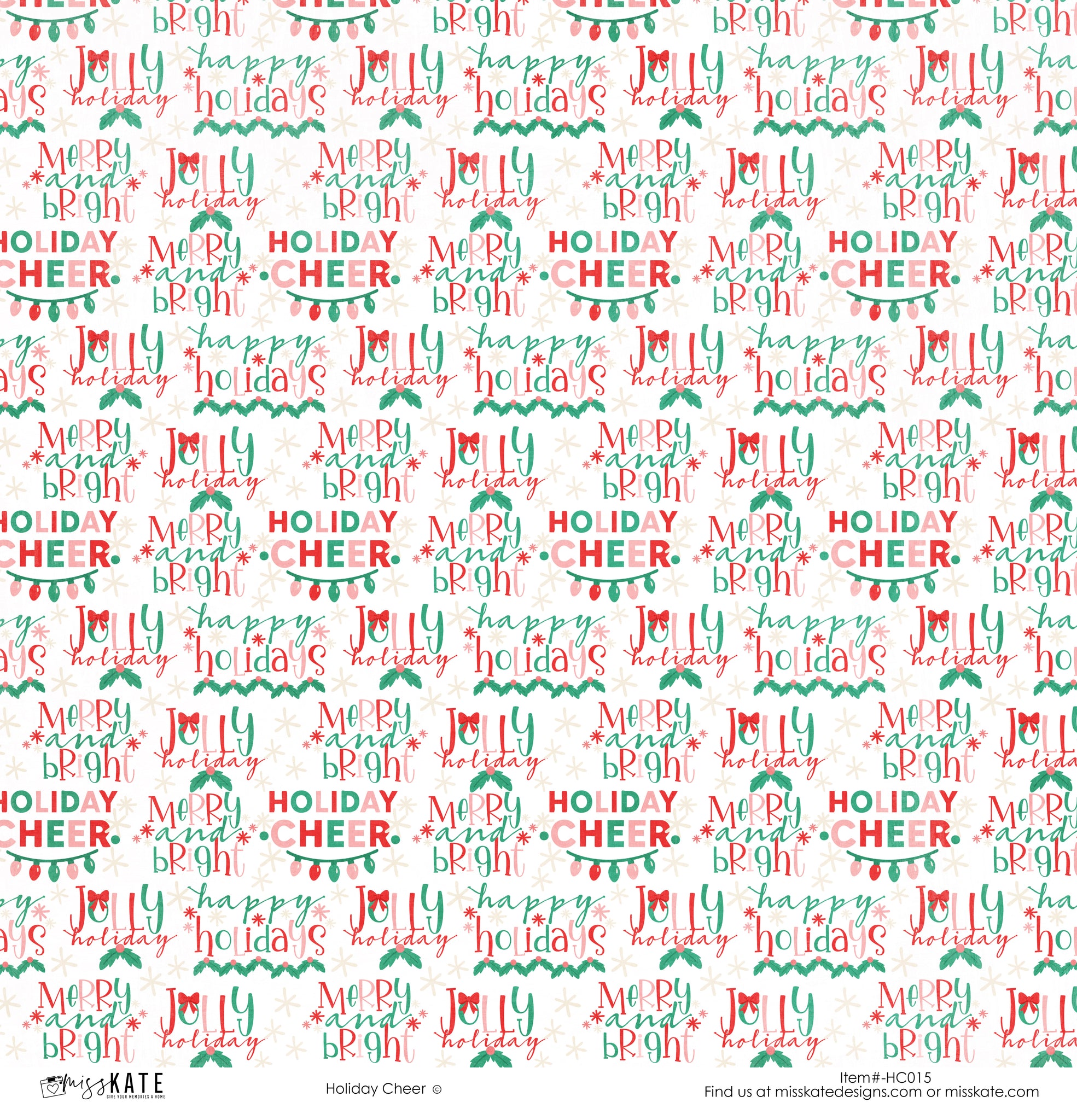 This cheerful holiday paper collection showcases a bright and playful Christmas color palette of red, green, pink, and soft cream tones. A wide variety of festive patterns fill the page, including candy canes, gingerbread cookies, ornaments, holly, snowflakes, Santa faces, plaid, stripes, and whimsical holiday phrases. The mix of classic motifs and modern illustrations creates a joyful, family-friendly feel that’s perfect for documenting seasonal memories. Centered on the page, the “Holiday Cheer” title ties the collection together, while the coordinated sticker sheet along the bottom features matching icons, sentiments, and decorative elements for easy embellishing. Overall, the collection feels warm, nostalgic, and fun—ideal for Christmas scrapbooking, card making, and holiday crafts.