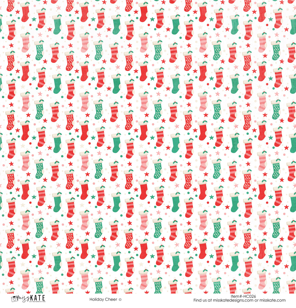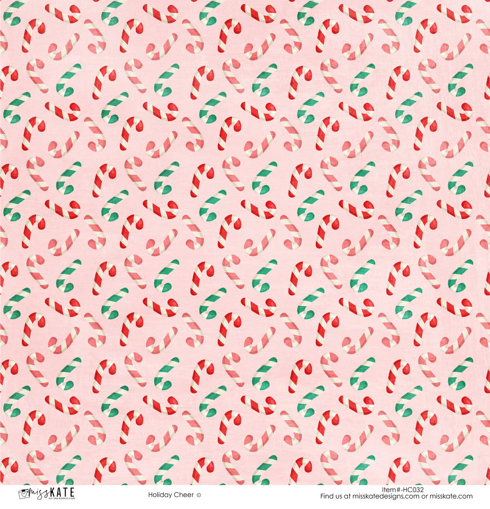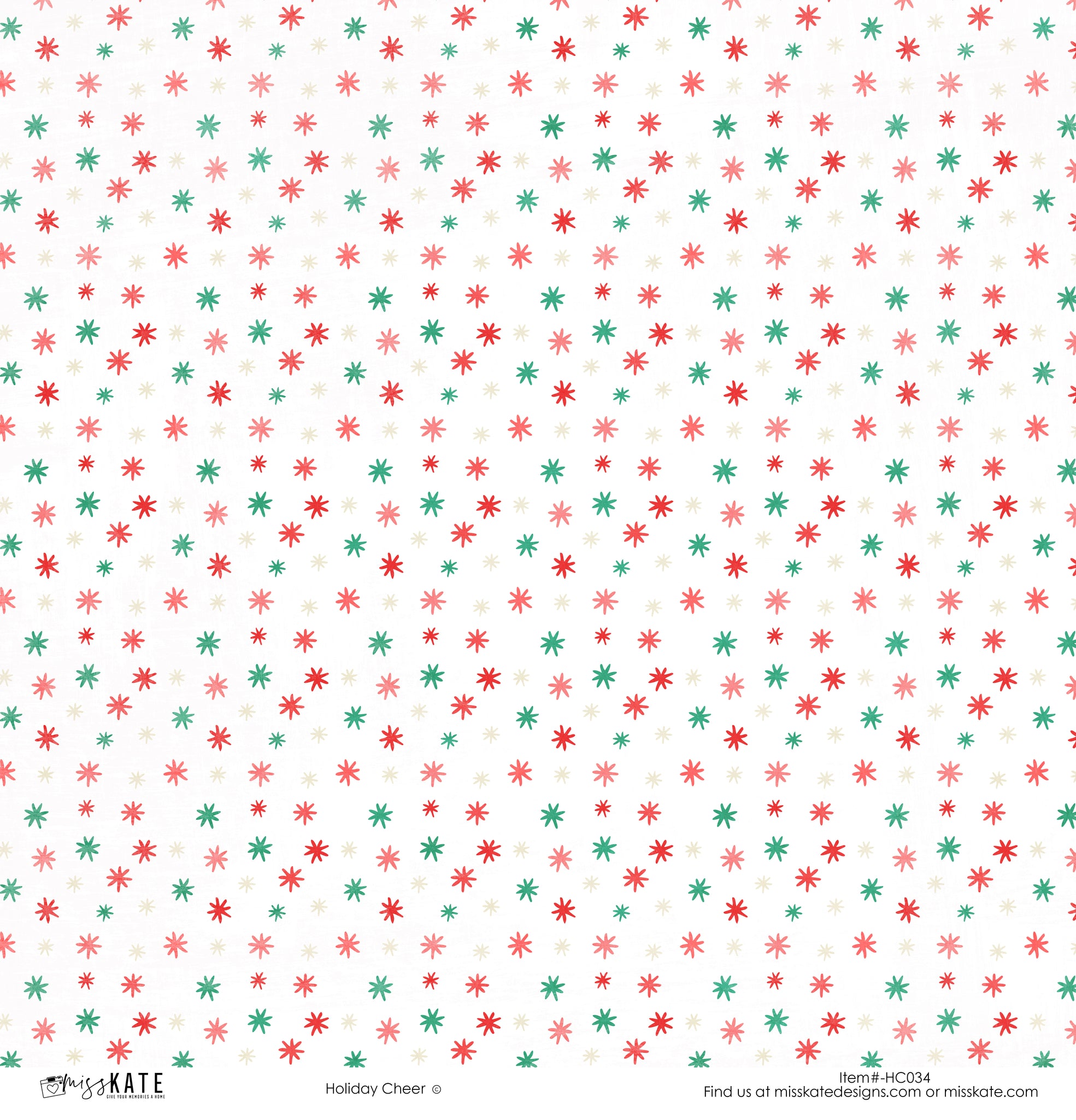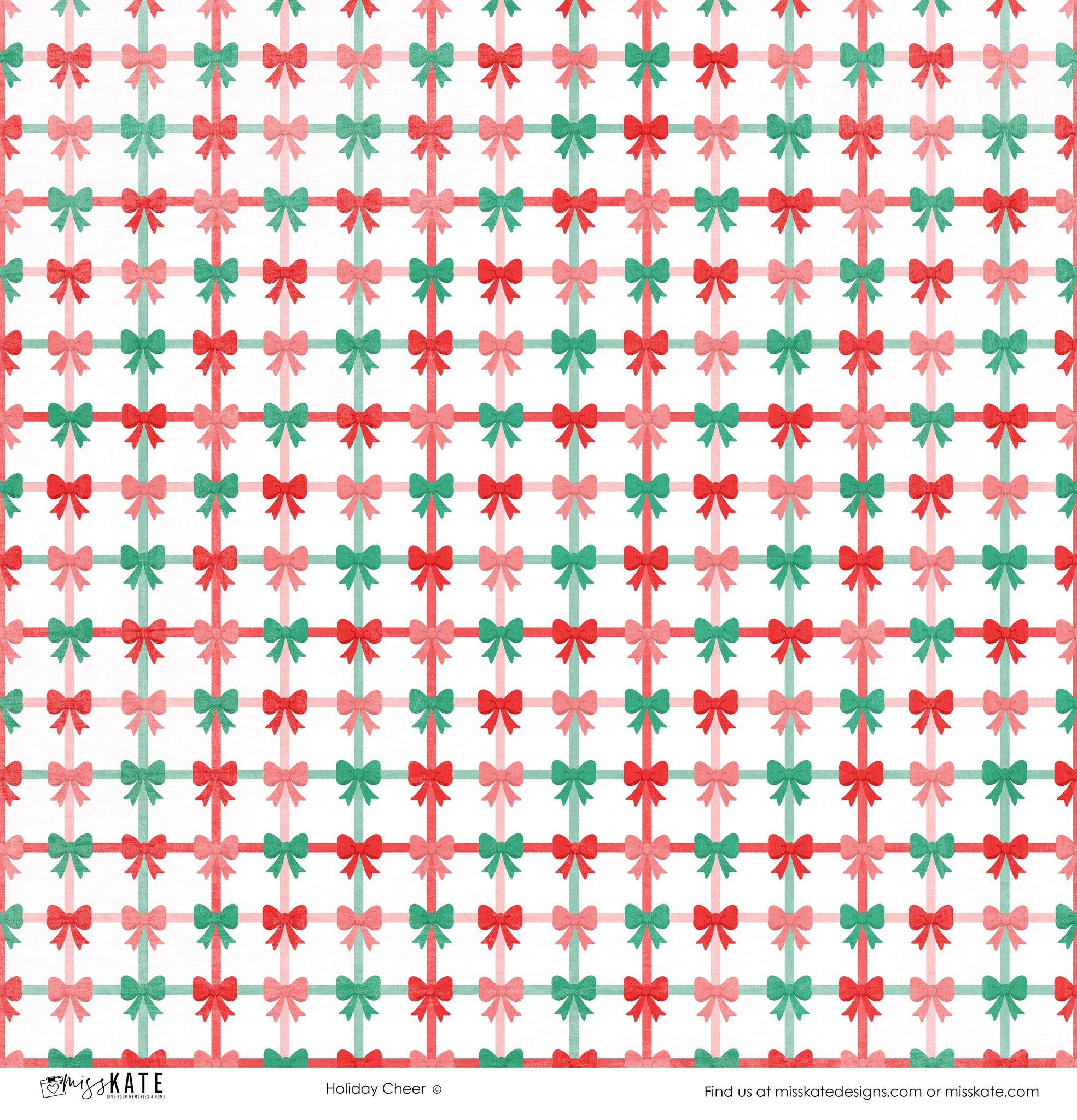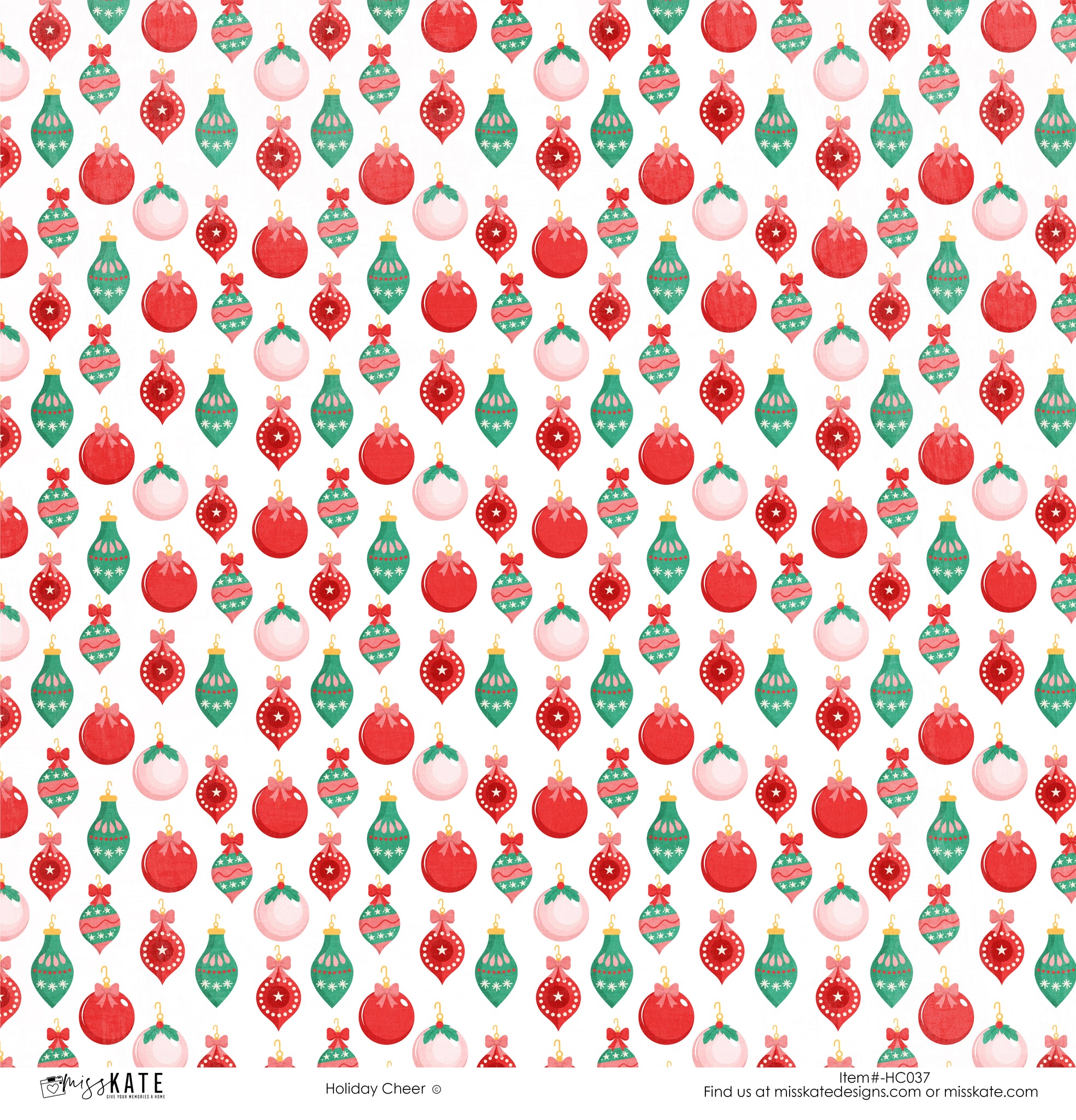 This cheerful holiday paper collection showcases a bright and playful Christmas color palette of red, green, pink, and soft cream tones. A wide variety of festive patterns fill the page, including candy canes, gingerbread cookies, ornaments, holly, snowflakes, Santa faces, plaid, stripes, and whimsical holiday phrases. The mix of classic motifs and modern illustrations creates a joyful, family-friendly feel that’s perfect for documenting seasonal memories. Centered on the page, the “Holiday Cheer” title ties the collection together, while the coordinated sticker sheet along the bottom features matching icons, sentiments, and decorative elements for easy embellishing. Overall, the collection feels warm, nostalgic, and fun—ideal for Christmas scrapbooking, card making, and holiday crafts.