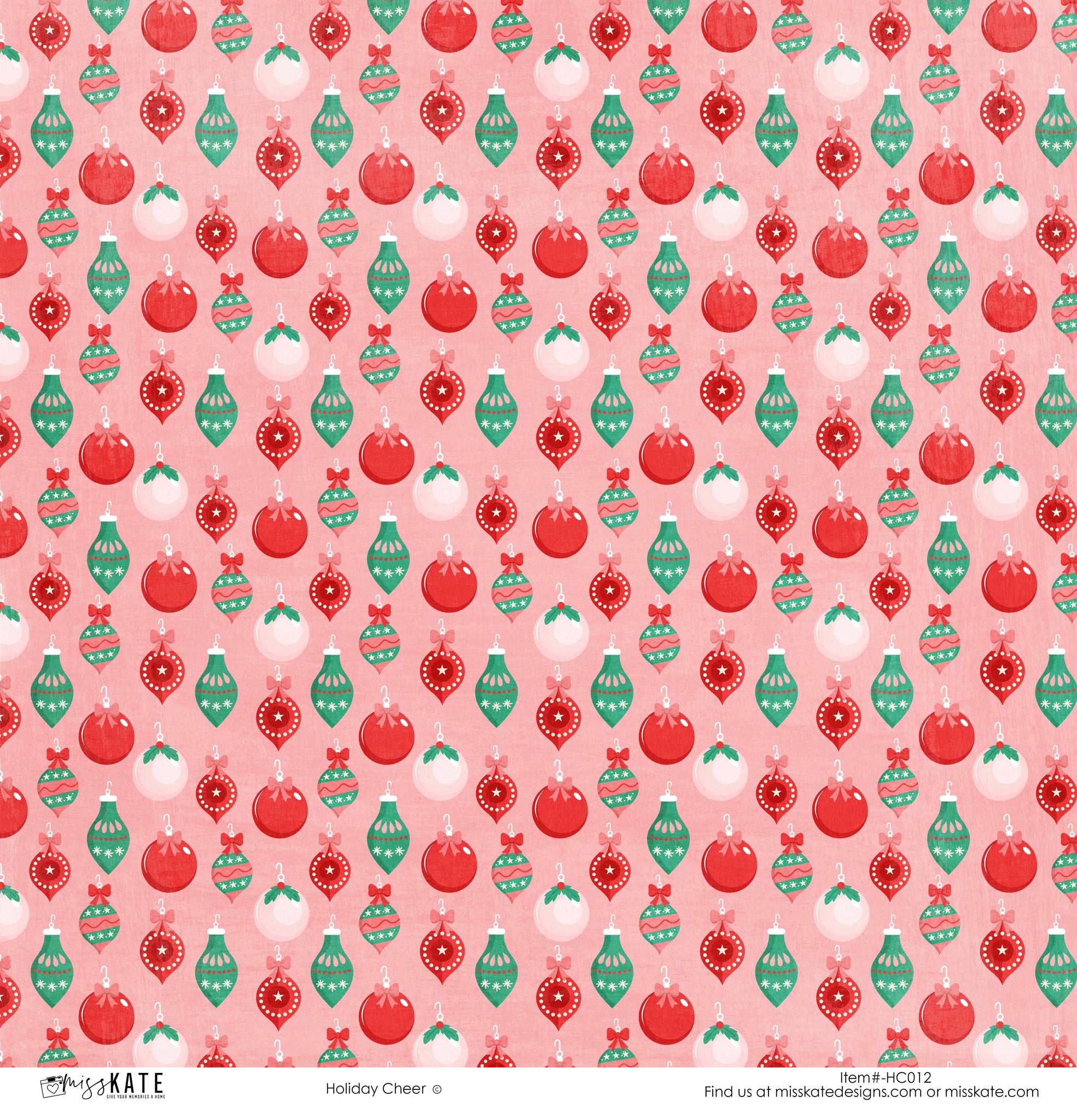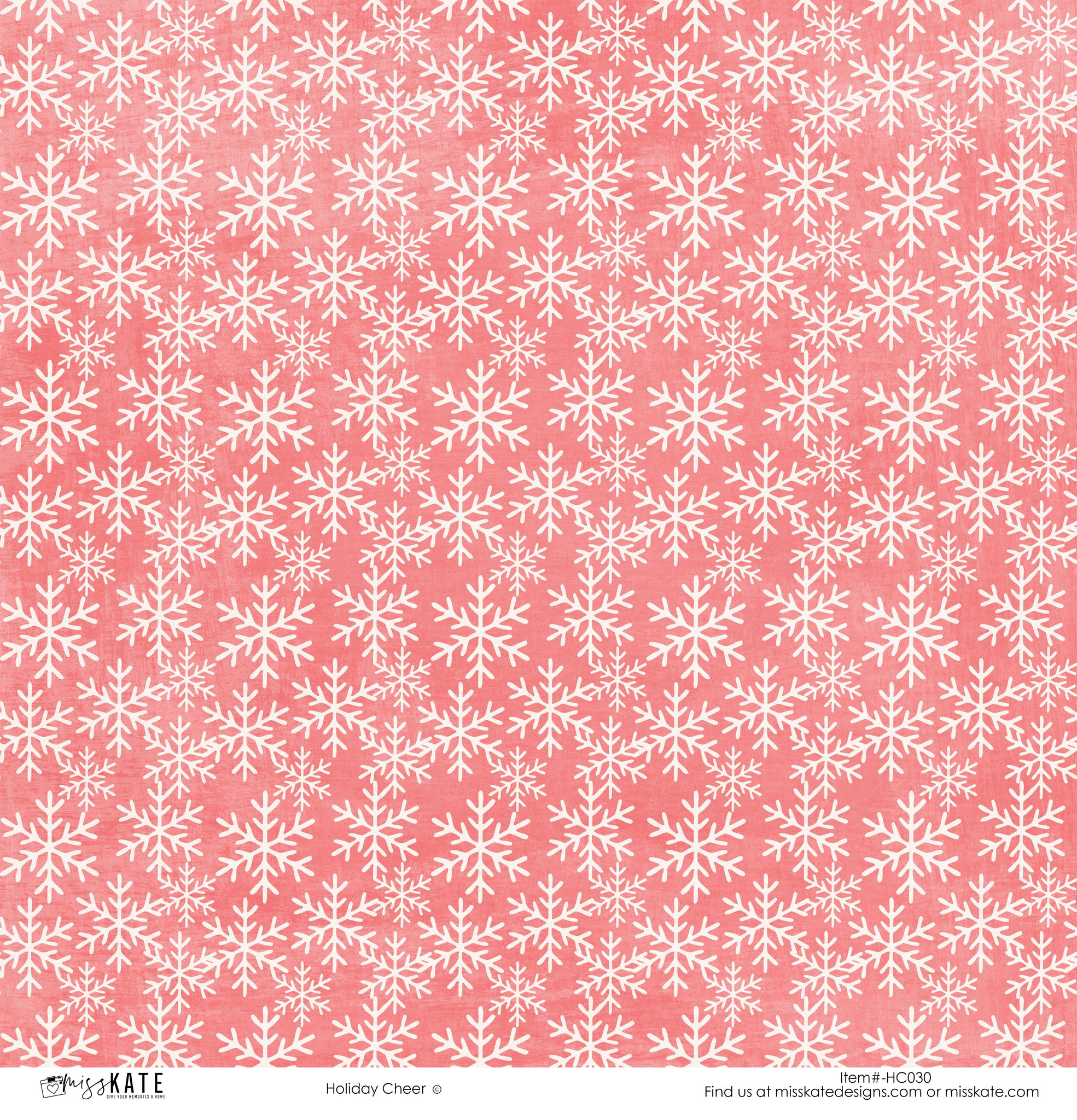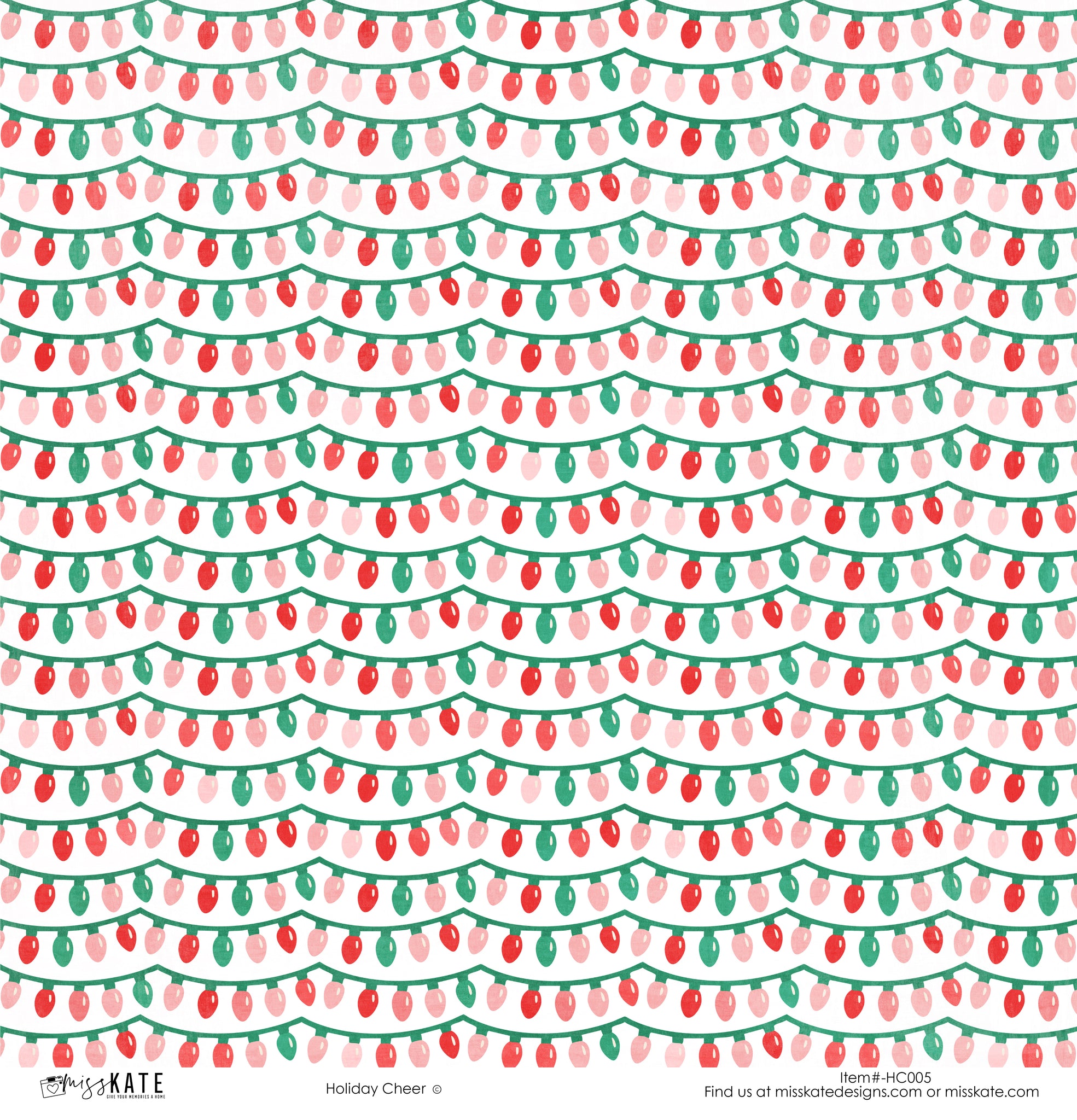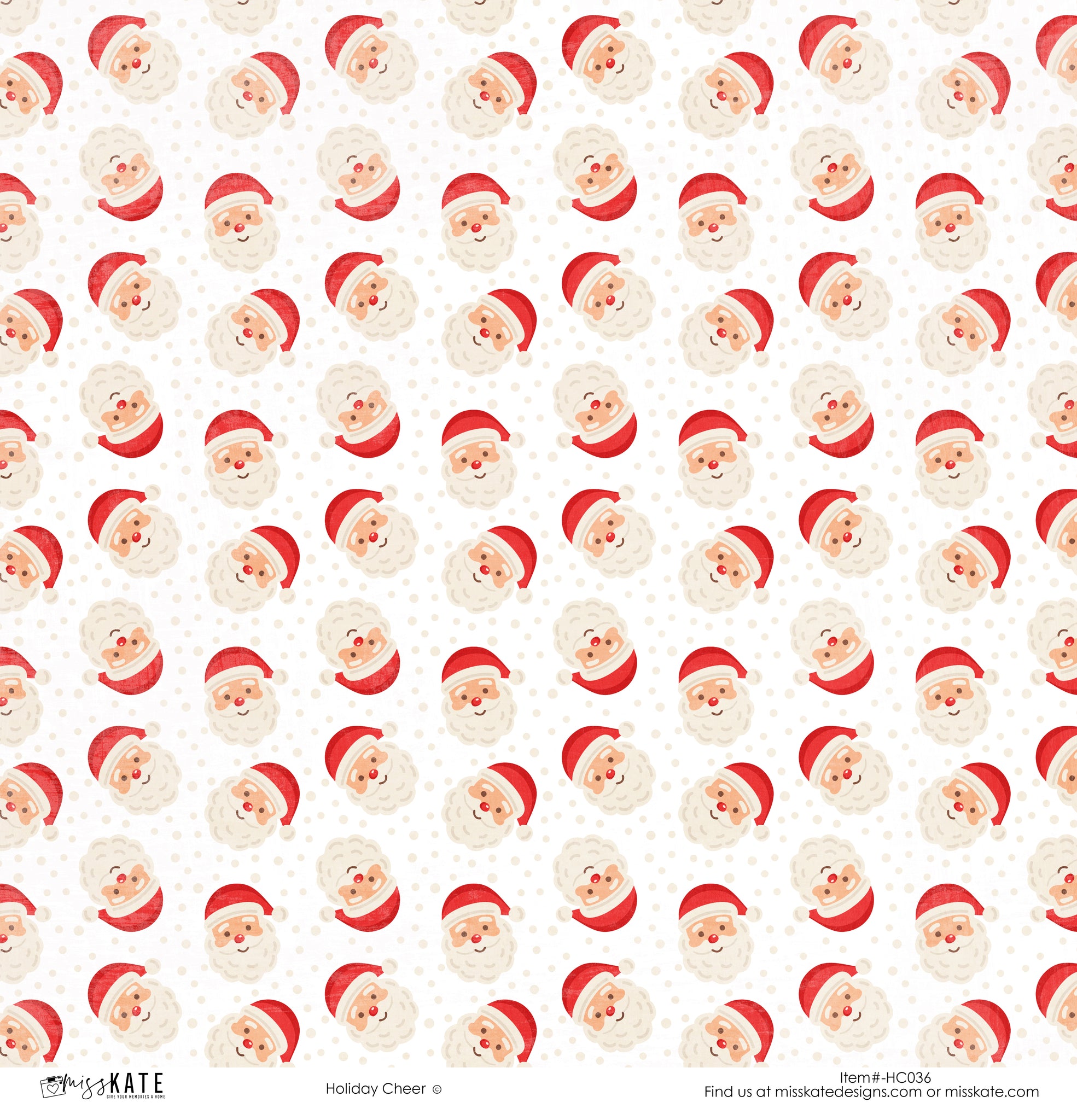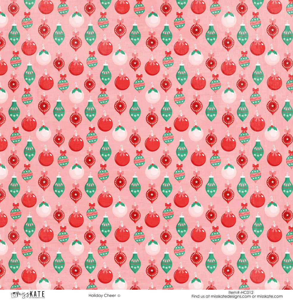 This cheerful holiday paper collection showcases a bright and playful Christmas color palette of red, green, pink, and soft cream tones. A wide variety of festive patterns fill the page, including candy canes, gingerbread cookies, ornaments, holly, snowflakes, Santa faces, plaid, stripes, and whimsical holiday phrases. The mix of classic motifs and modern illustrations creates a joyful, family-friendly feel that’s perfect for documenting seasonal memories. Centered on the page, the “Holiday Cheer” title ties the collection together, while the coordinated sticker sheet along the bottom features matching icons, sentiments, and decorative elements for easy embellishing. Overall, the collection feels warm, nostalgic, and fun—ideal for Christmas scrapbooking, card making, and holiday crafts.