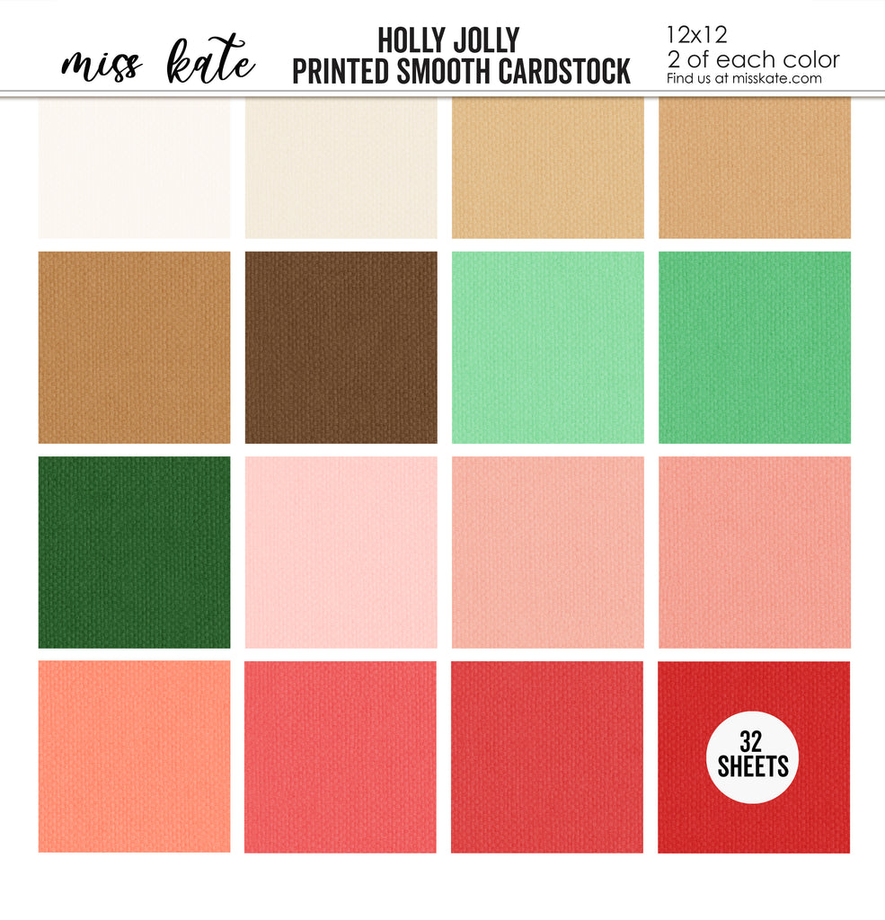 Cardstock Description Single-Sided Linen-Printed Smooth Cardstock Kate created 16 custom colors that perfectly match our Holly Jolly designs, added her exclusive Linen Pattern, and combined them for you in this 32 sheet pack. Colors Match It has NEVER been this easy to match cardstock with paper! About our Paper Our cardstock sheets provide a stiff, strong surface to work on that has a linen feel. You will find that it cuts beautifully in your Cricut, Cameo, or any other cutting machine. It is perfect for backgrounds, die cuts, photo mats, and any other crafting project. We love our Linen Printed Card Stock and think you will too! THEME: Christmas, Holidays, December, Santa, Christmas Eve, Winter. |