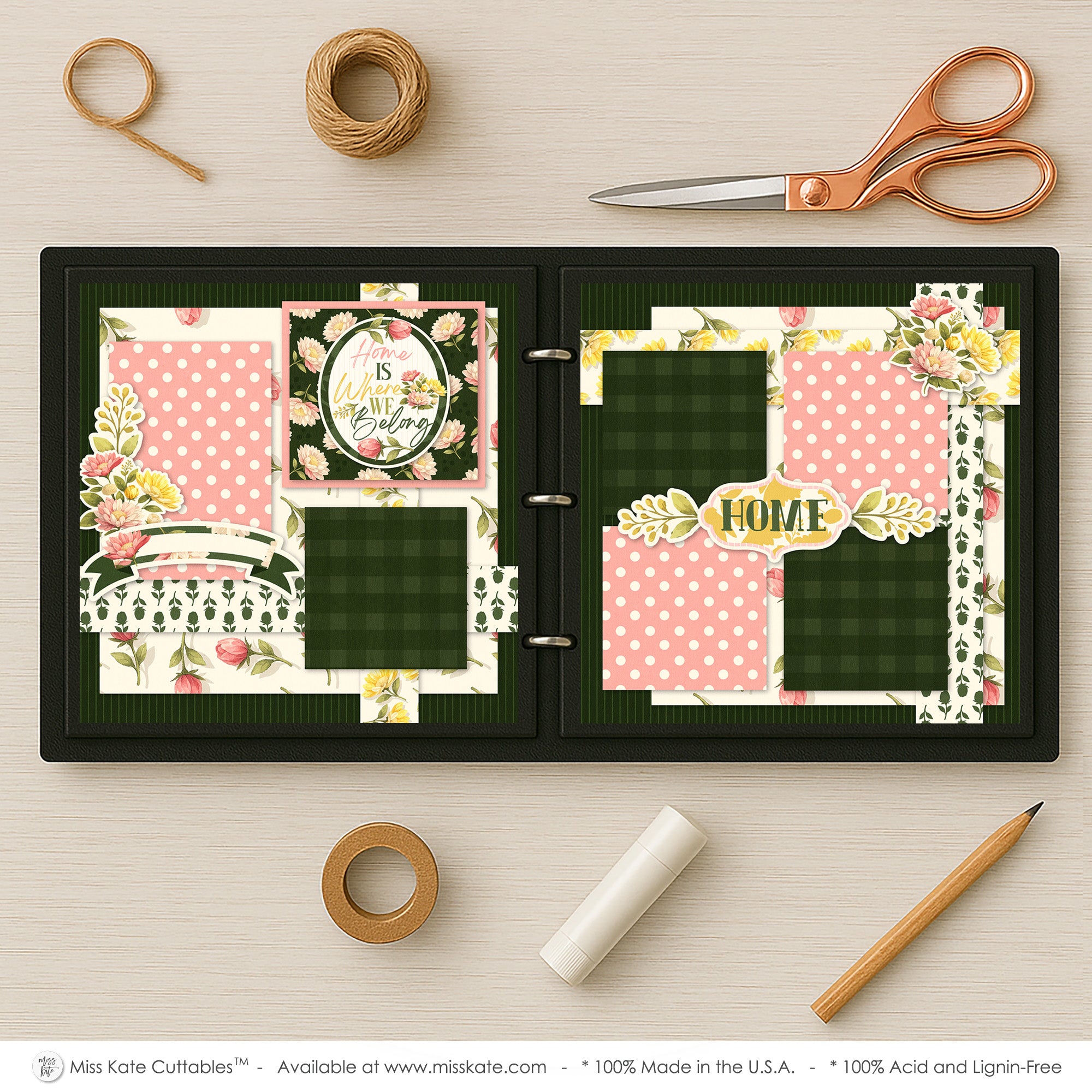 This scrapbook layout showcases a charming, cozy home-inspired theme filled with warmth and soft garden elegance. Rich, deep green striped and plaid backgrounds create a grounded, comforting base that contrasts beautifully with delicate floral papers featuring blooming roses and soft yellow flowers. Blush pink polka-dot photo mats add a sweet, playful touch while drawing attention to the photo placements. Layered floral clusters, leafy accents, and decorative banners enhance the dimensional feel, giving the layout a handcrafted and welcoming style. A framed centerpiece reading “Home Is Where We Belong” anchors the page with heartfelt sentiment, while coordinating embellishments labeled “Home” reinforce the theme of love, family, and cherished everyday memories.