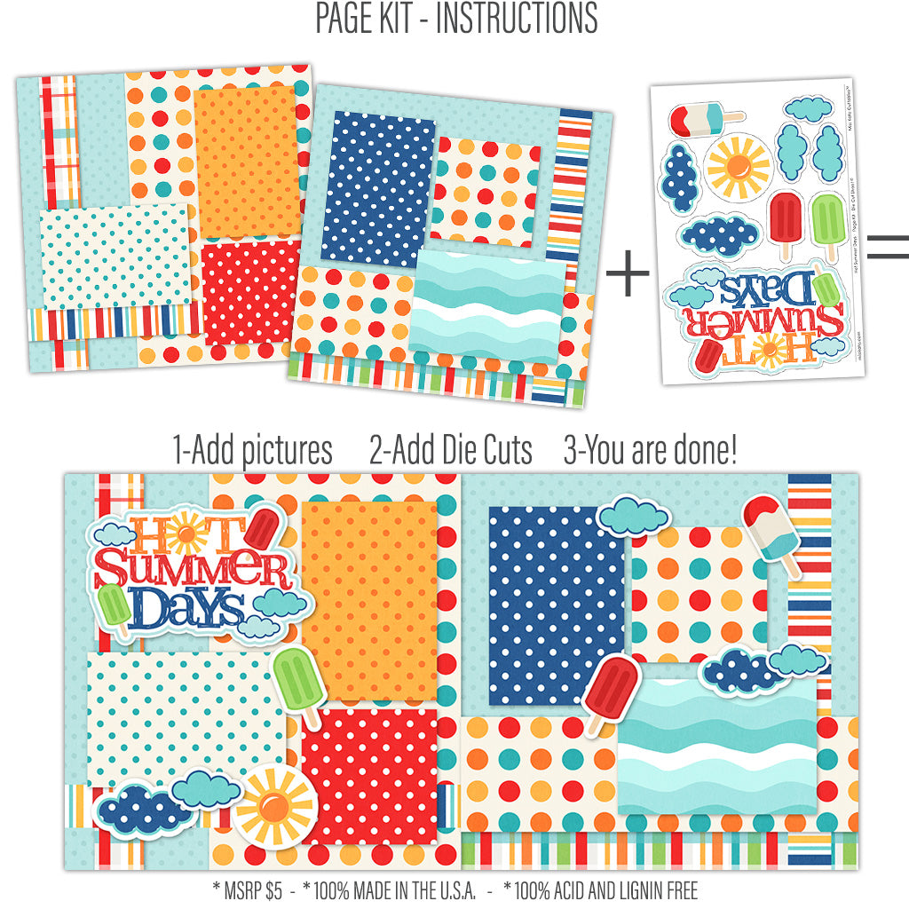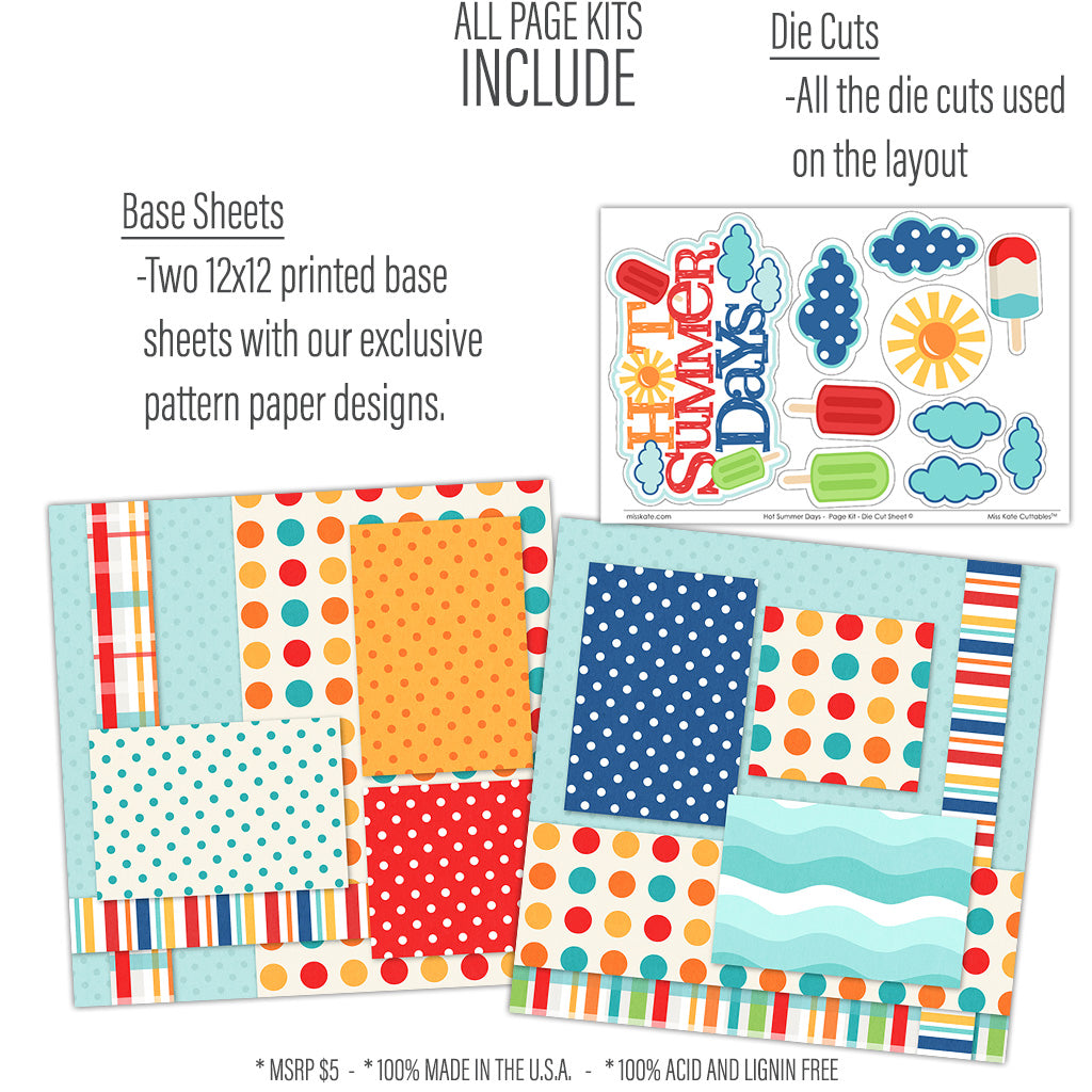 About our Page Kits Our Page Kits include proprietary Miss Kate Pattern Paper and Miss Kate Die Cuts. The cover page features full-color high-resolution pictures of the assembled layouts. Die cuts are left in the sheet and ready for you to easily pop out, this allows you to see them all spread out and helps prevent any accidental loss. These page kits are adorable, easy to do, and at such a great price! We love our Page Kits and think you will too! |