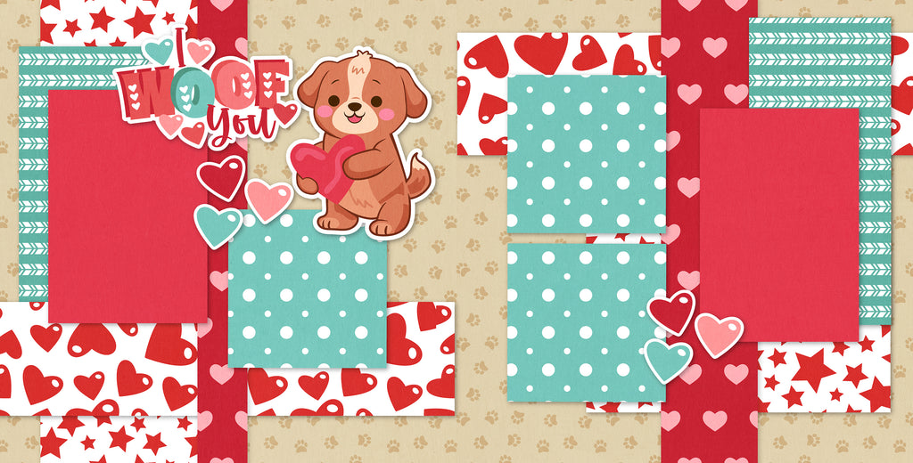 This cheerful Valentine scrapbook layout features a playful puppy-love theme with a warm, cozy color palette of reds, teals, and soft neutrals. A smiling cartoon puppy holding a heart takes center stage, surrounded by layered heart embellishments and the sweet sentiment “I Woof You,” instantly setting a fun and affectionate tone. The background combines paw-print patterns, stripes, stars, and heart motifs, adding texture and whimsy without overwhelming the design. Teal polka-dot photo mats balance the bold red panels, creating clear focal points for photos while keeping the layout lively and cohesive. Overall, the page feels lighthearted and loving—perfect for capturing puppy snuggles, Valentine memories, or moments full of unconditional love.