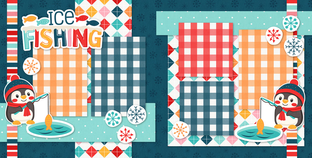 This cheerful ice fishing scrapbook layout captures a playful winter day on the frozen lake with bright colors and cozy details. The design features layered photo mats in warm gingham patterns of orange, teal, and red set against a background of snowy blues and geometric winter prints. Cute embellishments bring the scene to life, including a bundled-up penguin holding a fishing pole beside a small ice hole with a bright fish peeking out. Scattered snowflake accents and circular winter icons add movement and texture, while striped borders frame the page with a festive touch. The bold “Ice Fishing” title at the top, decorated with tiny fish and frosty accents, sets the theme perfectly, creating a fun and lighthearted layout ideal for preserving memories of a chilly adventure out on the ice.