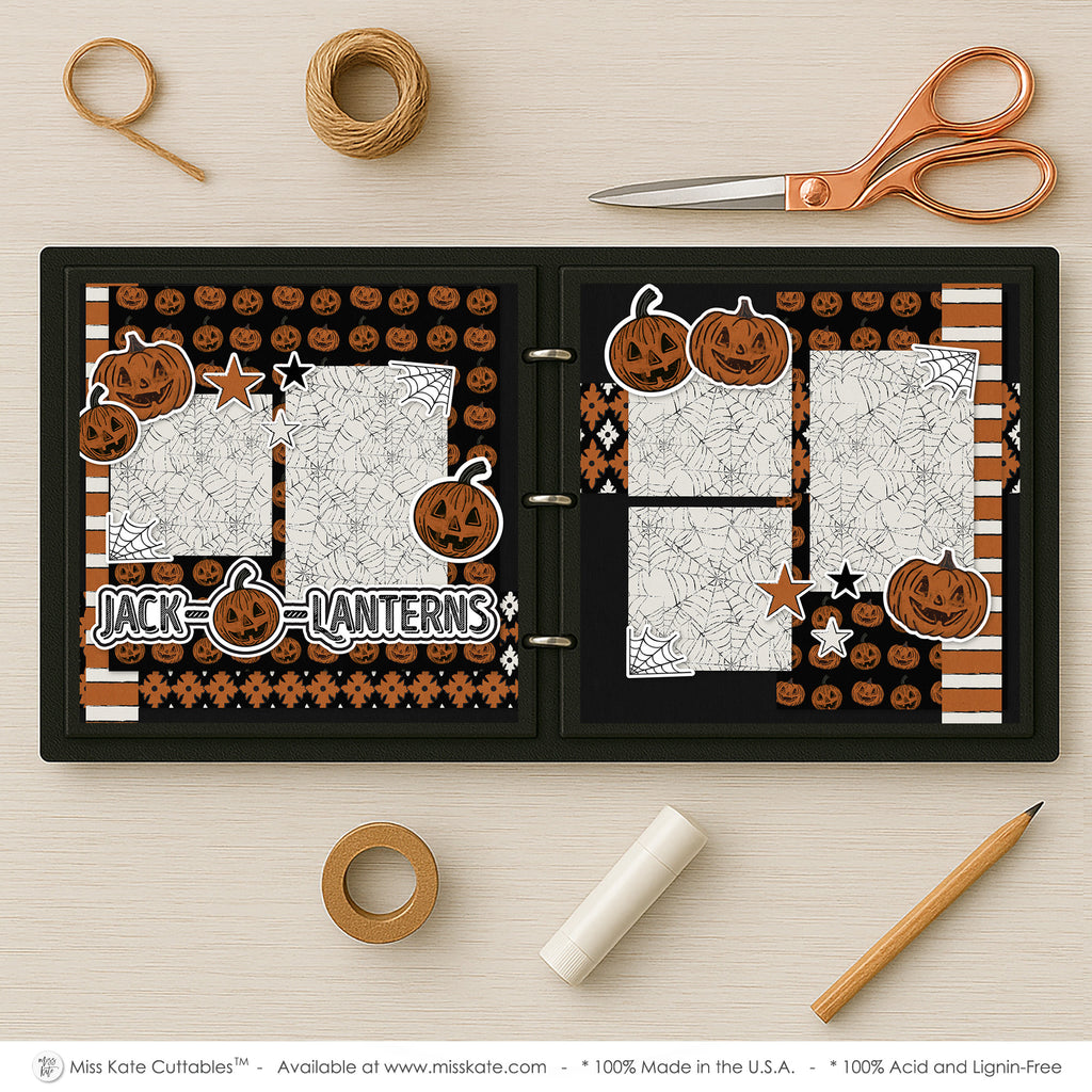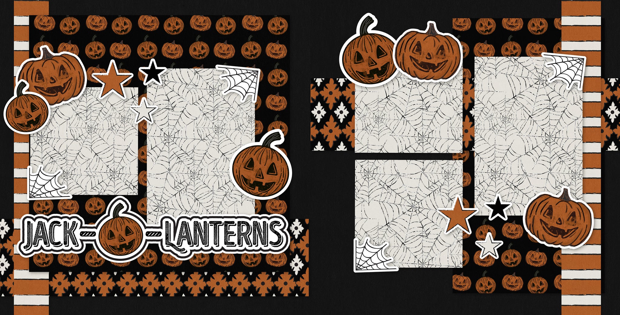 This spooky scrapbook layout titled “Jack-O-Lanterns” perfectly captures the playful spirit of Halloween night. The design features a bold black background accented with striking orange and white patterns, including pumpkins, stripes, and geometric shapes. Large illustrated jack-o-lanterns with mischievous grins are scattered throughout, paired with spider webs and stars that add a fun yet eerie vibe. The photo mats are decorated with web patterns, making them ideal frames for your favorite Halloween memories. The bold title, highlighted with a carved pumpkin in the center, ties the theme together. With its festive colors and whimsical details, this layout is perfect for showcasing pumpkin carving, trick-or-treating, or any fall festivities.