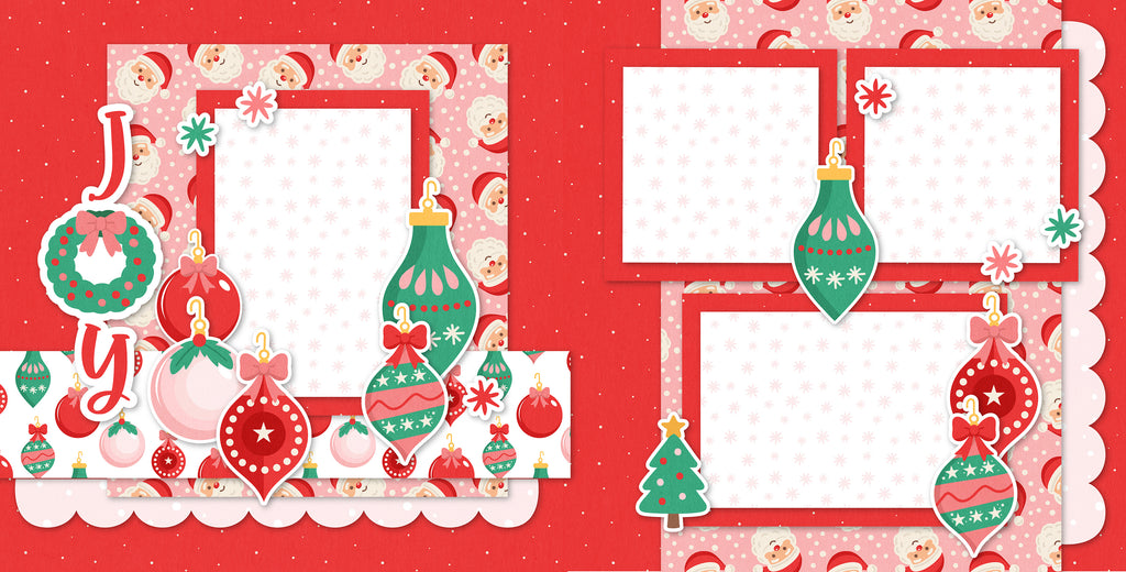 This festive Christmas scrapbook layout is bright, cheerful, and full of classic holiday charm. A vibrant red background sprinkled with tiny white dots sets a joyful tone, while soft pink Santa-patterned papers layer behind the photo mats to add a playful, nostalgic touch. On the left page, the title “Joy” is creatively built with a wreath forming the “O,” surrounded by an assortment of Christmas ornaments in shades of red, pink, and green, each decorated with bows, holly, and delicate patterns. Scalloped borders, whimsical snowflake accents, and a row of illustrated ornaments give the page a fun, decorative feel. The right page continues the theme with multiple photo spots framed in bold red, accented by dangling ornaments, tiny starbursts, and a sweet little Christmas tree near the bottom. Together, the layout feels merry, cozy, and perfectly suited for capturing treasured holiday memories.