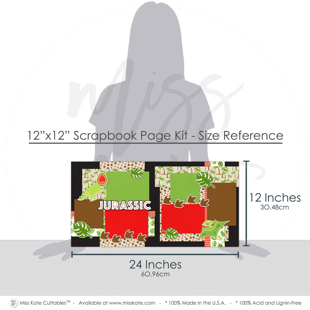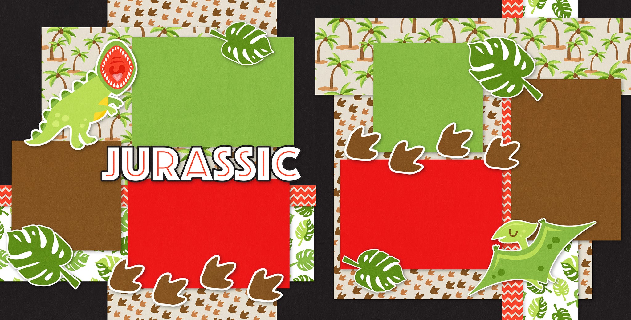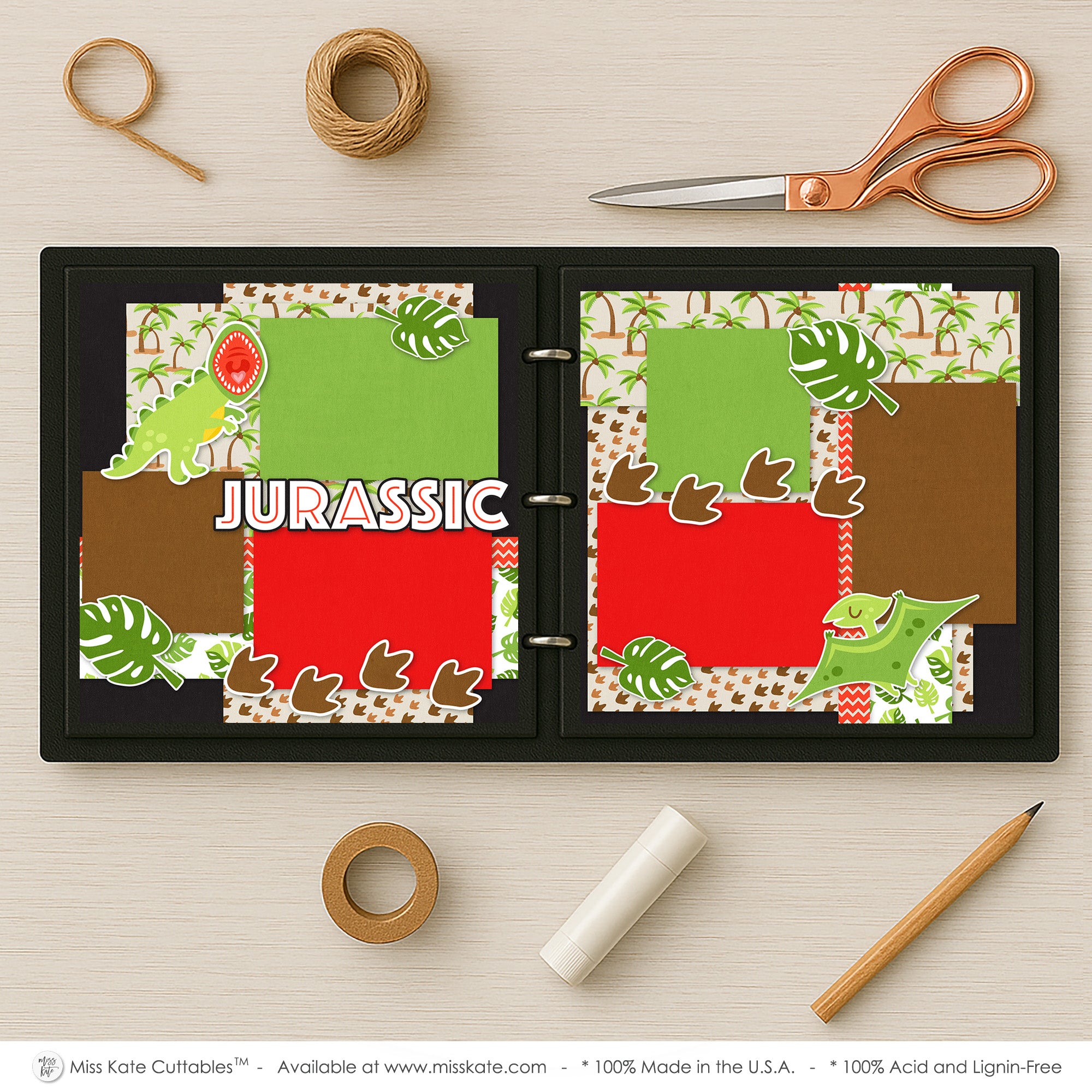 Description:Roar into memory keeping with this vibrant Jurassic scrapbook layout! Featuring bold jungle colors—leafy green, fiery red, and earthy brown—this playful 12x12 double-page spread is perfect for dino-loving kids, adventure-themed albums, or prehistoric party memories. The background pops with palm trees, chevron stripes, and dino tracks, while fun die cuts like a smiling T-Rex, flying Pterodactyl, and tropical monstera leaves bring movement and charm. Layered photo mats provide space for your favorite snapshots, from birthday parties to museum trips. Whether you're scrapping a dinosaur birthday bash or a day at the natural history museum, this layout is packed with prehistoric personality and ready to showcase your most roar-some moments. What to expect with our Page KitsWhen you open your kit, you will discover and love that all of the pattern paper designs are pre printed and completed for you! No more cutting long strips of pattern paper and gluing them together.
