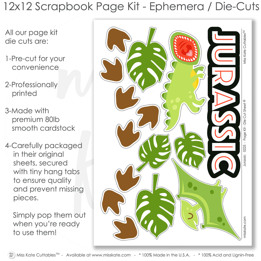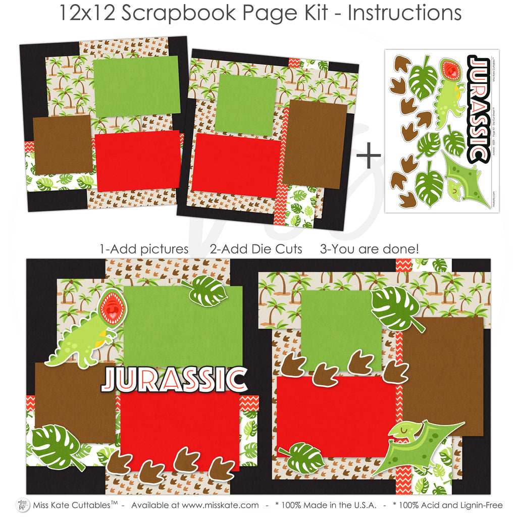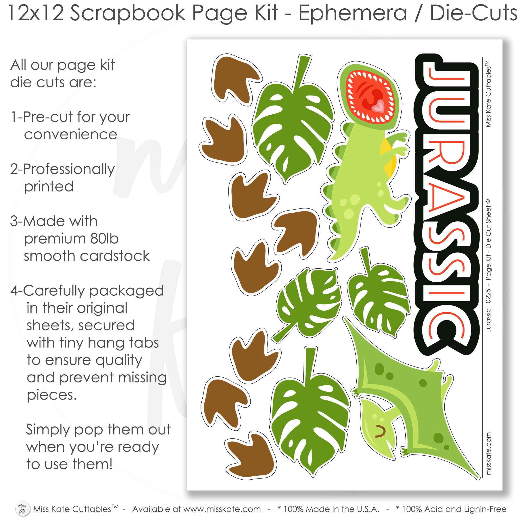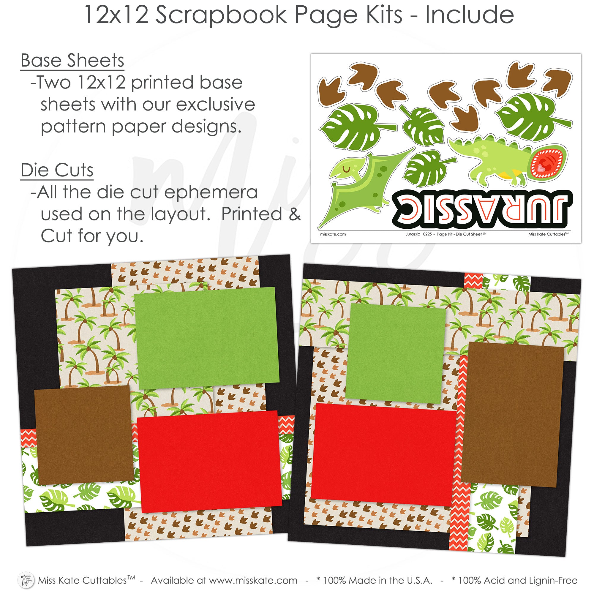 Description:Roar into memory keeping with this vibrant Jurassic scrapbook layout! Featuring bold jungle colors—leafy green, fiery red, and earthy brown—this playful 12x12 double-page spread is perfect for dino-loving kids, adventure-themed albums, or prehistoric party memories. The background pops with palm trees, chevron stripes, and dino tracks, while fun die cuts like a smiling T-Rex, flying Pterodactyl, and tropical monstera leaves bring movement and charm. Layered photo mats provide space for your favorite snapshots, from birthday parties to museum trips. Whether you're scrapping a dinosaur birthday bash or a day at the natural history museum, this layout is packed with prehistoric personality and ready to showcase your most roar-some moments. What to expect with our Page KitsWhen you open your kit, you will discover and love that all of the pattern paper designs are pre printed and completed for you! No more cutting long strips of pattern paper and gluing them together.