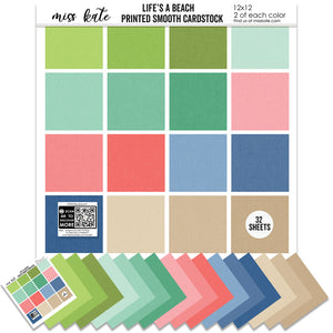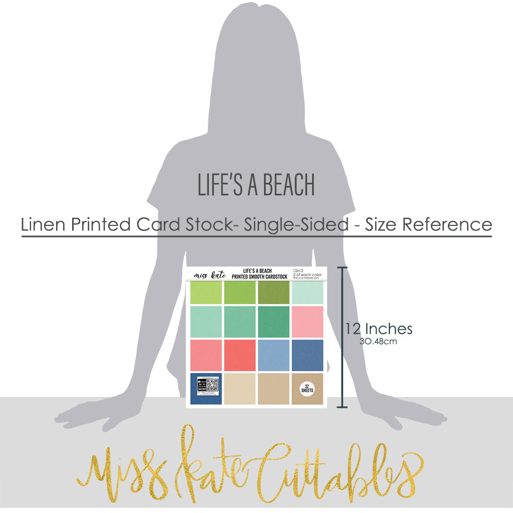 Cardstock Description Single-Sided Linen-Printed Smooth Cardstock Kate created 16 custom colors that perfectly match our Life's a Beach designs, added her exclusive Linen Pattern, and combined them for you in this 32 sheet pack. Colors Match It has NEVER been this easy to match cardstock with paper! About our Paper Our cardstock sheets provide a stiff, strong surface to work on that has a linen feel. You will find that it cuts beautifully in your Cricut, Cameo, or any other cutting machine. It is perfect for backgrounds, die cuts, photo mats, and any other crafting project. We love our Linen Printed Card Stock and think you will too! |