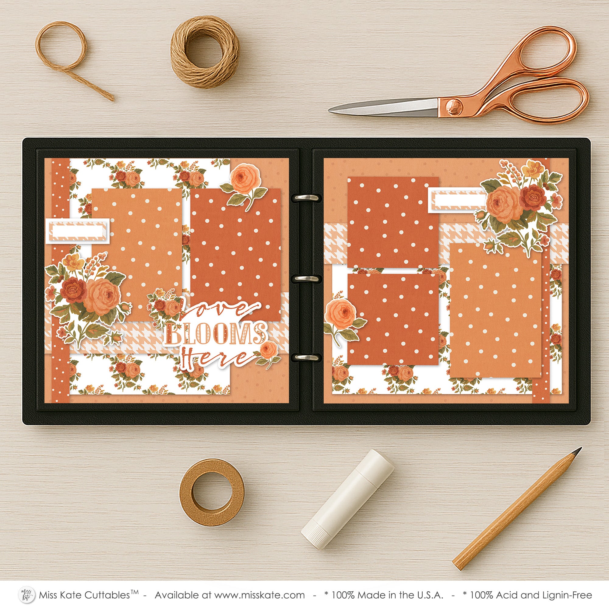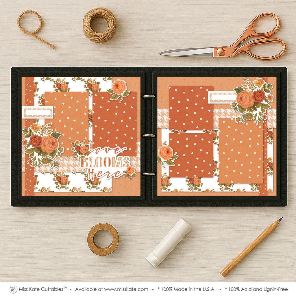 This scrapbook layout radiates warmth and romance with its soft autumn-inspired palette of peach, rust, and cream. The background features a mix of polka dot prints and houndstooth patterns, adding texture and playful charm. Beautiful floral clusters of roses in rich shades of orange, coral, and golden yellow are scattered across the pages, framing photo spaces with elegance and creating a timeless botanical theme. On the left page, the phrase “Love Blooms Here” stands out as the central sentiment, tying the design together with heartfelt meaning. Balanced arrangements of florals and patterned blocks make each photo space pop while maintaining a cohesive flow. This design is perfect for capturing love stories, seasonal memories, or any special occasion where warmth and beauty blossom.