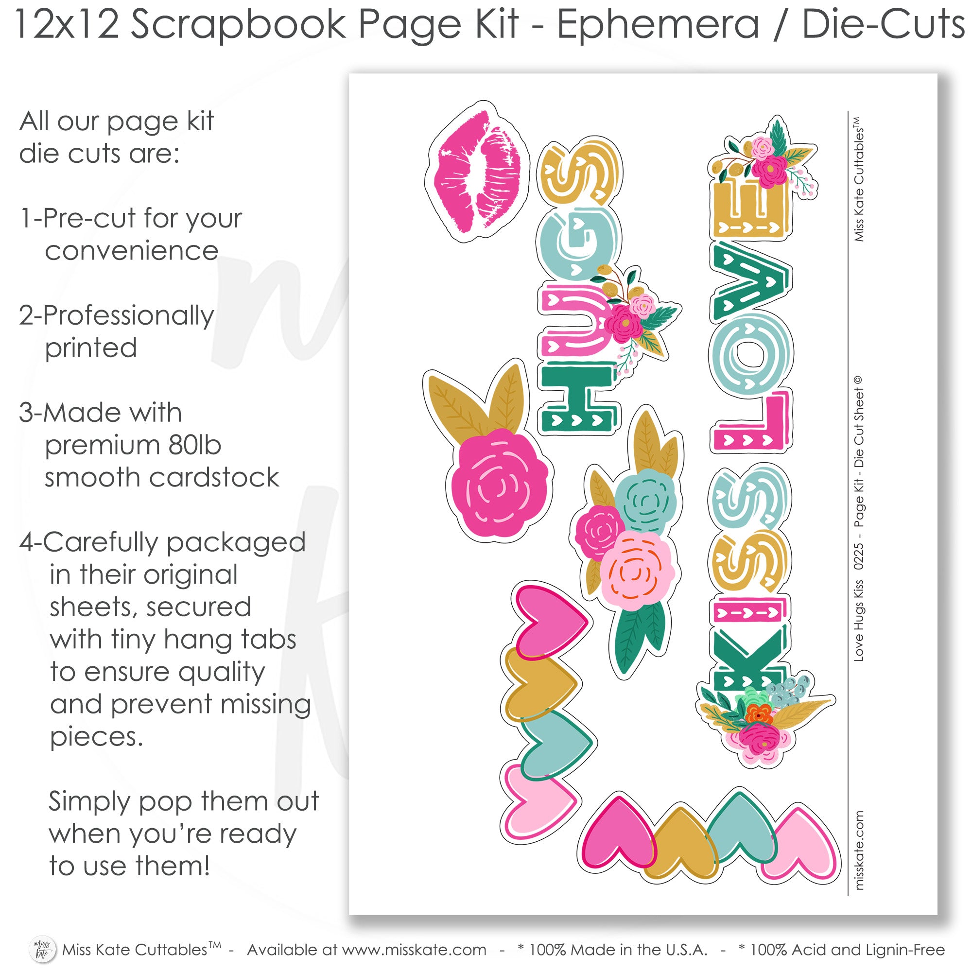 Die Cuts: All the die cuts you see on our layout picture, all cut out for you and ready to embellish your page kit!