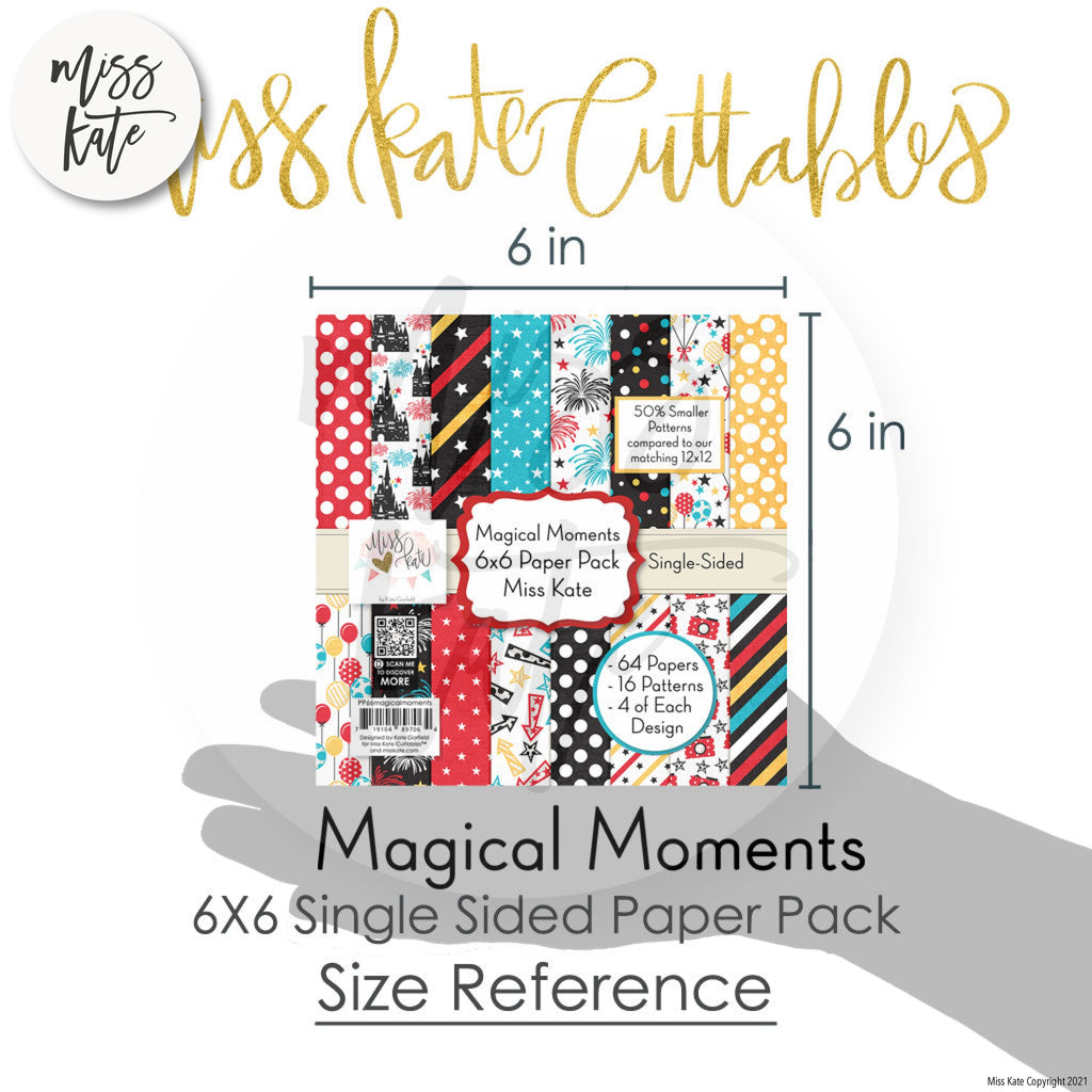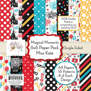 The Magical Moments paper pack has a wide variety of patterns, including polka dots, plaid, stripes, arrows, camera, balloons, fireworks, stars, Vacation, Castle, Princess, Amusement Park, and Theme Park. THEME: Works with Walt Disney World, Disneyland, Disney Cruise, Mickey Mouse, Donald Duck, Minnie, Goofy, Pluto, Amusement Park and Theme Parks.