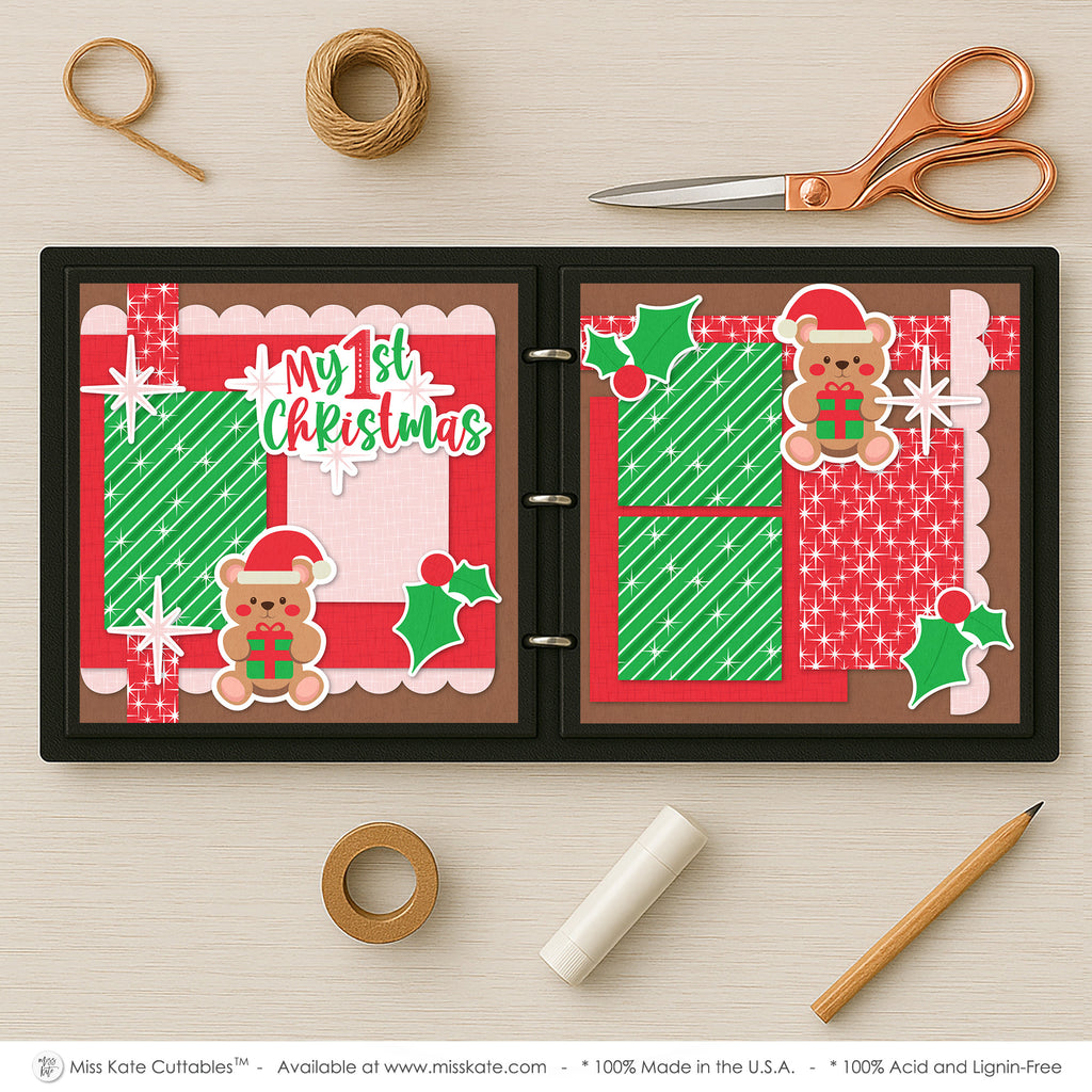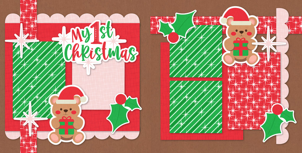 This adorable “My 1st Christmas” scrapbook layout brings sweet holiday magic to life with its cheerful mix of red, green, and soft pink patterns. The left page features a bold title framed by sparkling starbursts, layered over cozy textured papers and candy-striped accents. A darling teddy bear in a Santa hat sits below, holding a festive present and adding an irresistible touch of whimsy. On the right page, matching patterns tie the layout together, with holly clusters and shimmering stars bringing brightness to each photo mat. Another cute teddy bear sits atop the page, creating the perfect finishing touch. Warm, playful, and full of charm, this layout captures the wonder of a baby’s very first Christmas.