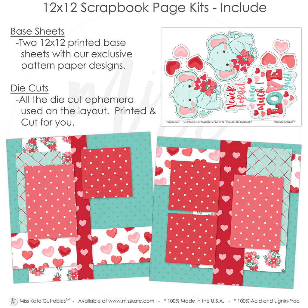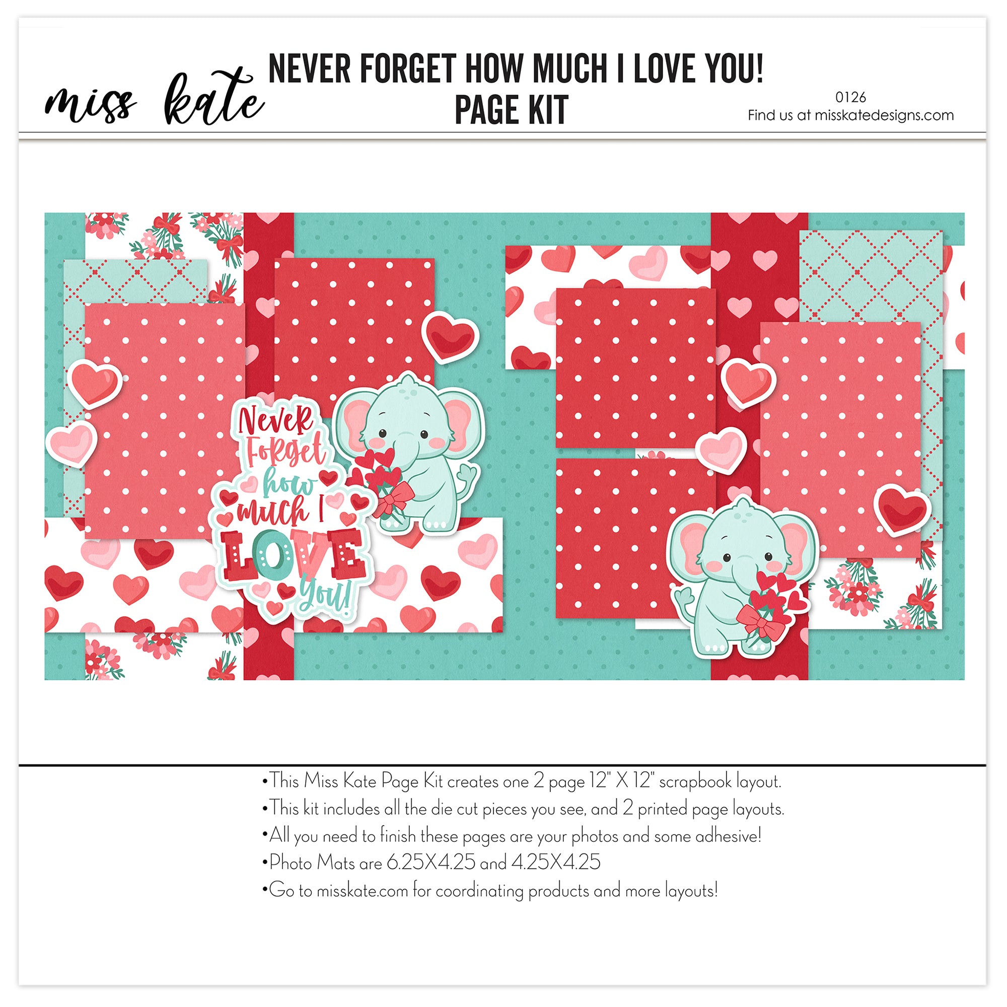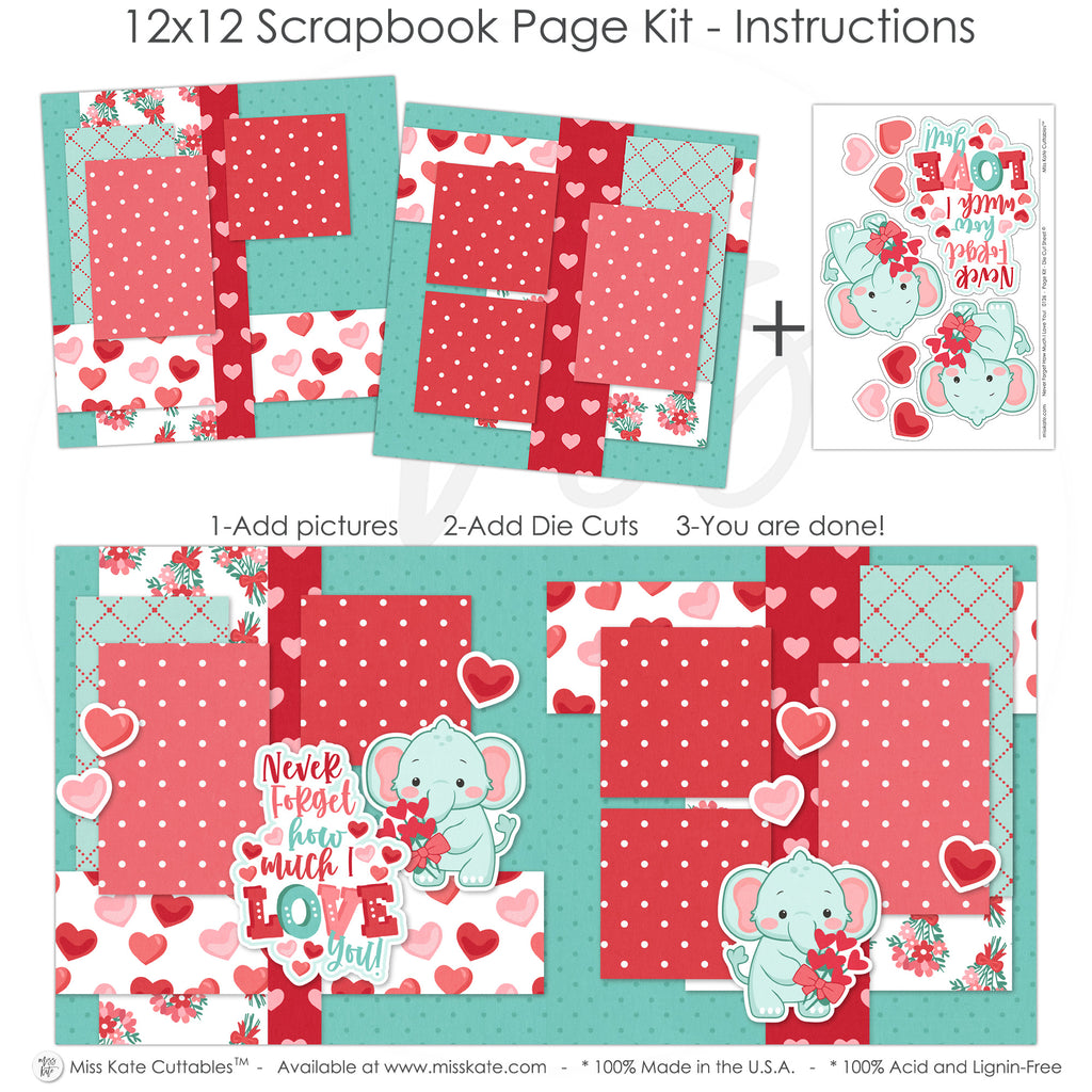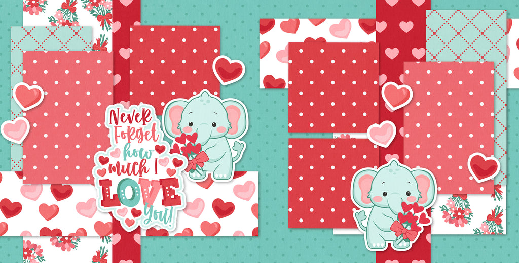 This sweet Valentine-themed scrapbook layout features an adorable elephant motif paired with a soft, romantic color palette of red, blush pink, and minty teal. Layered background papers with polka dots, hearts, and subtle floral accents create depth while keeping the design playful and cohesive. Multiple photo mats are arranged in clean, balanced groupings on each page, framed by vertical strips of heart-patterned paper that guide the eye across the spread. Cute elephant illustrations holding heart-shaped flowers add a whimsical, affectionate touch, while scattered heart embellishments bring movement and charm. The heartfelt title, “Never Forget How Much I Love You,” anchors the layout and perfectly captures the loving, sentimental mood, making this design ideal for documenting special Valentine memories or cherished moments with someone dear.