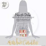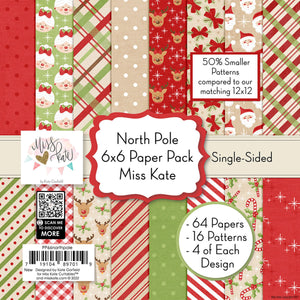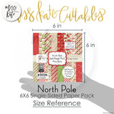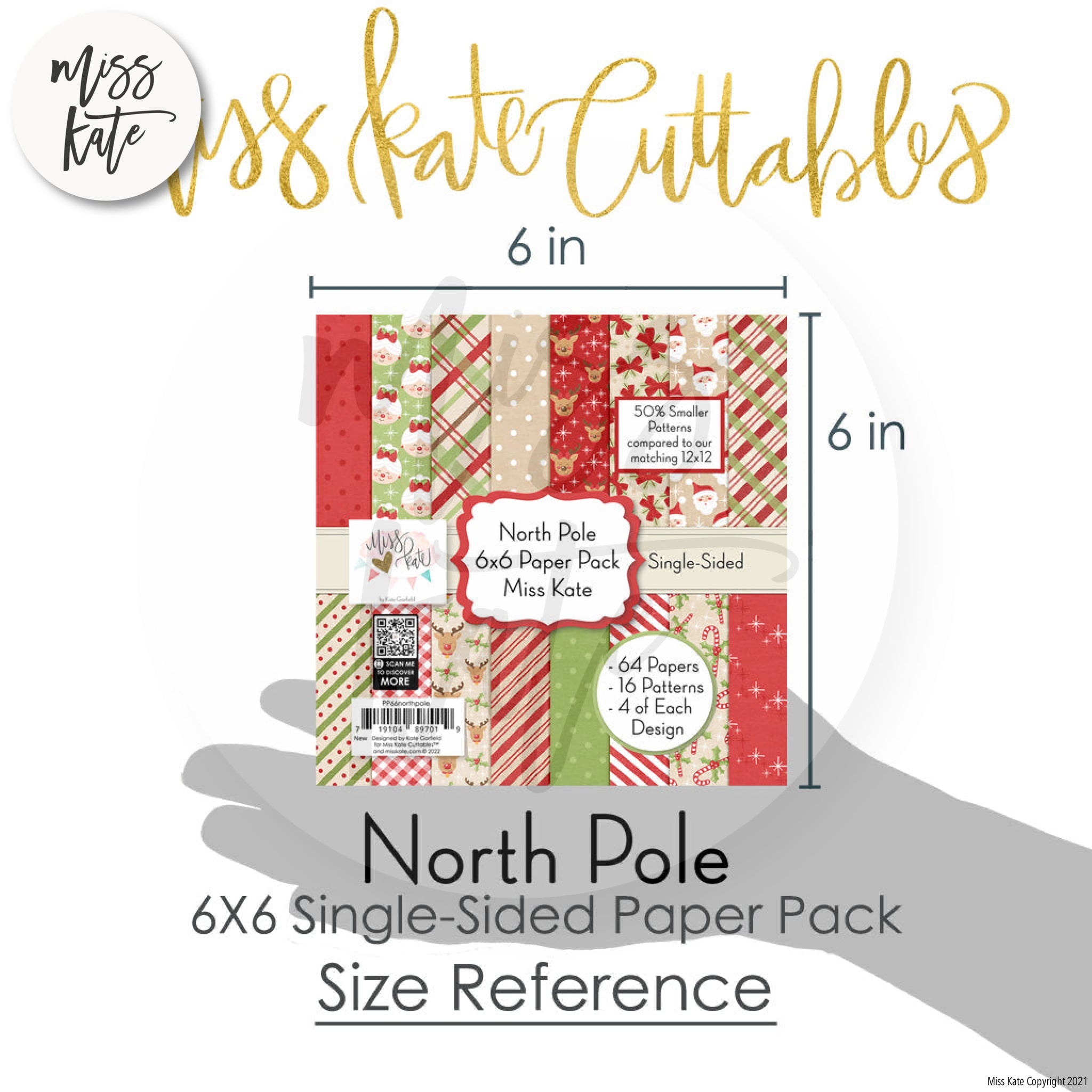 The North Pole paper pack has a wide variety of Patterns including Polka Dots, Stripes, Stars, Plaid, Holly Berry, Stars, Reindeer, Snowflakes, Claus, Santa Claus, Rudolph, Candy Cane Red, Green Tan. Christmas Holiday December Theme