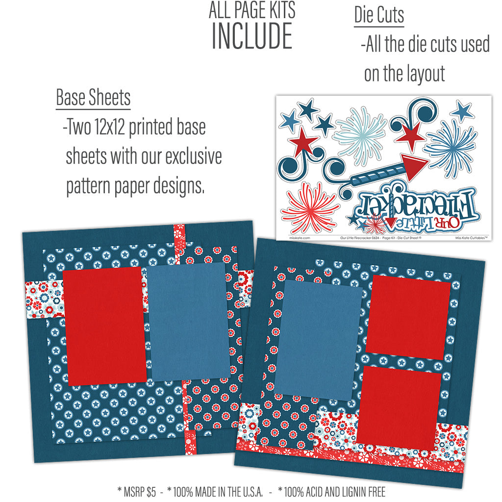 About our Page Kits Our Page Kits include proprietary Miss Kate Pattern Paper and Miss Kate Die Cuts. The cover page features full-color high-resolution pictures of the assembled layouts. Die cuts are left in the sheet and ready for you to easily pop out, this allows you to see them all spread out and helps prevent any accidental loss. These page kits are adorable, easy to do, and at such a great price! We love our Page Kits and think you will too! |