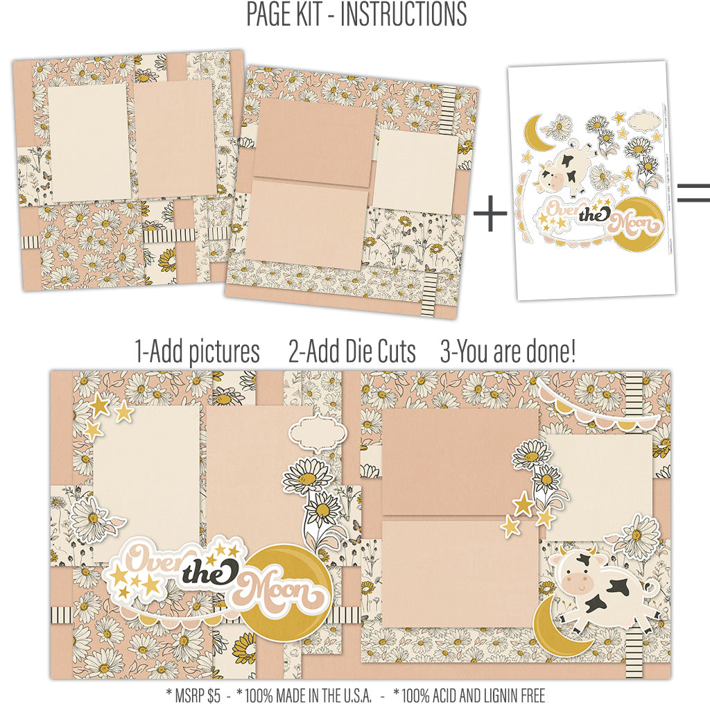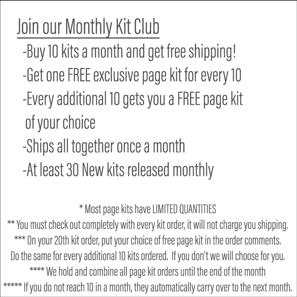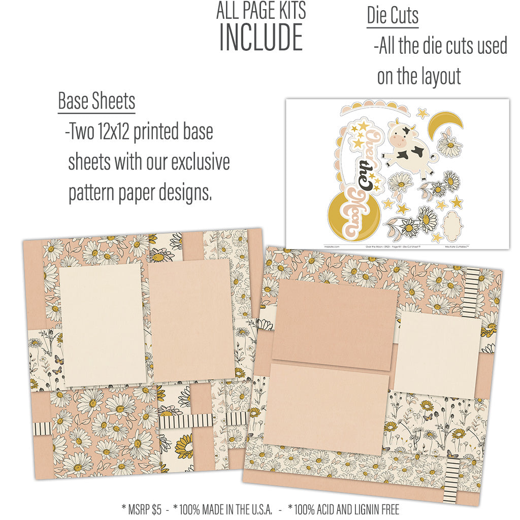 About our Page Kits Our Page Kits include proprietary Miss Kate Pattern Paper and Miss Kate Die Cuts. The cover page features full-color high-resolution pictures of the assembled layouts. Die cuts are left in the sheet and ready for you to easily pop out, this allows you to see them all spread out and helps prevent any accidental loss. These page kits are adorable, easy to do, and at such a great price! We love our Page Kits and think you will too! |