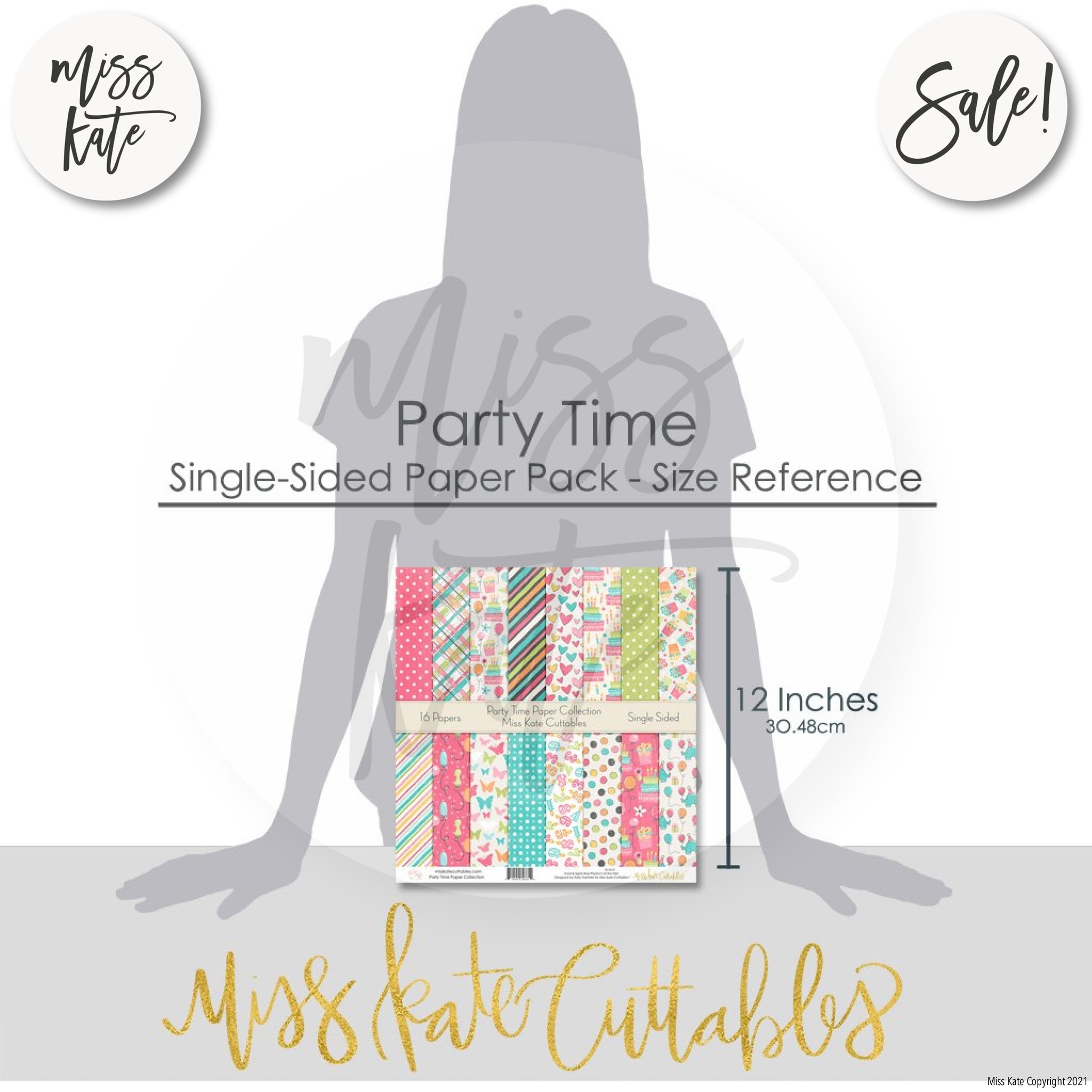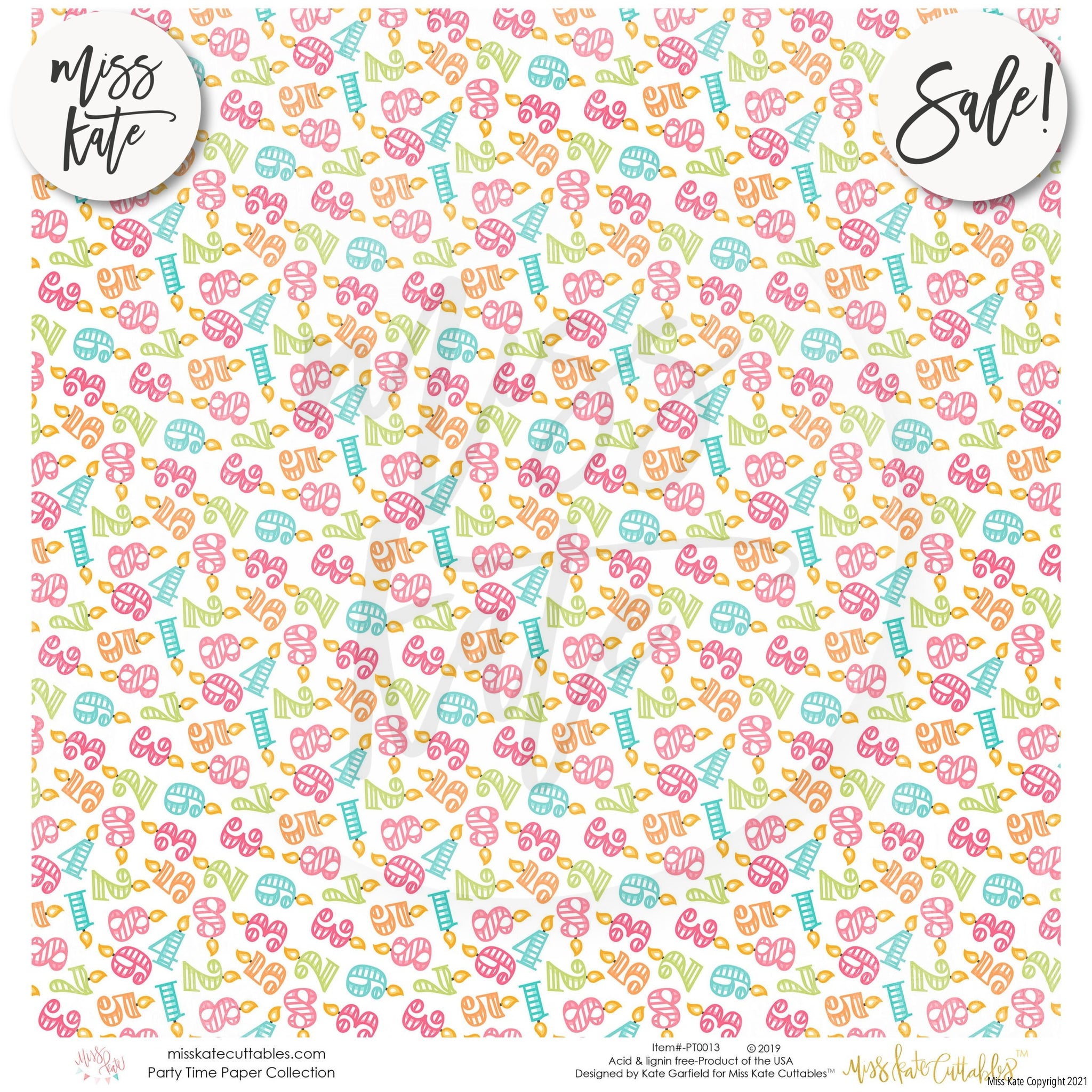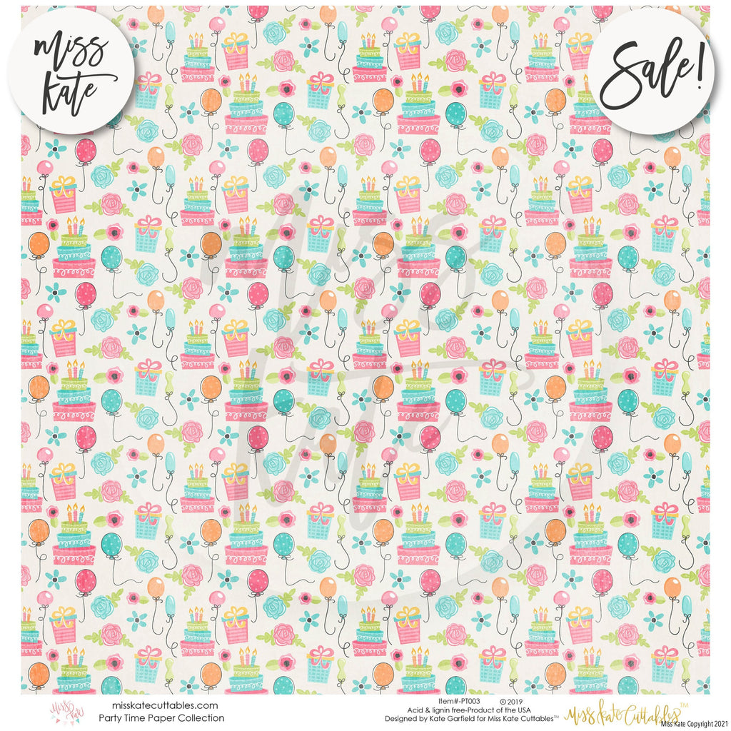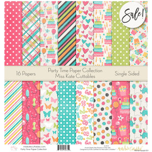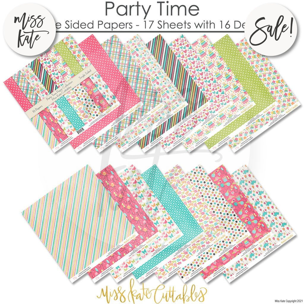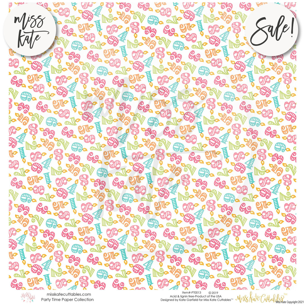 The Party Time Paper Pack has a wide variety of Patterns including Polka Dots, Stripes, Plaid, Balloons, Hearts, Flowers, Butterflies, Confetti, Birthday Cake, Presents, Number Candles, Party Hats, Wrapping Paper, First Birthday, 1 Year Old, Red, White, Pink, Orange, Green, Cream, and Blue. Kids Party Celebrate Theme