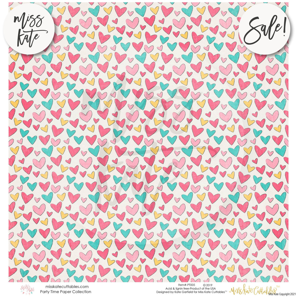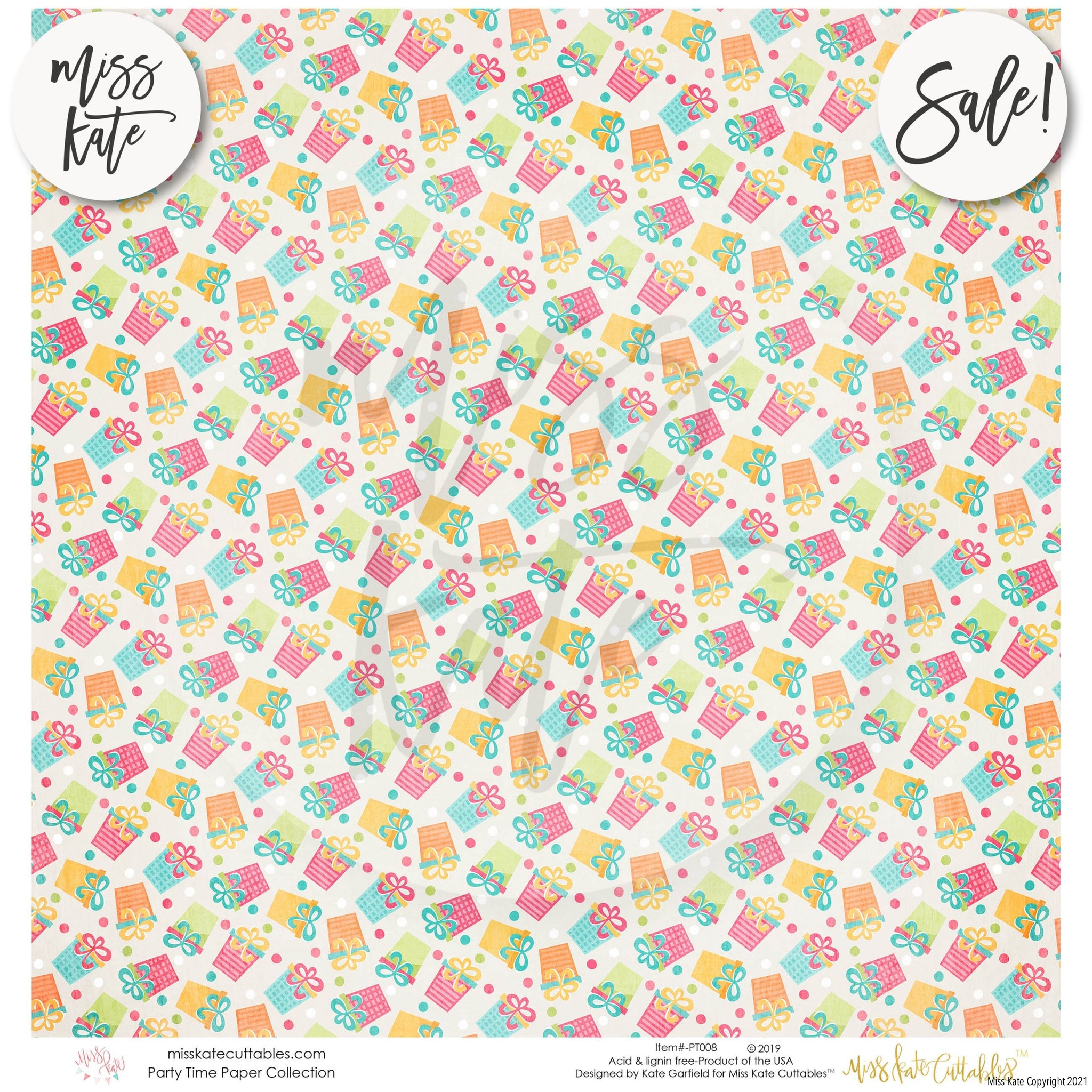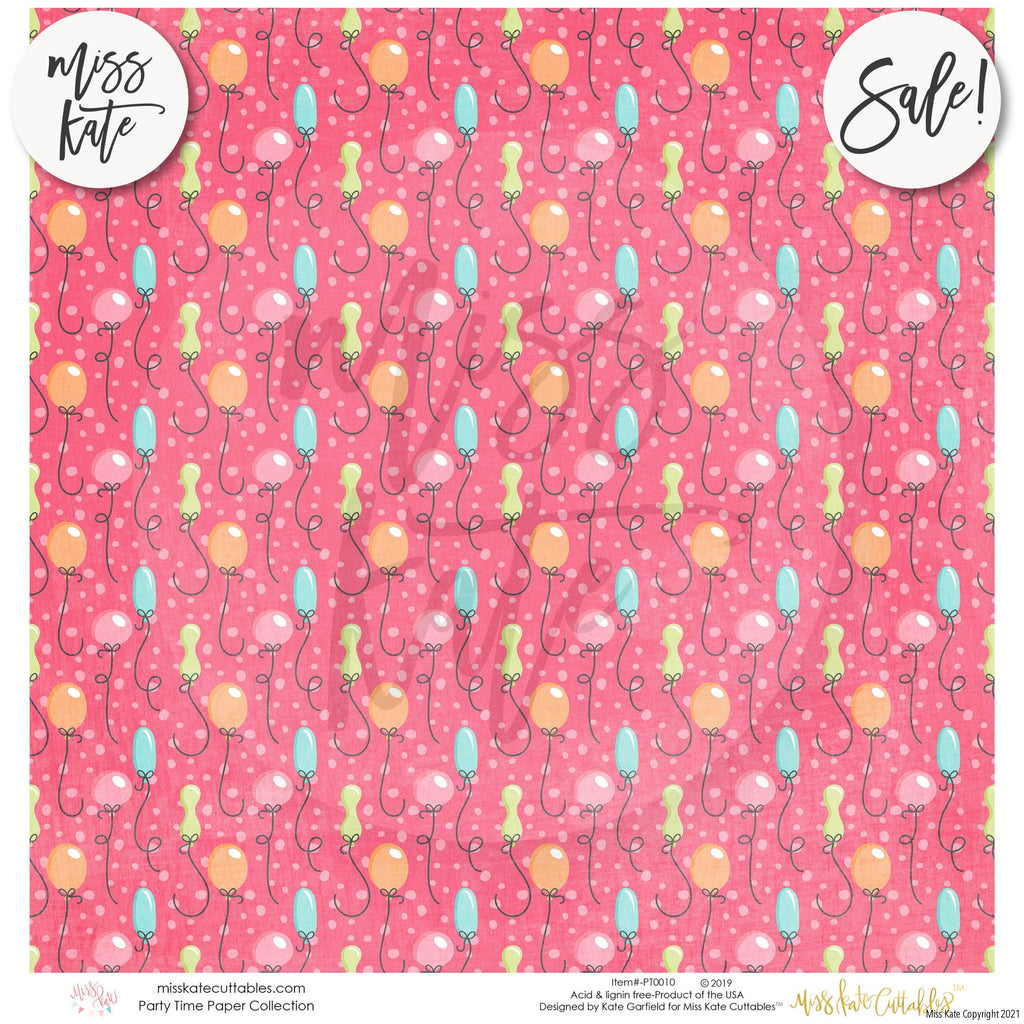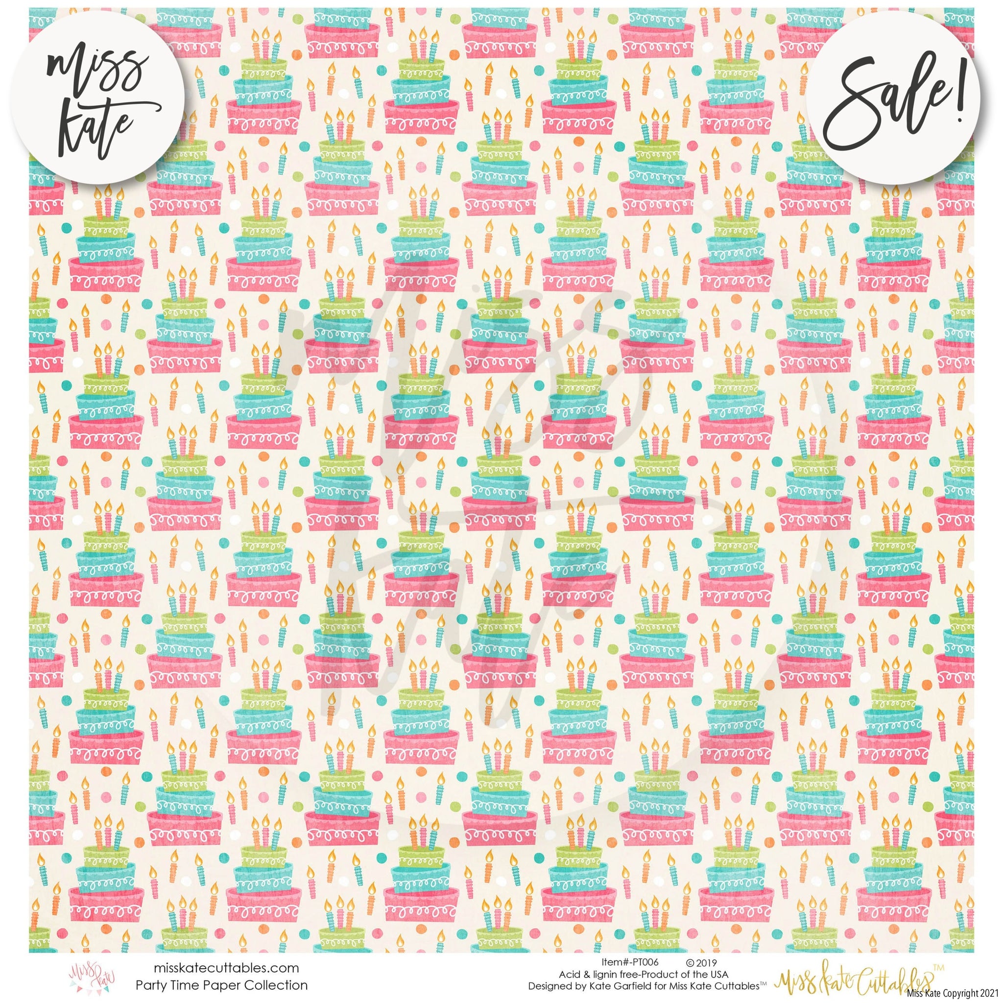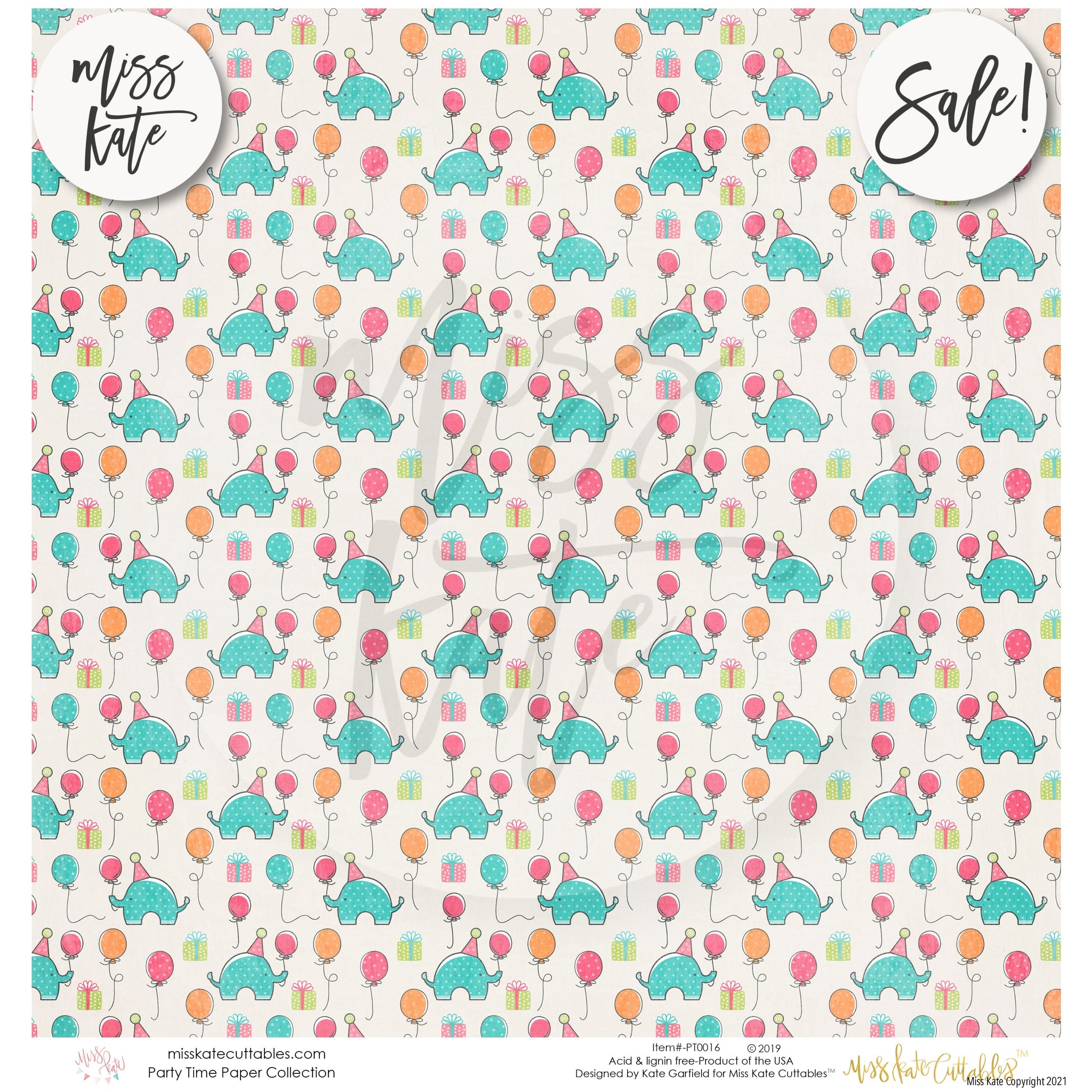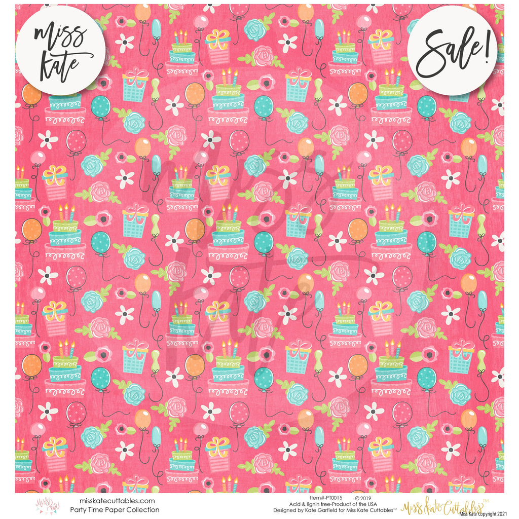 The Party Time Paper Pack has a wide variety of Patterns including Polka Dots, Stripes, Plaid, Balloons, Hearts, Flowers, Butterflies, Confetti, Birthday Cake, Presents, Number Candles, Party Hats, Wrapping Paper, First Birthday, 1 Year Old, Red, White, Pink, Orange, Green, Cream, and Blue. Kids Party Celebrate Theme