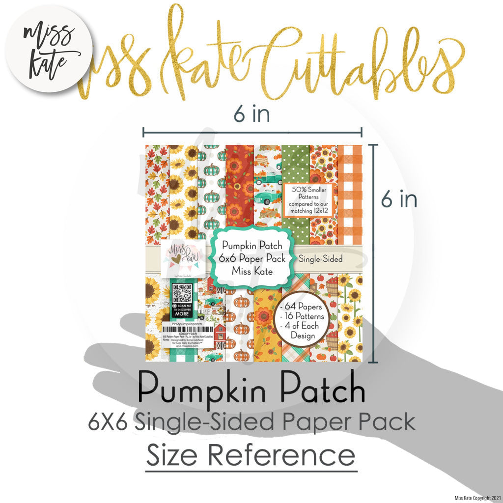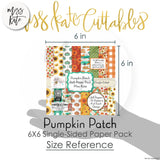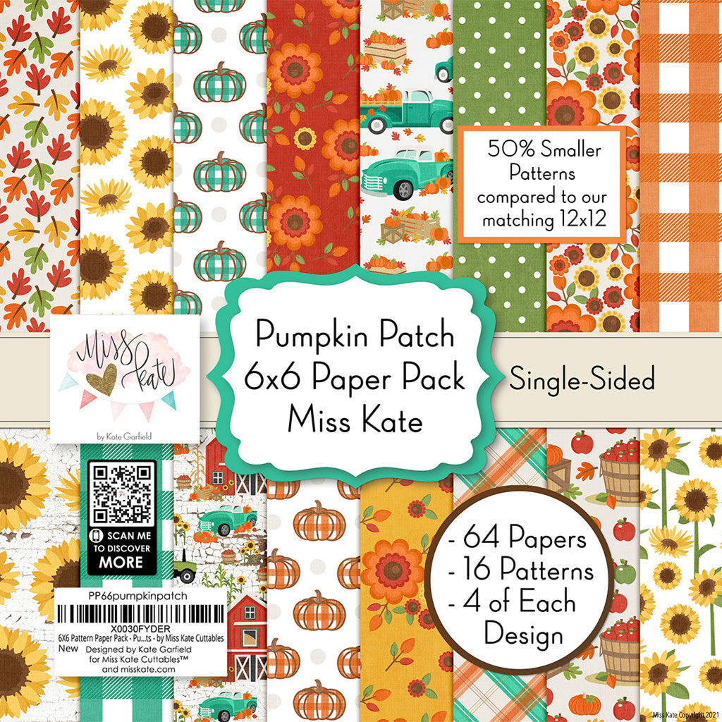 The 6X6 Single-Sided Paper Pack - Pumpkin Patch - has a variety of patterns: Sun Flowers, Plaid Pumpkins, Bushels of Apples, Plaids, Leaves, Barns with Tractors, Polka Dots, Hounds Tooth.