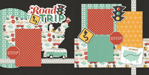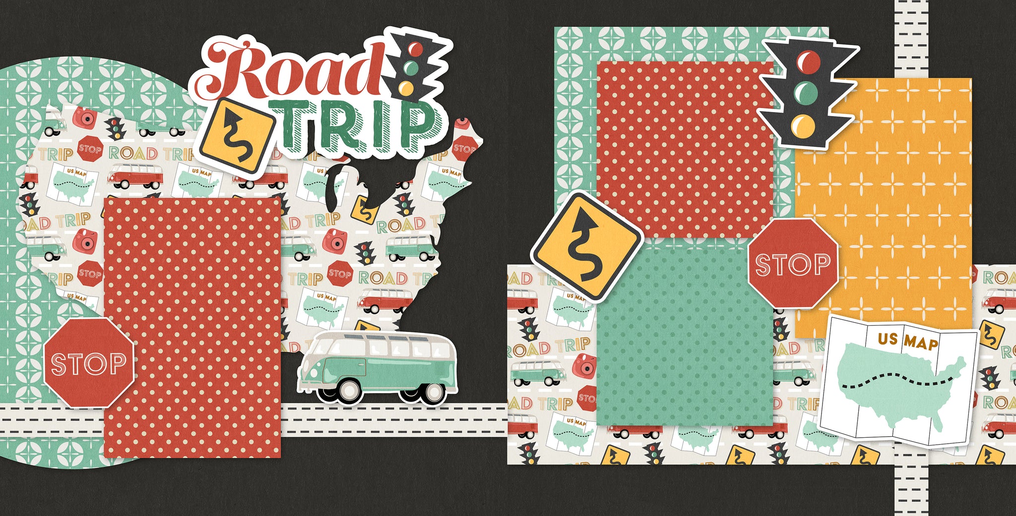 Description:This scrapbook layout is a fun and vibrant "Road Trip" themed 12x24-inch double-page spread, perfect for documenting a family vacation, summer adventure, or cross-country drive. It’s packed with travel-inspired motifs and bold retro colors.