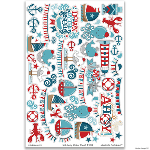 The Sail Away Sticker Sheet has a variety of shapes: "Down by the Sea" "At the Sea" "Ahoy" Titles, Lighthouse Whale Anchor Star Octopus Sail Boat Ship Banner Seagull Bird Water Lobster Life Preserver Wave
