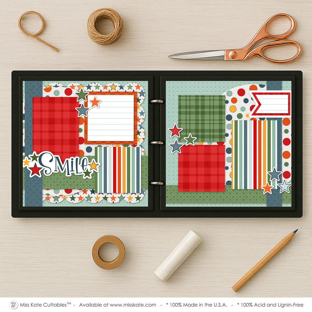 The right page mirrors the energetic feel with additional plaid and striped photo mats arranged in a balanced grid. A bold striped vertical mat stands out against the playful polka-dot and patterned layers behind it. Star die-cuts are scattered throughout both pages, tying the theme together and adding dimension with white sticker-like outlines. A small banner journaling spot in the upper right offers space for notes or a date. The overall design feels lively, fun, and slightly rustic, perfect for capturing happy everyday moments or baby's first smile!