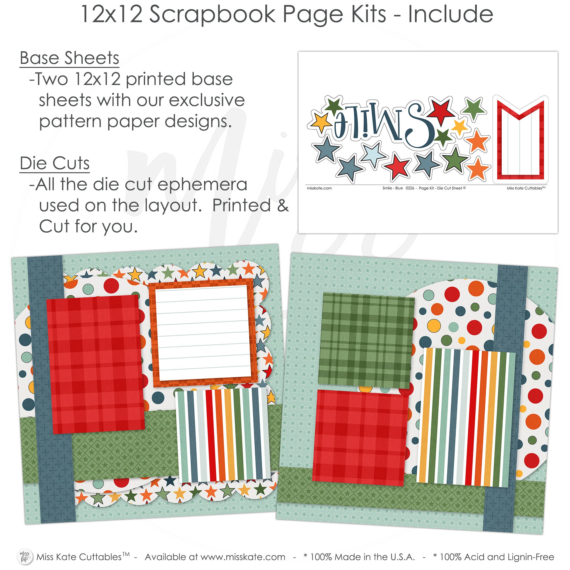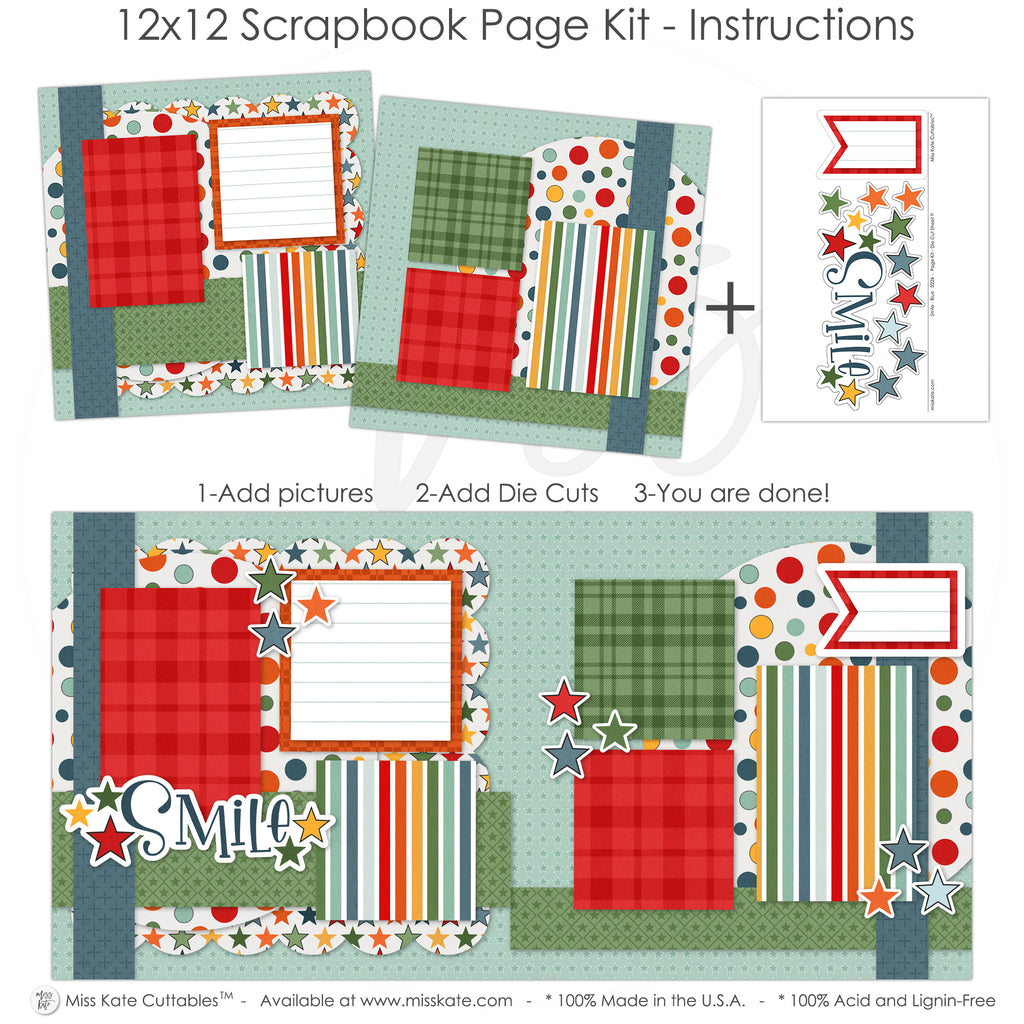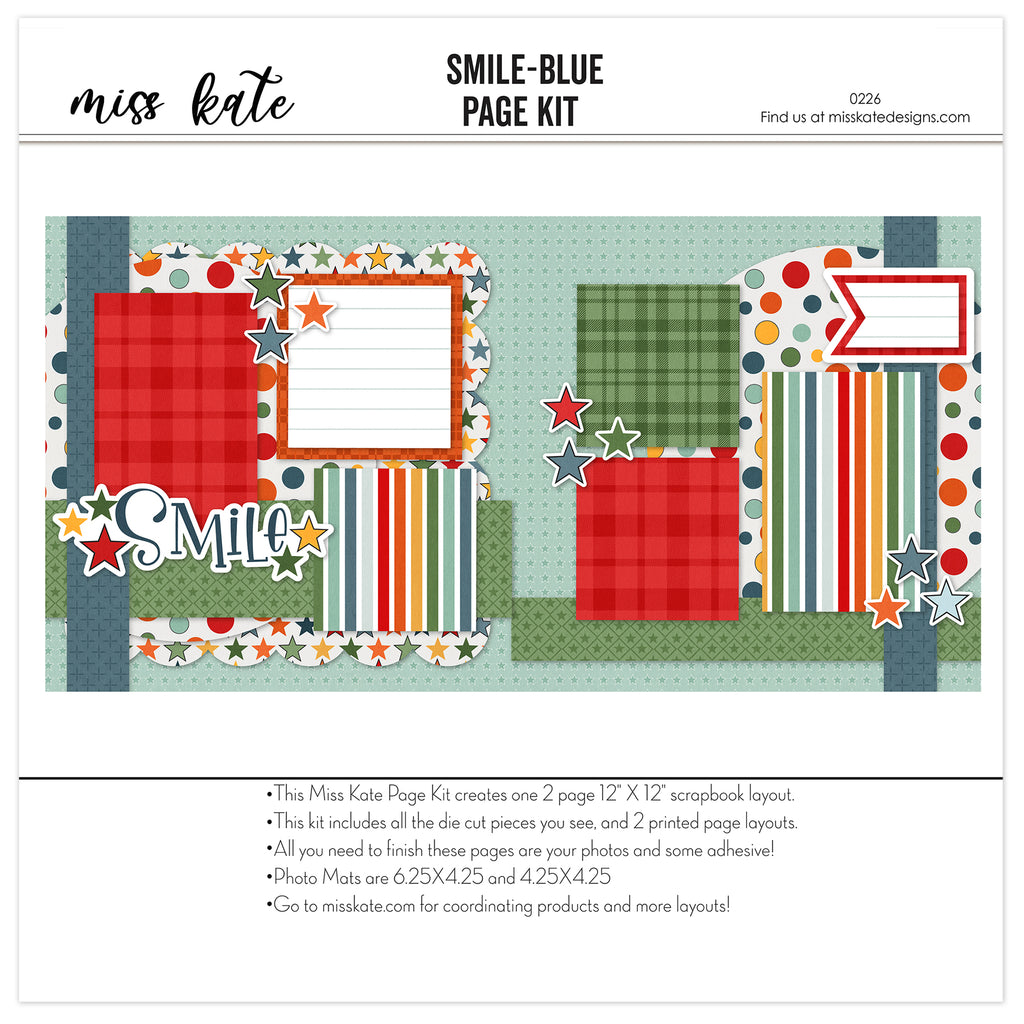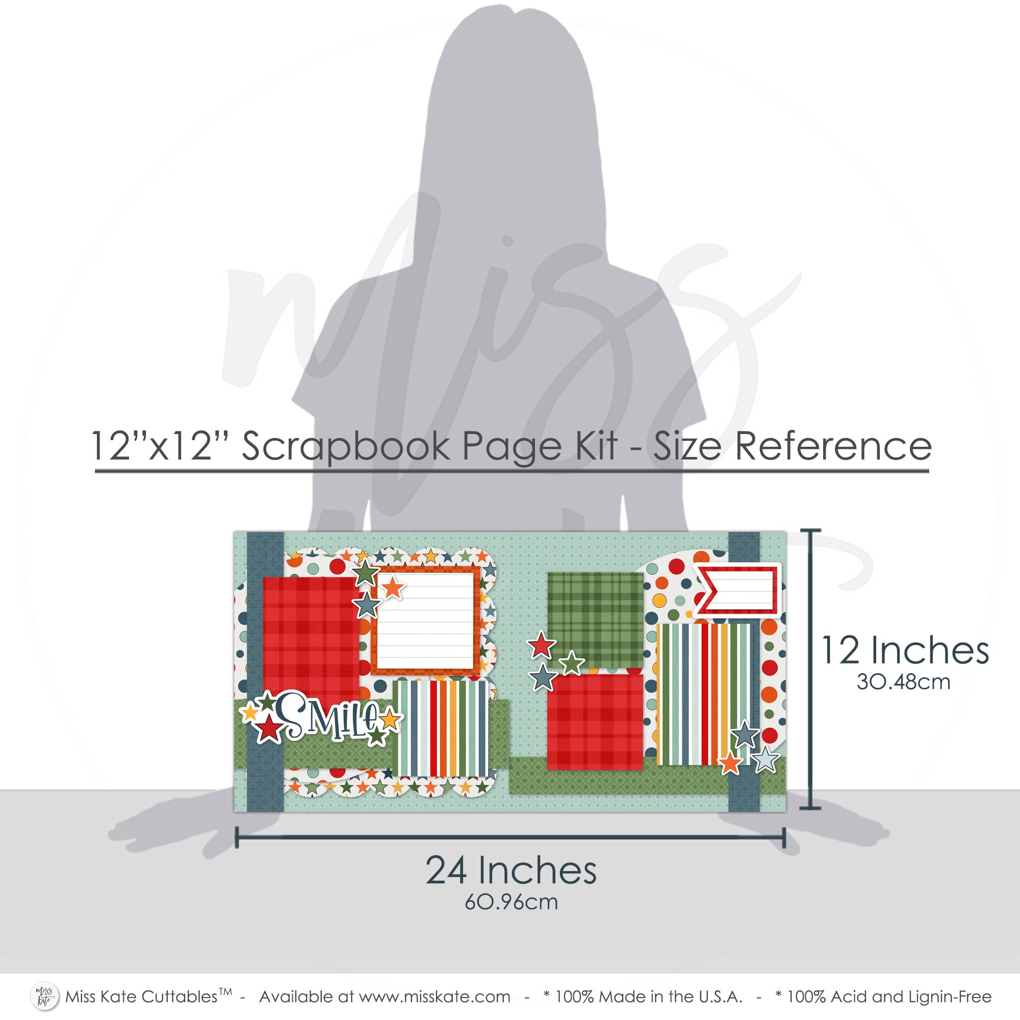 This bright and playful two-page scrapbook layout features a bold mix of red, green, teal, mustard, and navy set against a soft teal background patterned with tiny white stars. The design is packed with layered textures, including red buffalo plaid, green plaid, colorful polka dots, and multicolored vertical stripes. On the left page, a large red plaid photo mat anchors the layout, layered over scalloped star-print paper and a striped journaling card framed in orange. A cheerful “Smile” title sits across a green patterned strip, accented with layered star embellishments in coordinating colors.