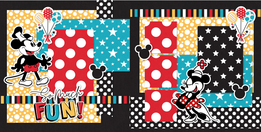 This cheerful two-page layout celebrates the magic of Disney! With Mickey and Minnie in their original 1928 form, to the balloons and Mickey heads, all the die cuts are adorable. The title "So Much Fun" is on the left side of the layout which captures the enjoyment and FUN you experience at Disney! Use this cute layout for your next theme park adventure!