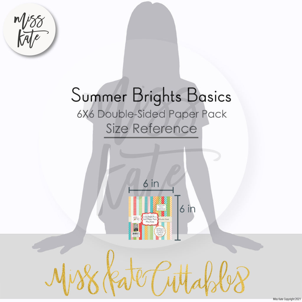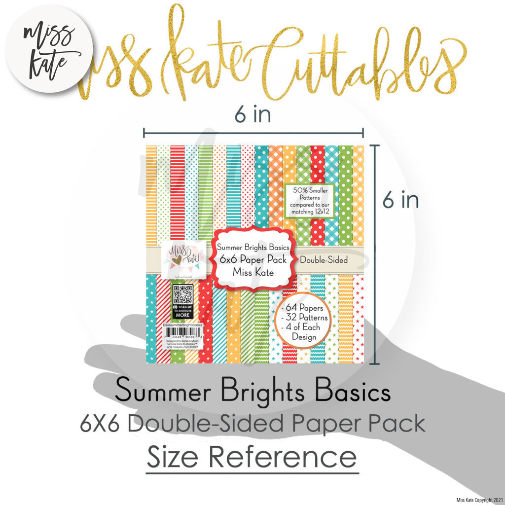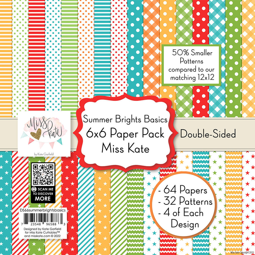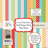 The Summer Brights Basics Paper Pack features designs include polka dots, plaid, stripes.
