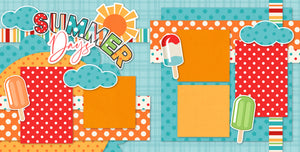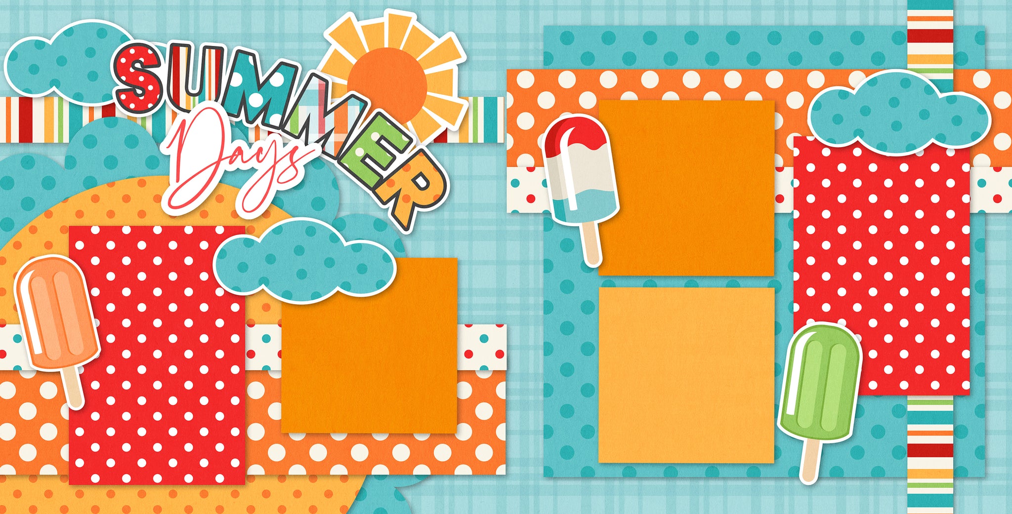 Description:This vibrant scrapbook layout, titled "Summer Days," captures the playful and sunny spirit of summertime. The design features a cheerful mix of bright colors, including red, orange, turquoise, and yellow, enhanced by polka dots and multicolored stripes that add energy and charm. The title "Summer Days" is prominently displayed with bold lettering, accented by a stylized sun and fluffy blue clouds. Scattered throughout the layout are whimsical popsicle illustrations in orange, red-white-blue, and green, reinforcing the fun, nostalgic theme of summer treats. The layout includes five photo frames. Overall, this scrapbook layout is perfect for preserving joyful summer memories such as beach days, family picnics, or playful moments in the sunshine. |