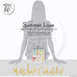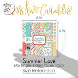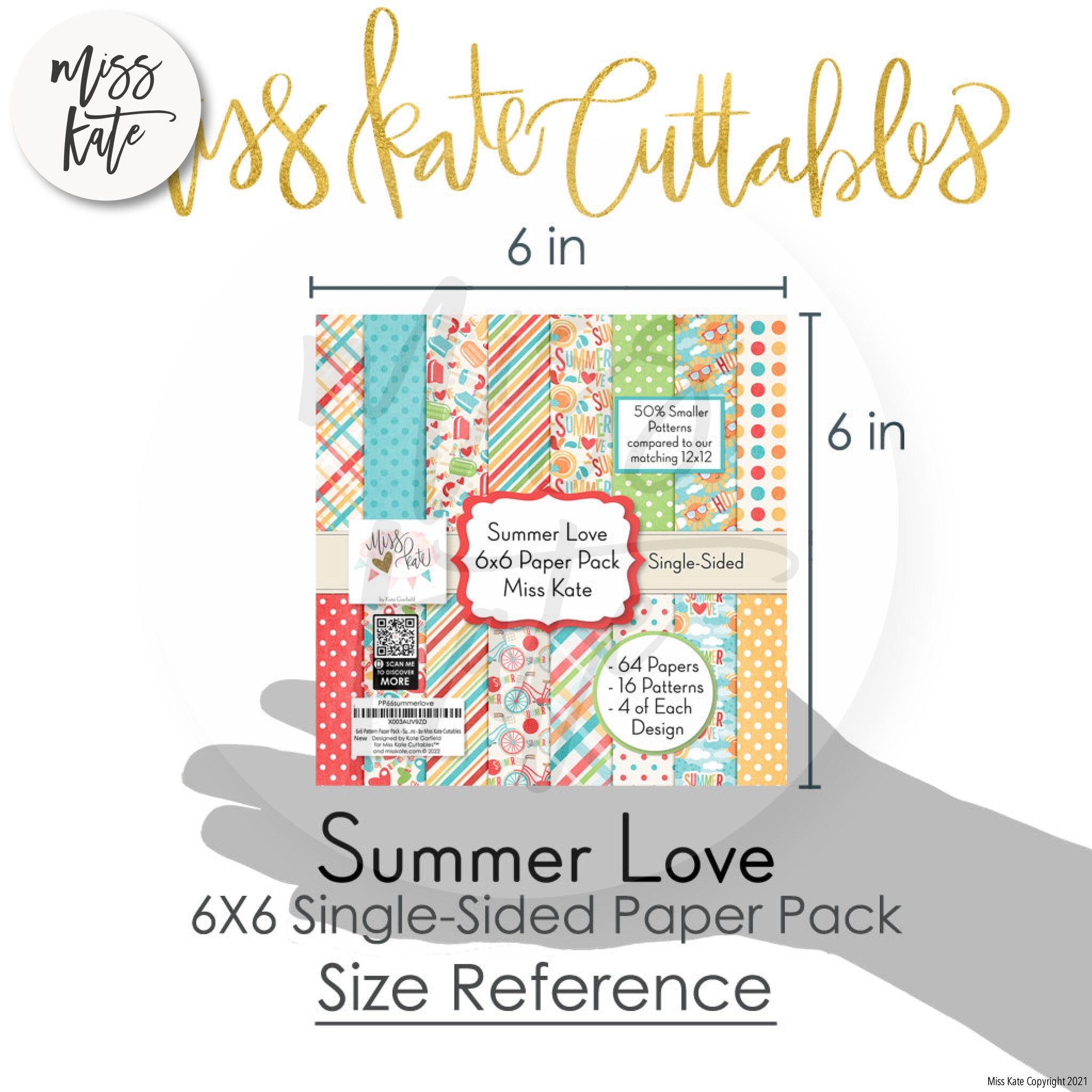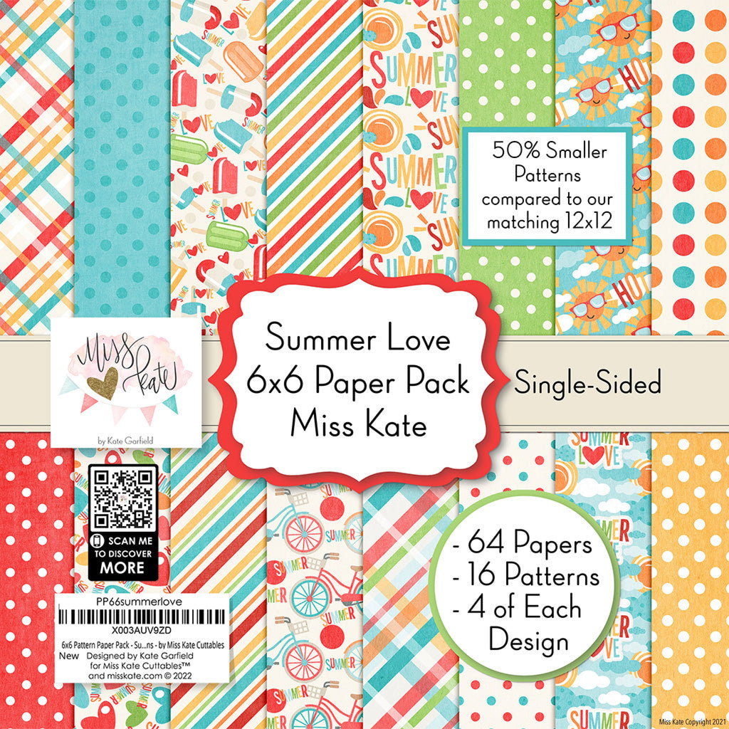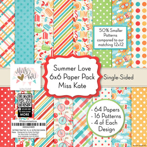 The Summer Love paper pack has a wide variety of Patterns including Polka Dots, Stripes, Plaid, Sun, Water, Splashes, Pool Tube, Floaty, Popsicles, Watermelon, Sunglasses, Bicycle, Banners, Umbrella, Beach Balls, Red, Orange, Yellow, Blue, Green, and White. Theme Vacation Summertime Season
