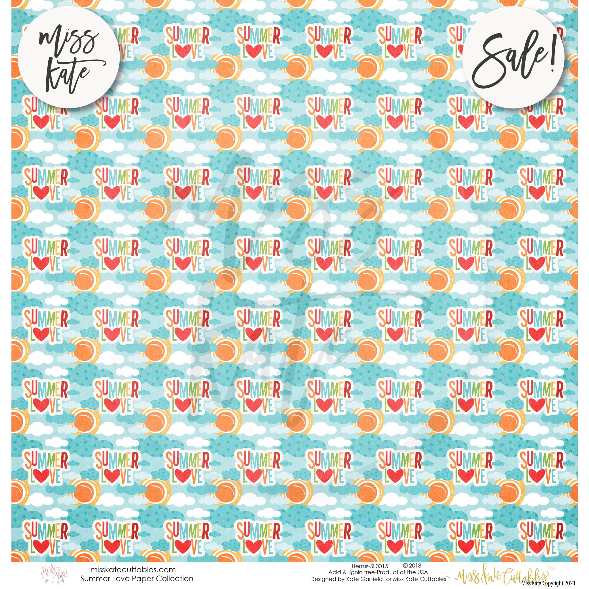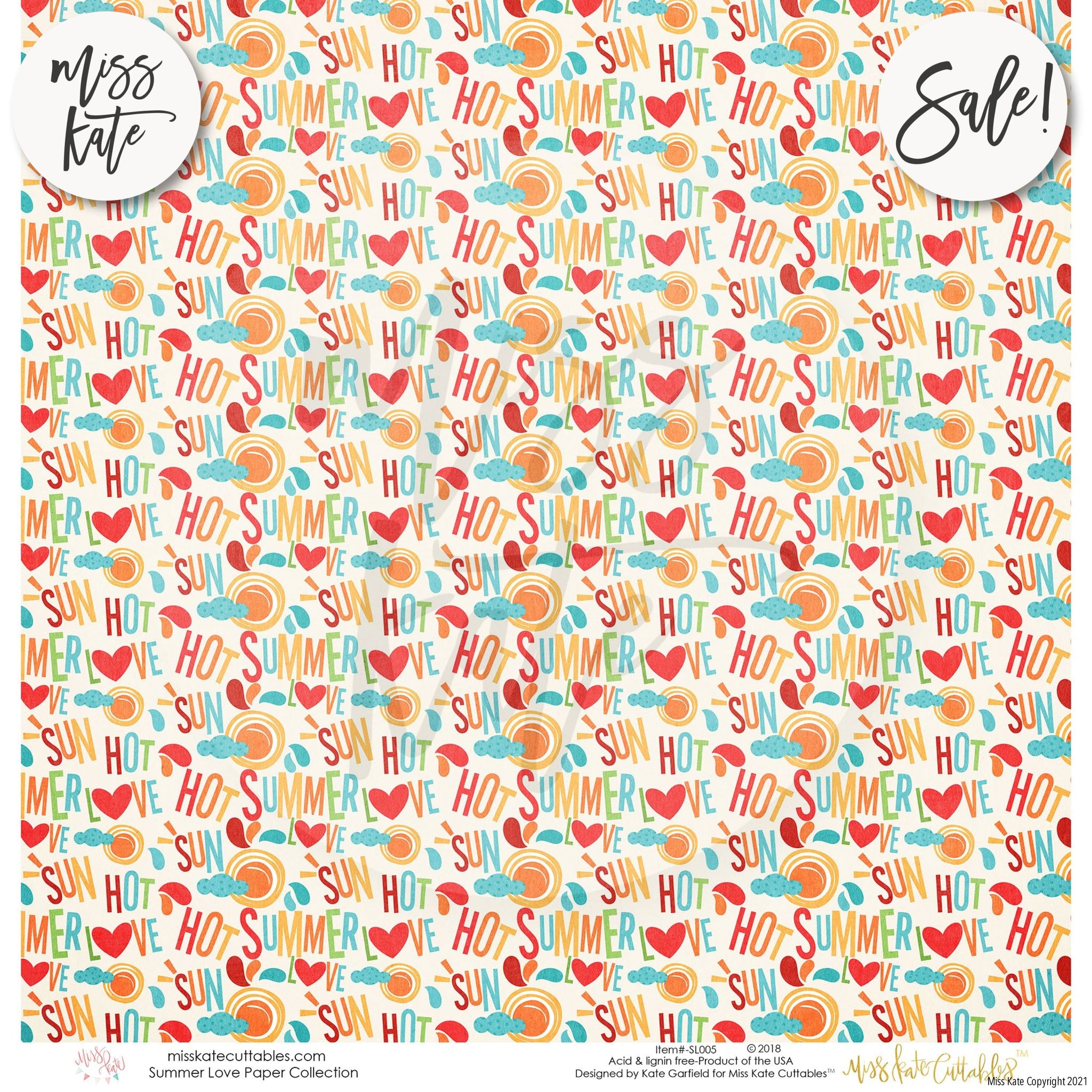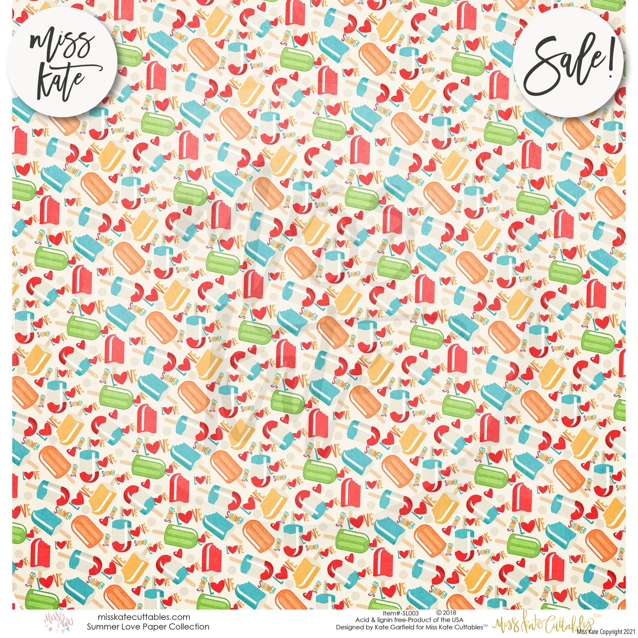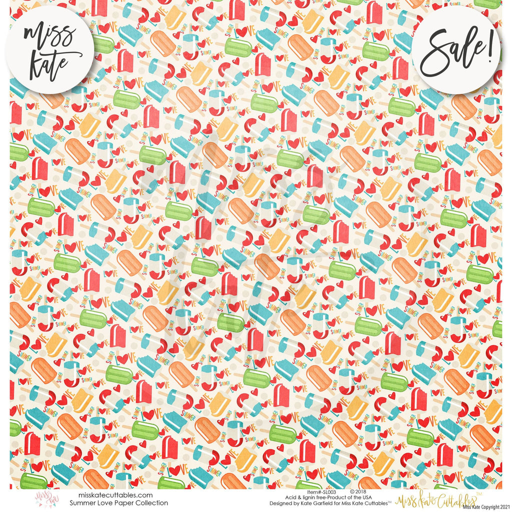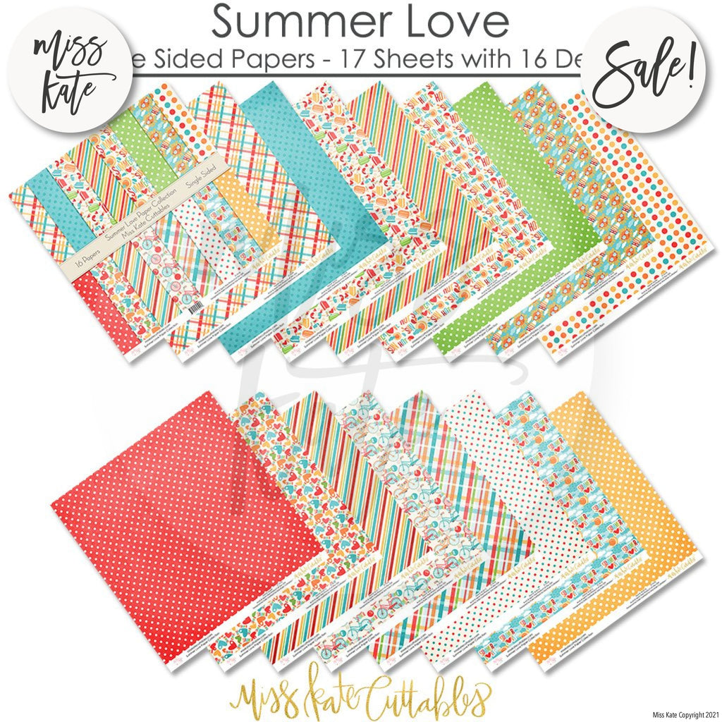 The Summer Love paper pack has a wide variety of Patterns including Polka Dots, Stripes, Plaid, Sun, Water, Splashes, Pool Tube, Floaty, Popsicles, Watermelon, Sunglasses, Bicycle, Banners, Umbrella, Beach Balls, Red, Orange, Yellow, Blue, Green, and White. Theme Vacation Summertime Season