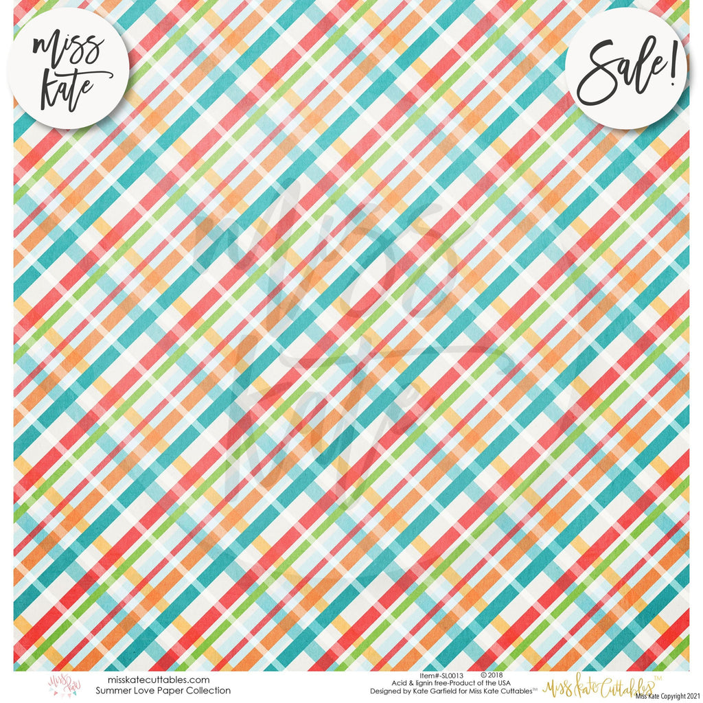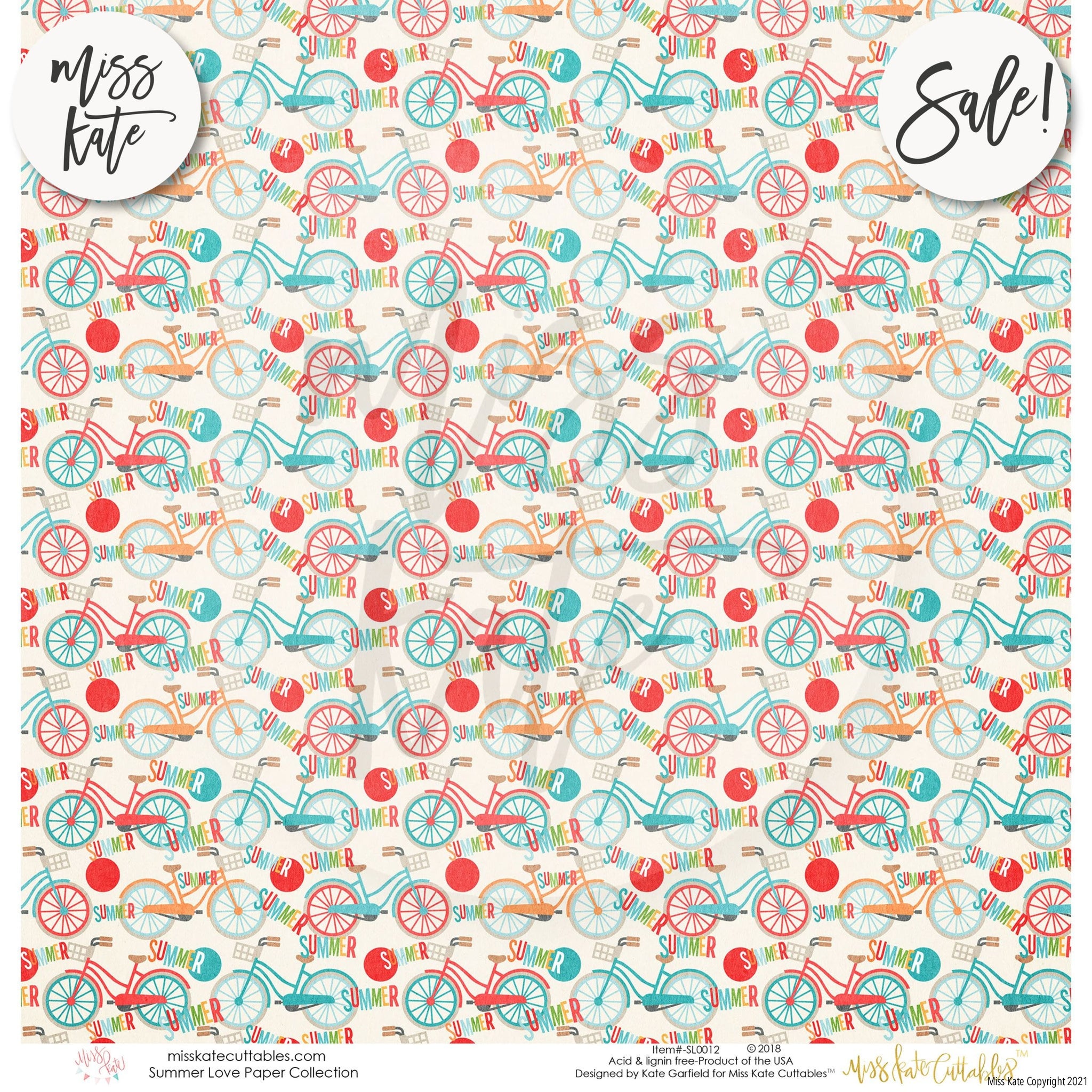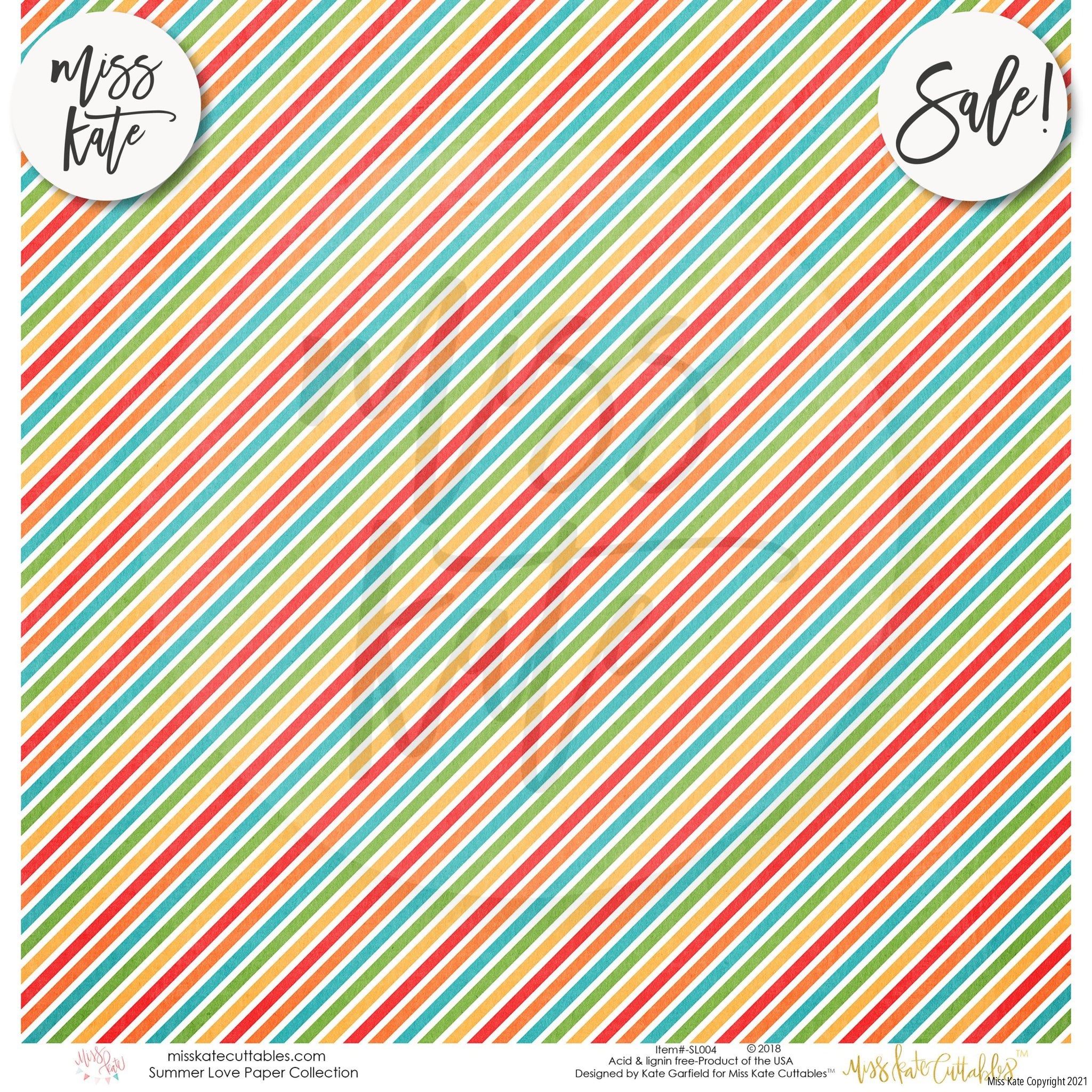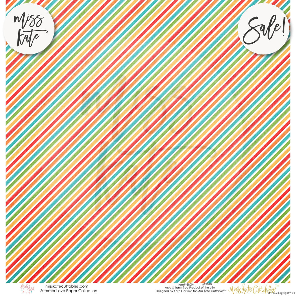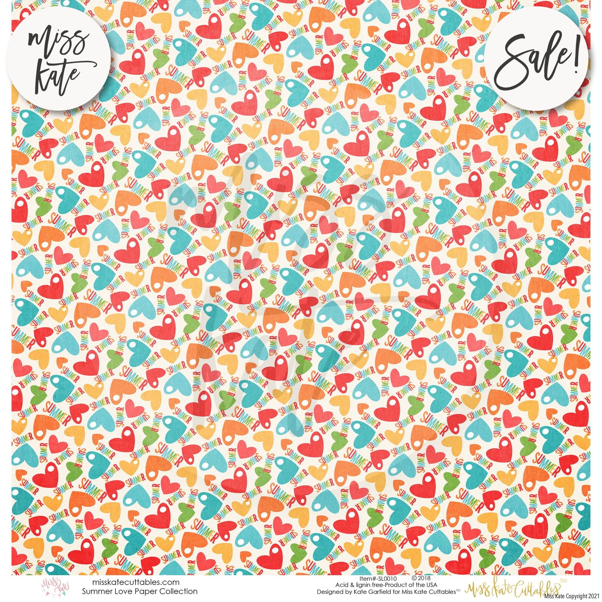 The Summer Love paper pack has a wide variety of Patterns including Polka Dots, Stripes, Plaid, Sun, Water, Splashes, Pool Tube, Floaty, Popsicles, Watermelon, Sunglasses, Bicycle, Banners, Umbrella, Beach Balls, Red, Orange, Yellow, Blue, Green, and White. Theme Vacation Summertime Season