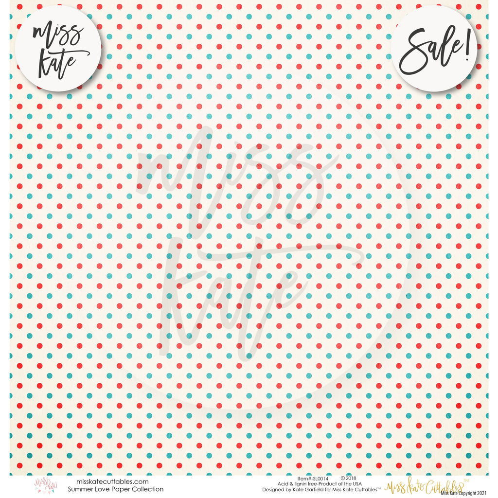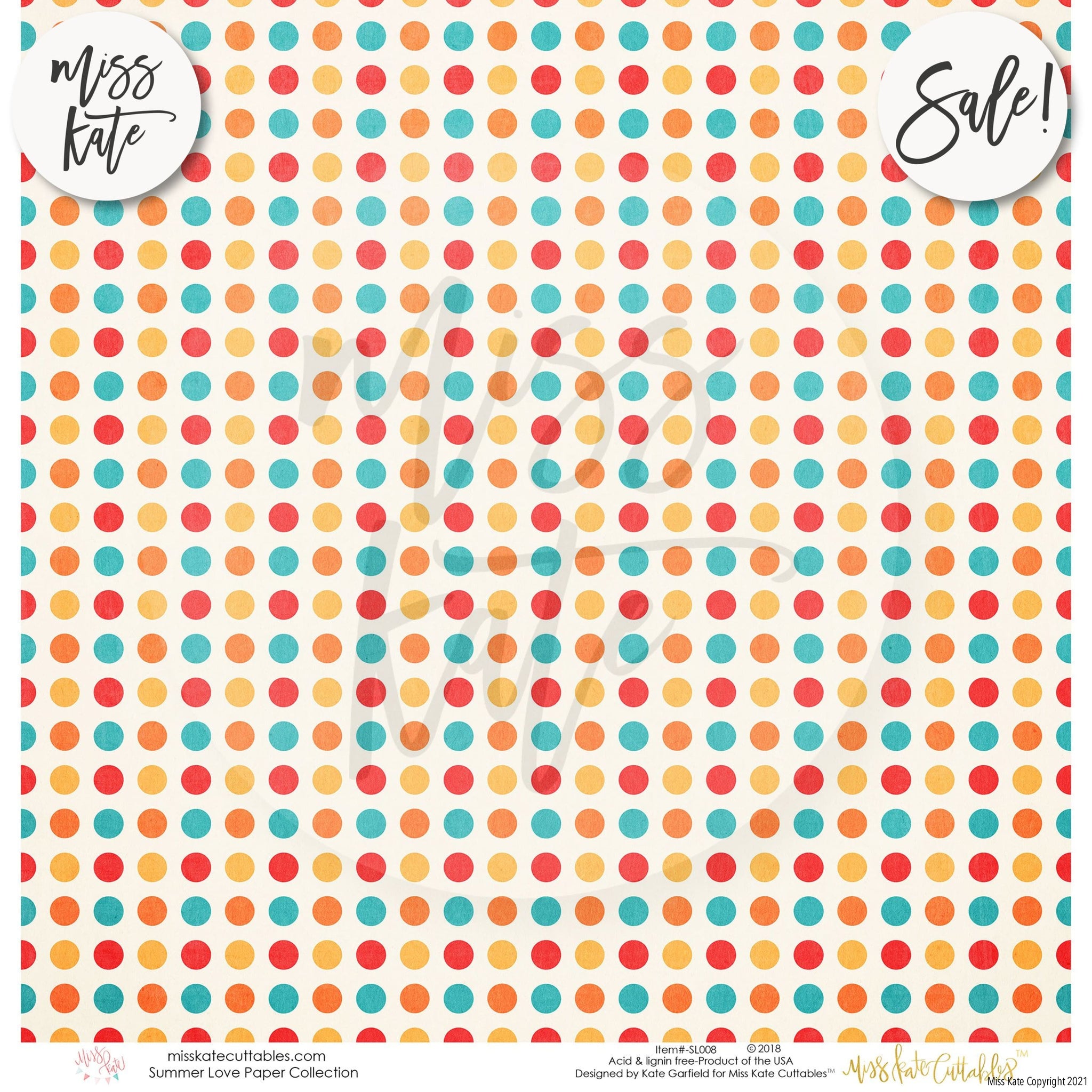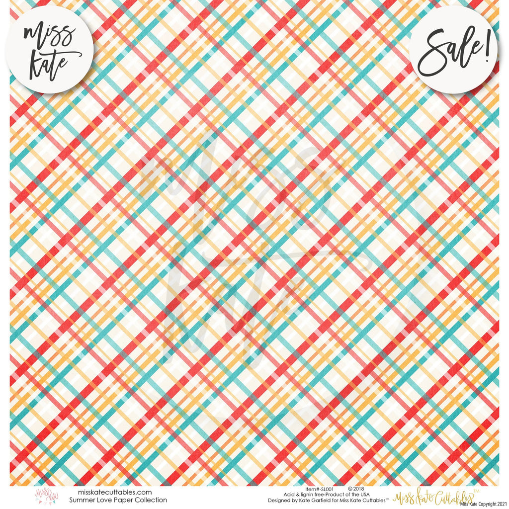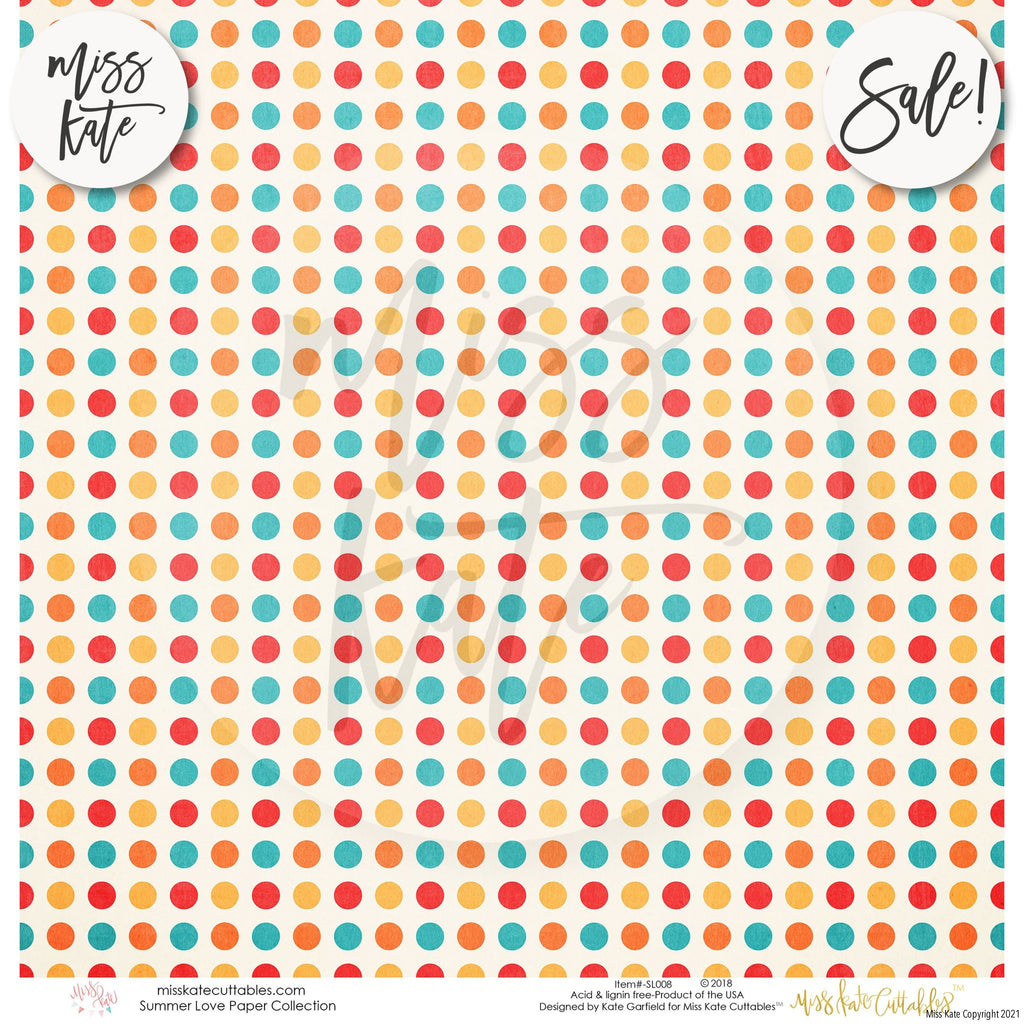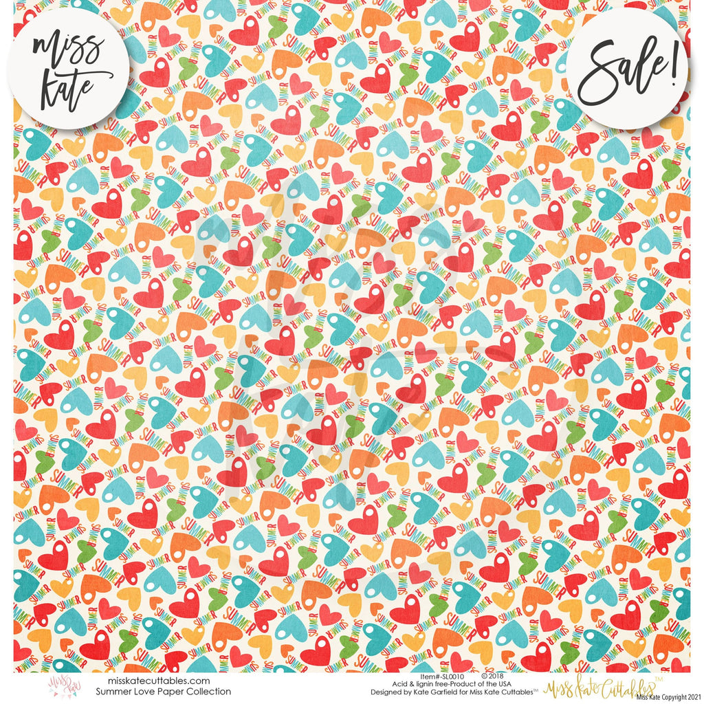 The Summer Love paper pack has a wide variety of Patterns including Polka Dots, Stripes, Plaid, Sun, Water, Splashes, Pool Tube, Floaty, Popsicles, Watermelon, Sunglasses, Bicycle, Banners, Umbrella, Beach Balls, Red, Orange, Yellow, Blue, Green, and White. Theme Vacation Summertime Season