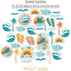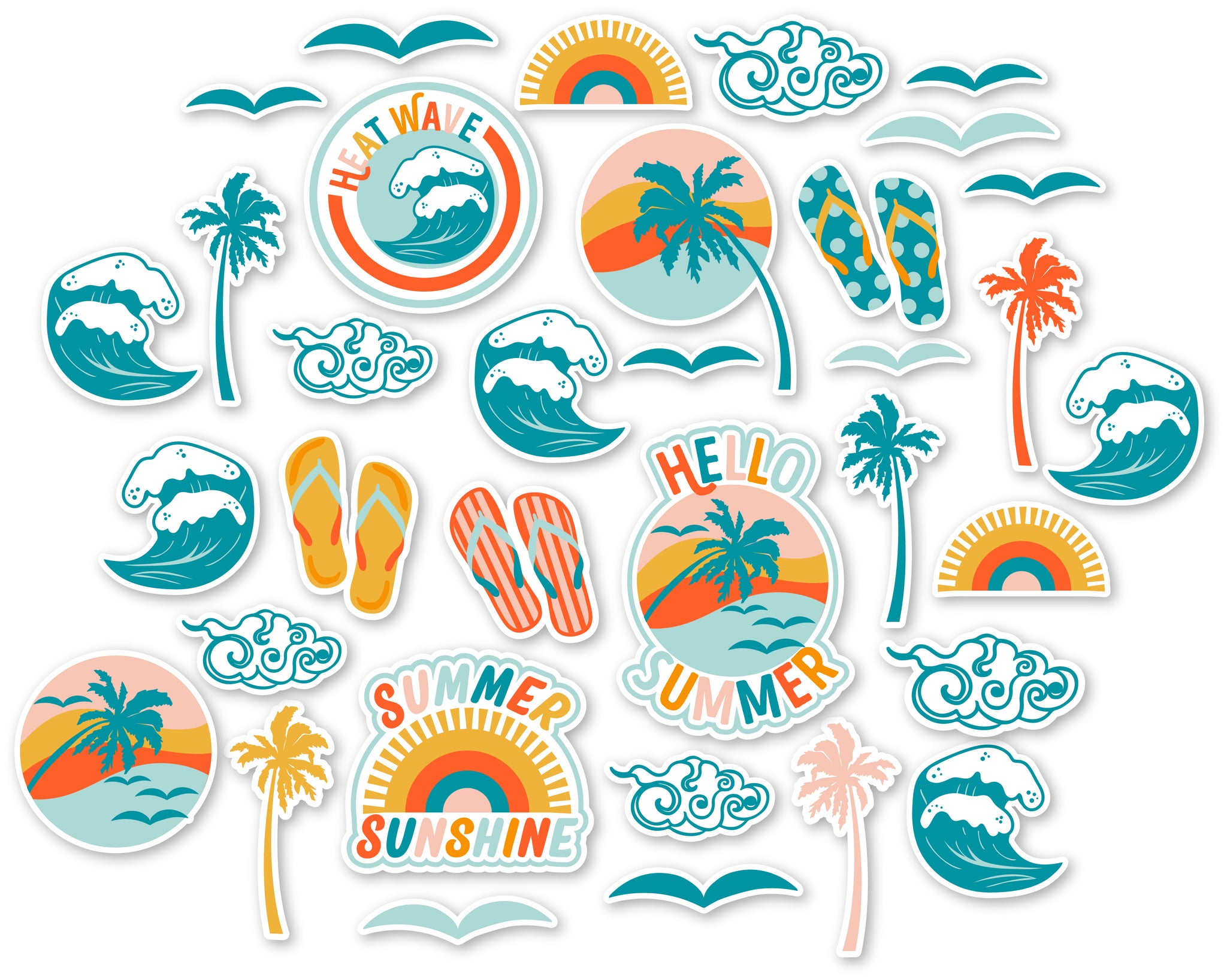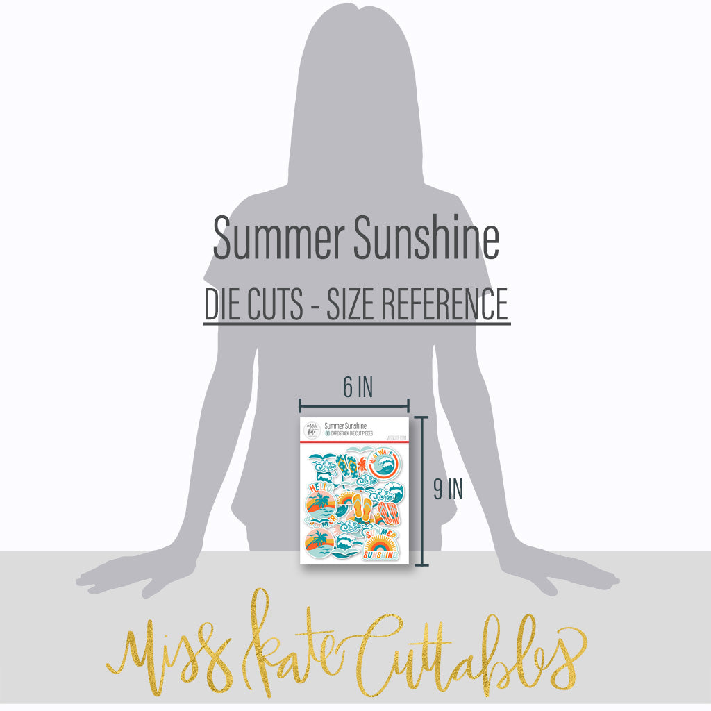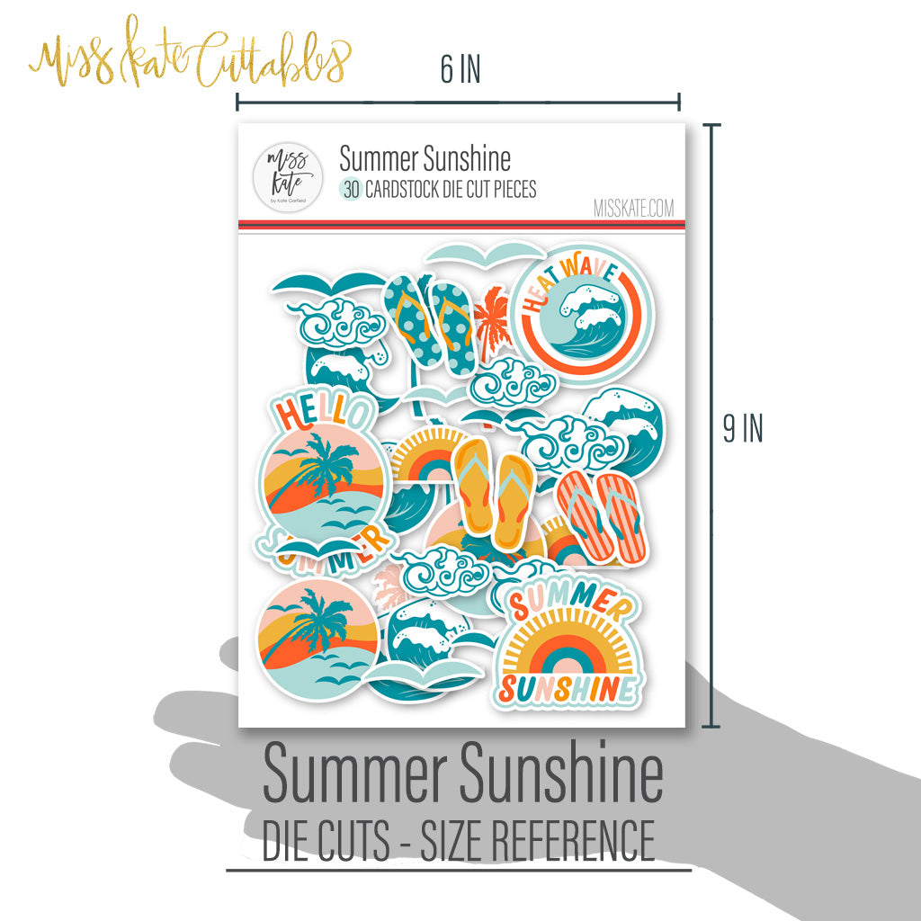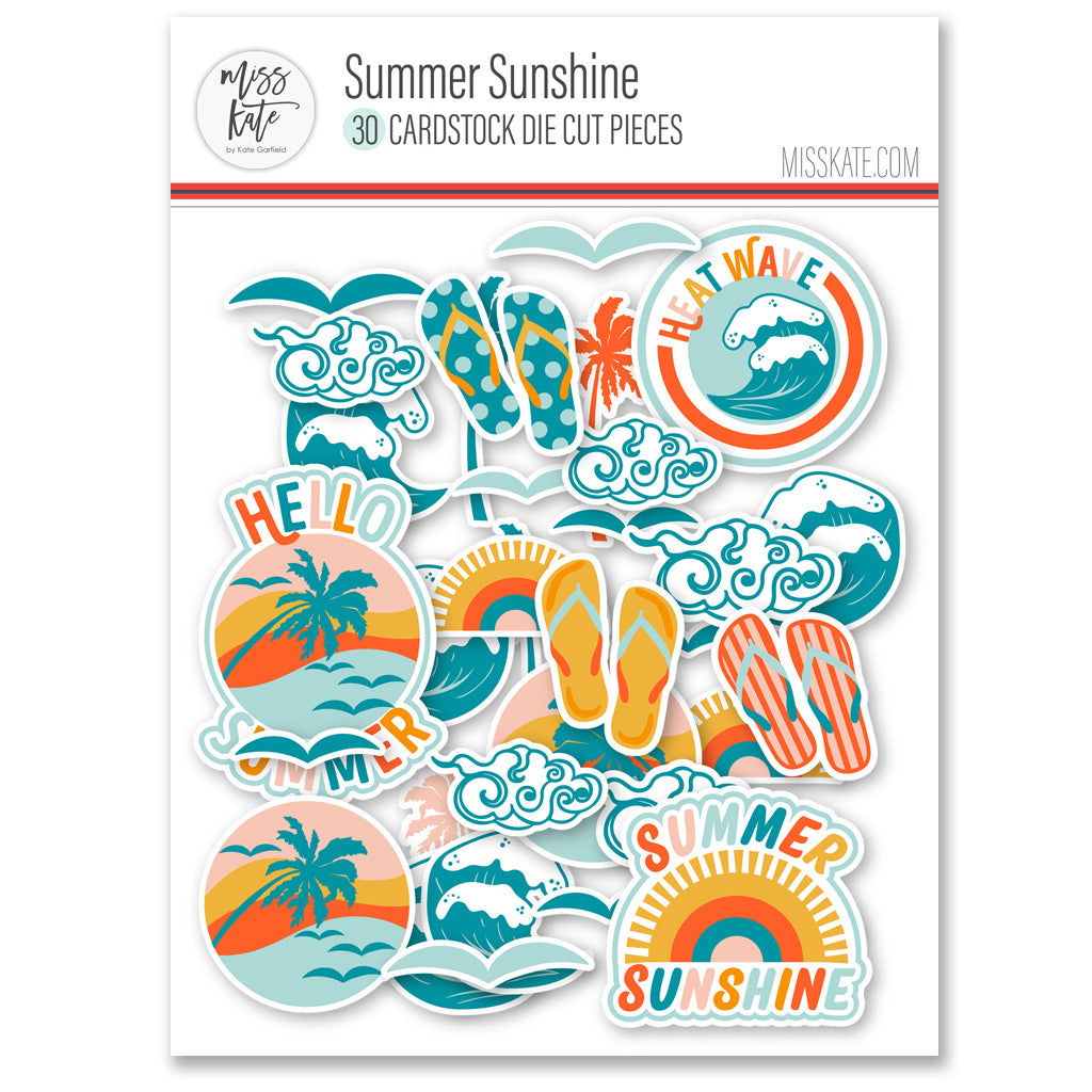 The "Summer Sunshine" die-cut set from Miss Kate Designs — is a vibrant collection of paper embellishments perfect for memory keeping, scrapbooking, journaling, or card making. Collection Overview:A delightful collection of summer-themed die cuts, each designed with a colorful, retro-inspired palette and playful beach motifs. The set includes a variety of cutouts such as stylized ocean waves, palm trees in multiple colors, fluffy clouds, seagulls in flight, and vibrant rainbows. Several elements carry cheerful summer messages like “HELLO SUMMER,” “HEAT WAVE,” and “SUMMER SUNSHINE,” all rendered in bold, colorful typography that complements the warm and breezy vibe. Other standout pieces include flip-flops in bright orange, yellow, and teal patterns, circular sunset scenes with silhouetted palm trees, and multiple variations of foamy turquoise waves. Ideal for layering in scrapbooks, journals, or summer-themed crafts. Overall, this die cut set evokes the carefree essence of beach days and sunshine, perfect for adding a splash of summer fun to any project. Perfect For: