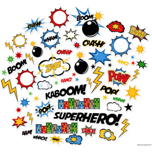 The Superhero Die Cut Pack has a wide variety of designs including "Boom" "Bam" "Crash" "Bang" "Zap" "Pop" "Kaboom!" "Wham!" "Crack" "Whack" "Superhero!" "Crash" Titles, bomb, stars, clouds, sun, lightning, apartment buildings, clouds with stars on them.