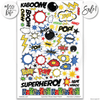 The Superhero Sticker Sheet has a wide variety of designs, including "Boom" "Bam" "Crash" "Bang" "Zap" "Pop" "Kaboom!" "Wham!" "Crack" "Whack" "Superhero!" "Crash" Titles, bomb, stars, clouds, sun, lightning, apartment buildings, clouds with stars on them.