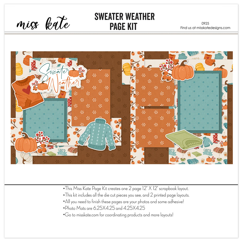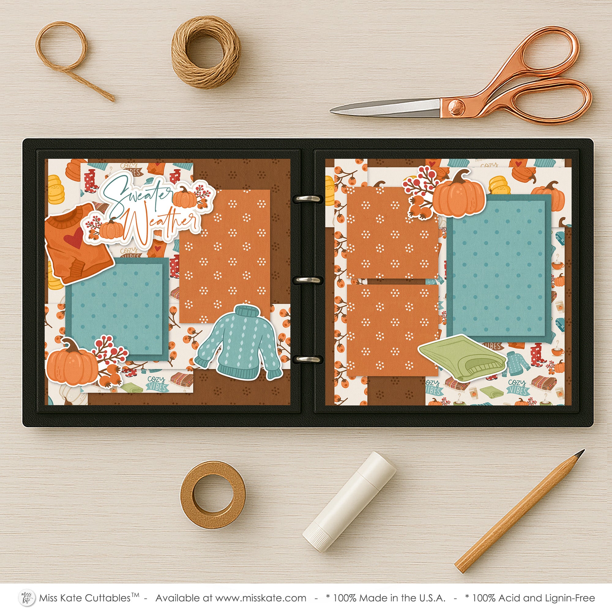 This cozy scrapbook layout titled “Sweater Weather” captures the warm and inviting spirit of autumn. The design features a delightful mix of patterns, including polka dots, florals, and playful seasonal prints in shades of teal, burnt orange, cream, and brown. Charming illustrations of sweaters, pumpkins, blankets, and sprigs of berries highlight the theme of comfort and fall coziness. The large title, decorated with pumpkins and autumn branches, sets the mood perfectly, while multiple photo mats offer space to preserve treasured seasonal memories. With its cheerful colors and whimsical details, this layout beautifully celebrates the simple joys of crisp fall days, cozy clothing, and time spent with loved ones.