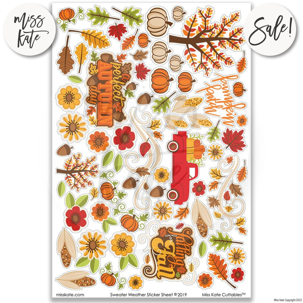 The Sweater Weather Sticker Sheet has a wide variety of designs, including "A Perfect Autumn Day" "Pumpkin Patch" "Falling for Fall" Corn, Pumpkins, Leaves, Flowers, Harvest truck, Tree, Gusts of Wind, Acorn.