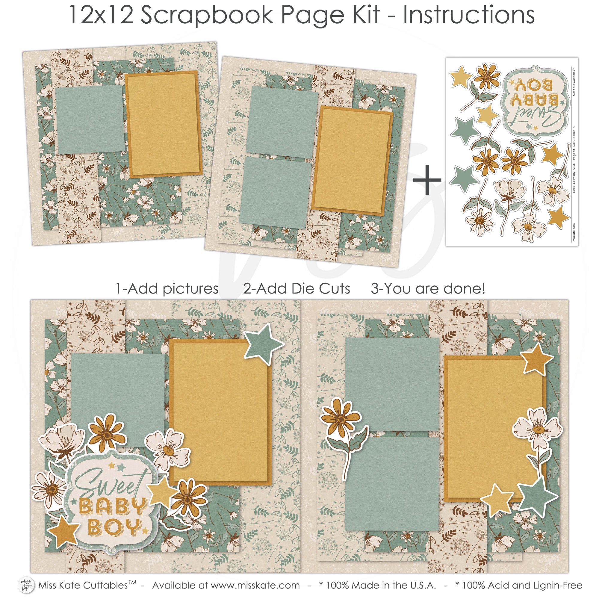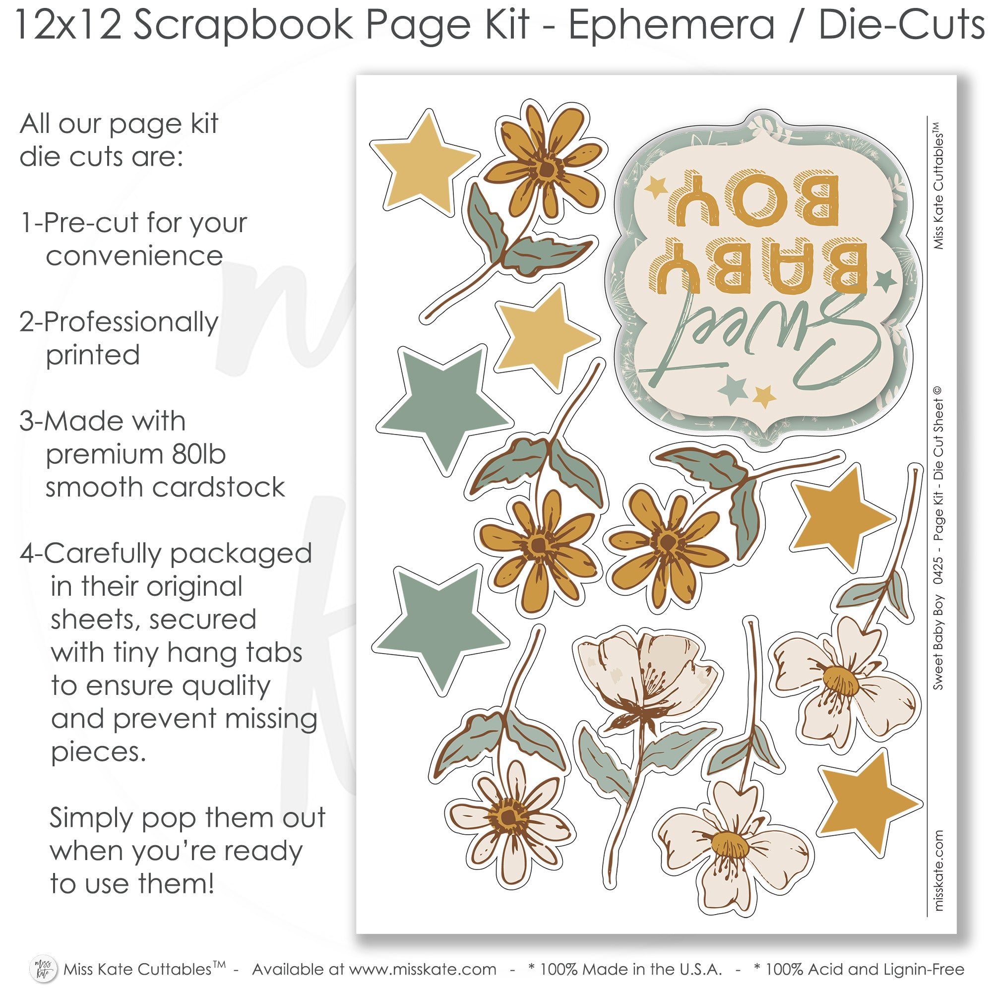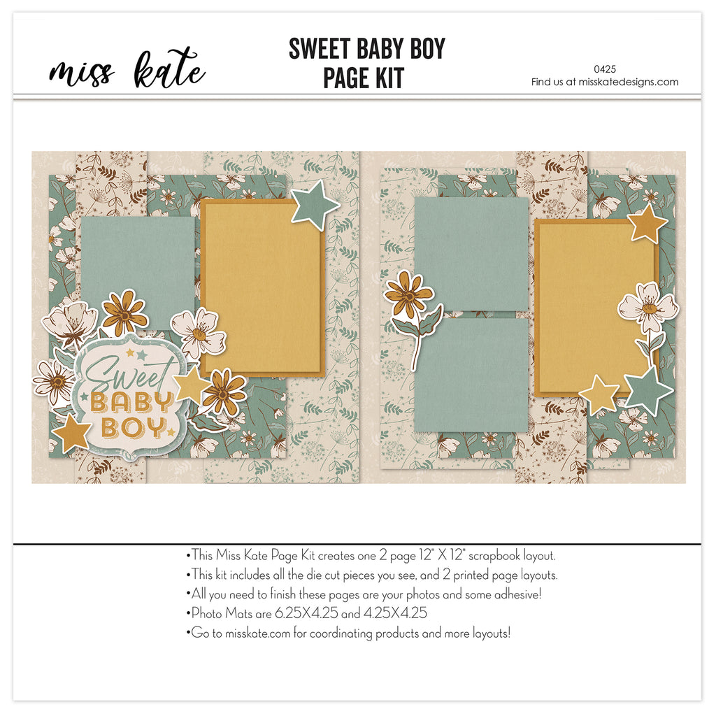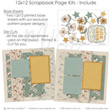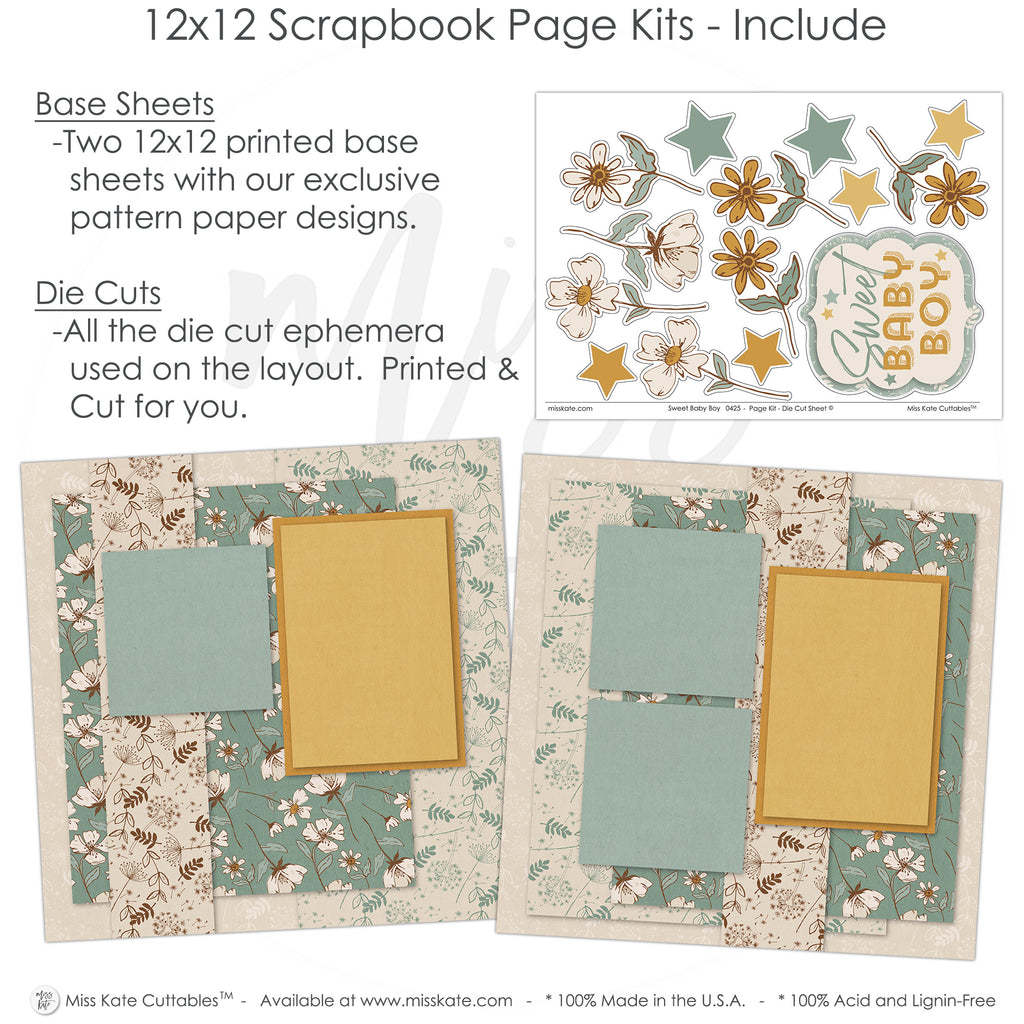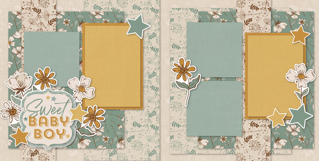 What to Expect:• Two 12x12 base sheets with floral, star, and soft beige/blue-green backgrounds • Die cuts: yellow stars, white and gold flowers, 'Sweet Baby Boy' title with layered accents |
