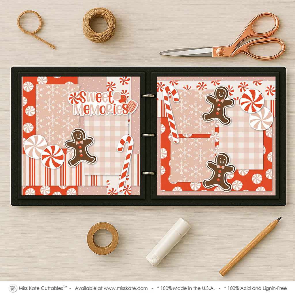 This scrapbook layout captures the warm, playful spirit of the holiday season with a “Sweet Memories” theme centered around Christmas treats. The design features a delightful mix of soft blush pinks, peppermint reds, and creamy whites, creating a cozy candy-shop feel. Patterns of snowflakes, polka dots, and candy swirls layer beautifully across the pages, balanced by plaid and striped accents that add structure and charm. Scattered throughout are cheerful gingerbread men, peppermint candies, and candy canes, giving the pages a festive, sugary personality. The title, Sweet Memories, is styled with candy-inspired lettering and gingerbread embellishments, perfectly complementing the theme. Together, these elements create a joyful and nostalgic holiday spread—ideal for documenting baking days, cookie exchanges, or cozy family traditions filled with laughter and sweetness.