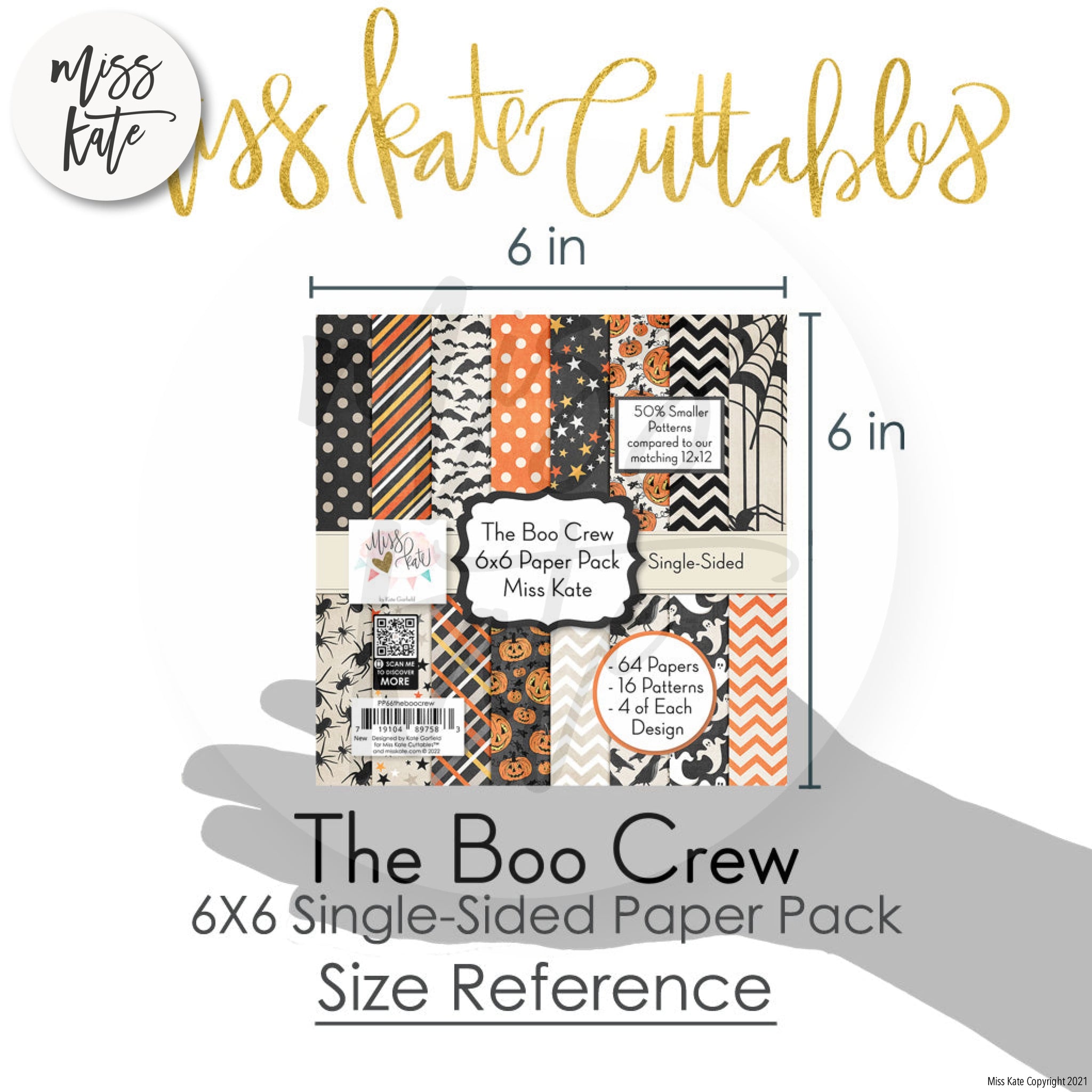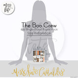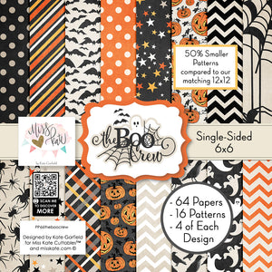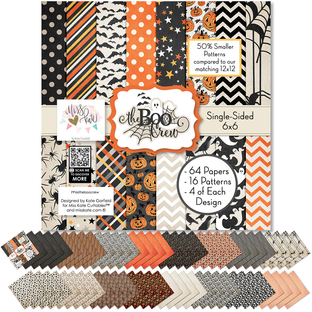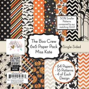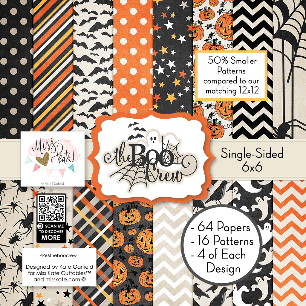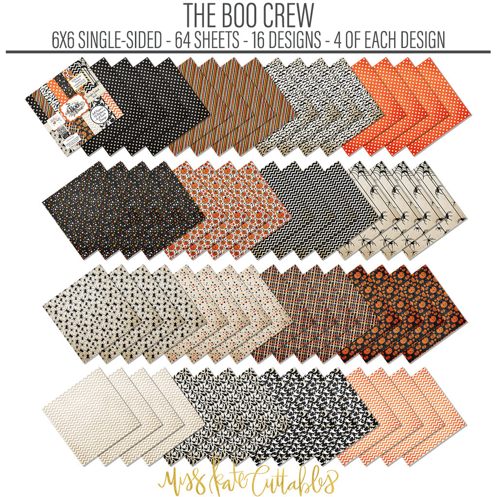 The Boo Crew PP has a variety of patterns: polka dots pumpkins spiderweb chevron spiders crow
