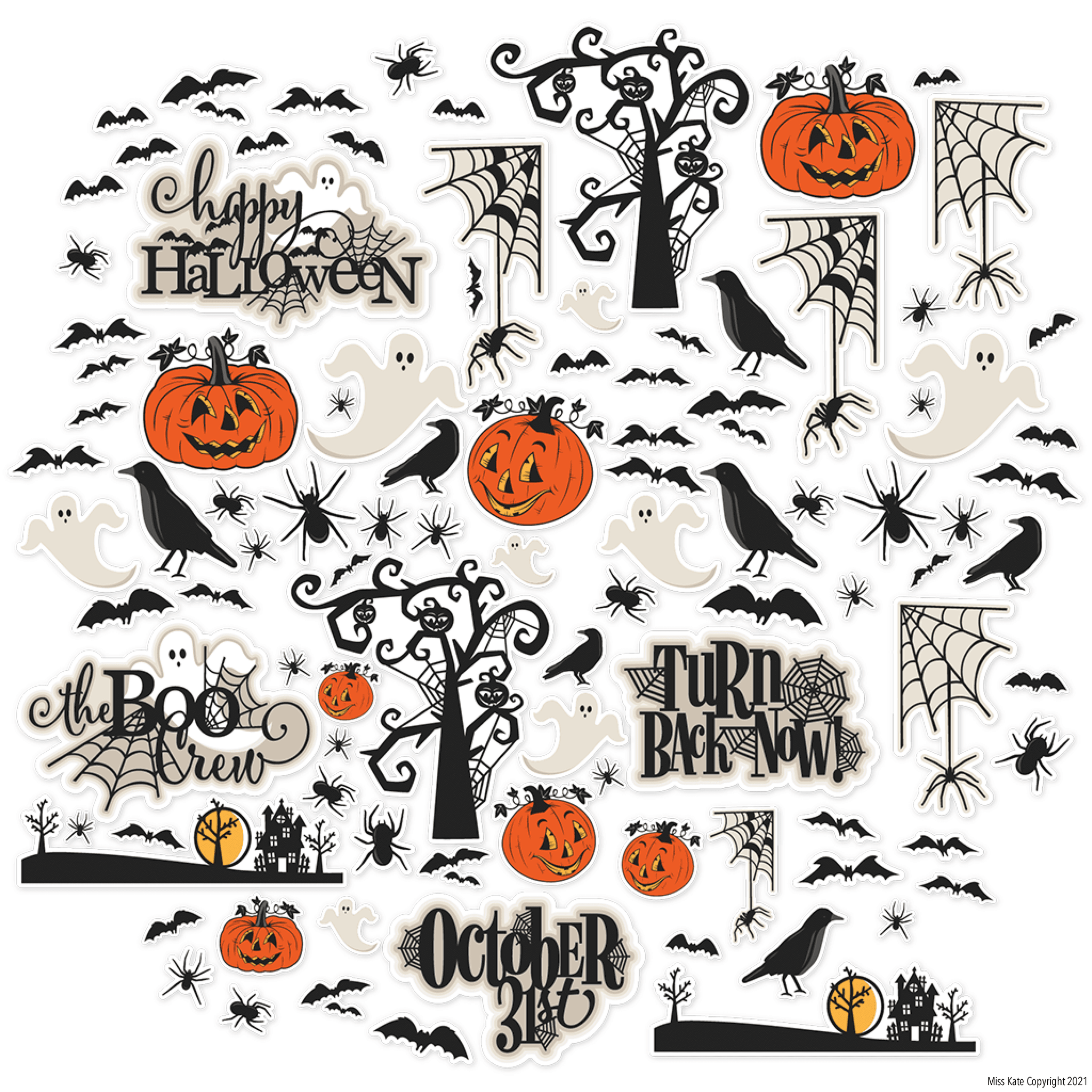The Boo Crew Die Cut Pack has a wide variety of designs including "Happy Halloween" "Turn back Now!" "October 31st" "the Boo Crew" Titles. Shapes include Bats, Spiders, Dead tree with spiderwebs, Spiderwebs, Pumpkins, Raven, Crow, Haunted House, Ghosts.