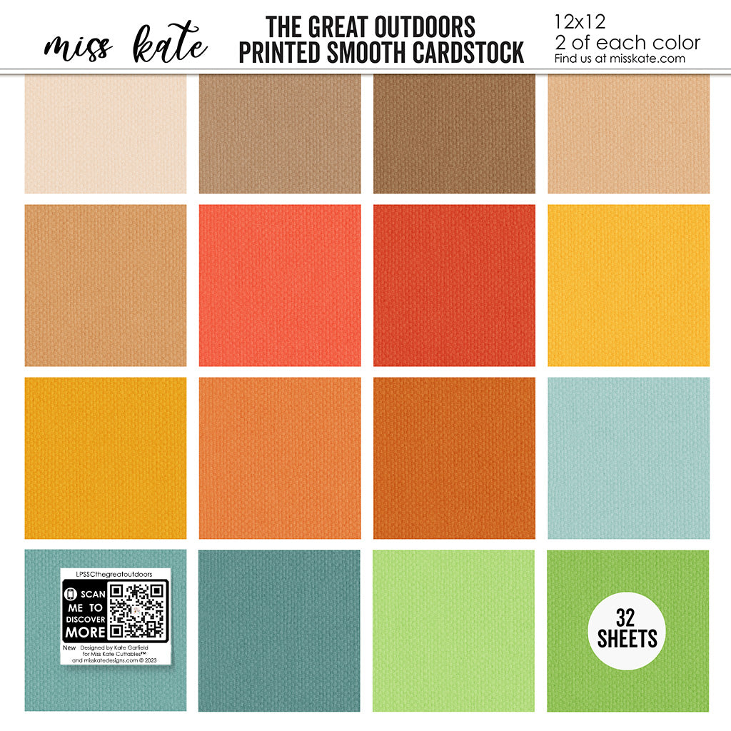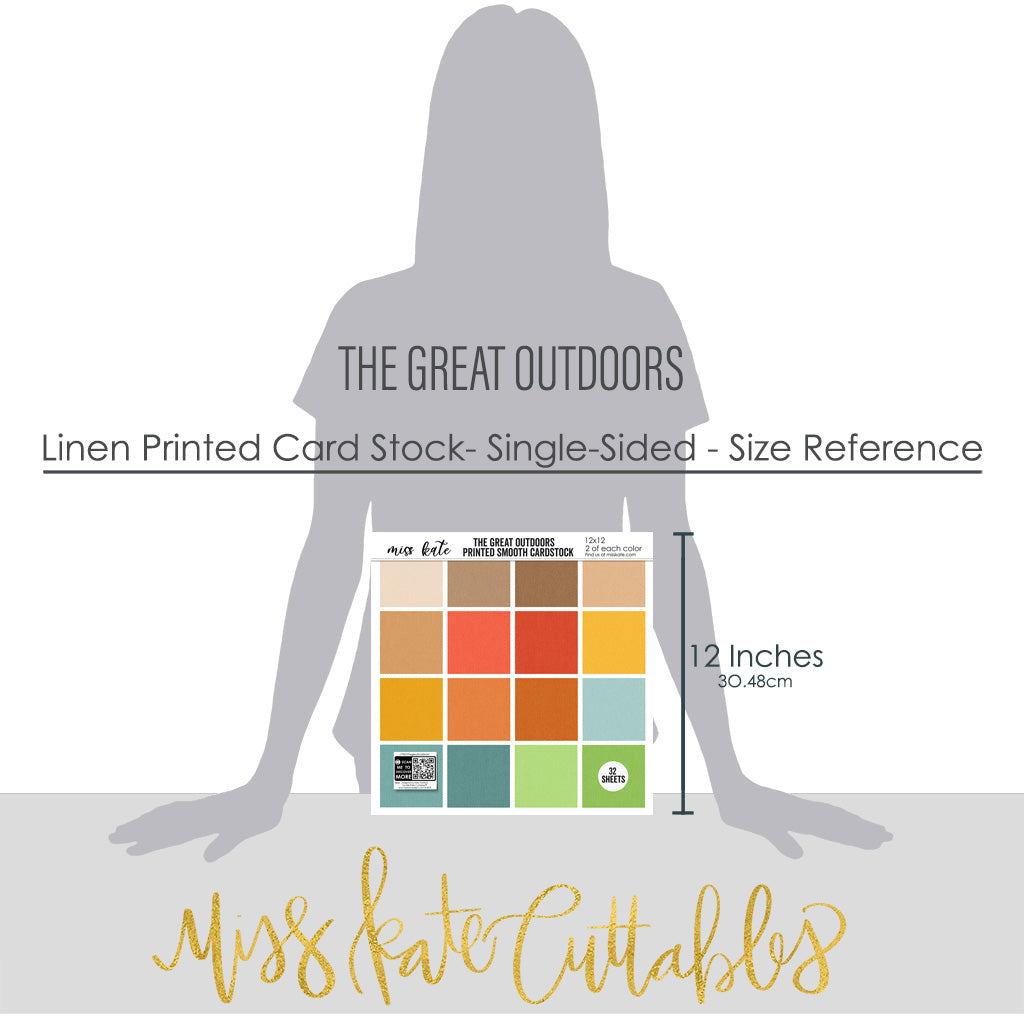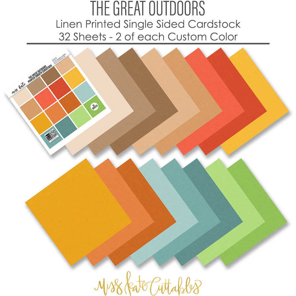 Cardstock Description Single-Sided Linen-Printed Smooth Cardstock Kate created 16 custom colors that perfectly match our The Great Outdoors designs, added her exclusive Linen Pattern, and combined them for you in this 32 sheet pack. Colors Match It has NEVER been this easy to match cardstock with paper! About our Paper Our cardstock sheets provide a stiff, strong surface to work on that has a linen feel. You will find that it cuts beautifully in your Cricut, Cameo, or any other cutting machine. It is perfect for backgrounds, die cuts, photo mats, and any other crafting project. We love our Linen Printed Card Stock and think you will too! THEME: Summer, Camping |