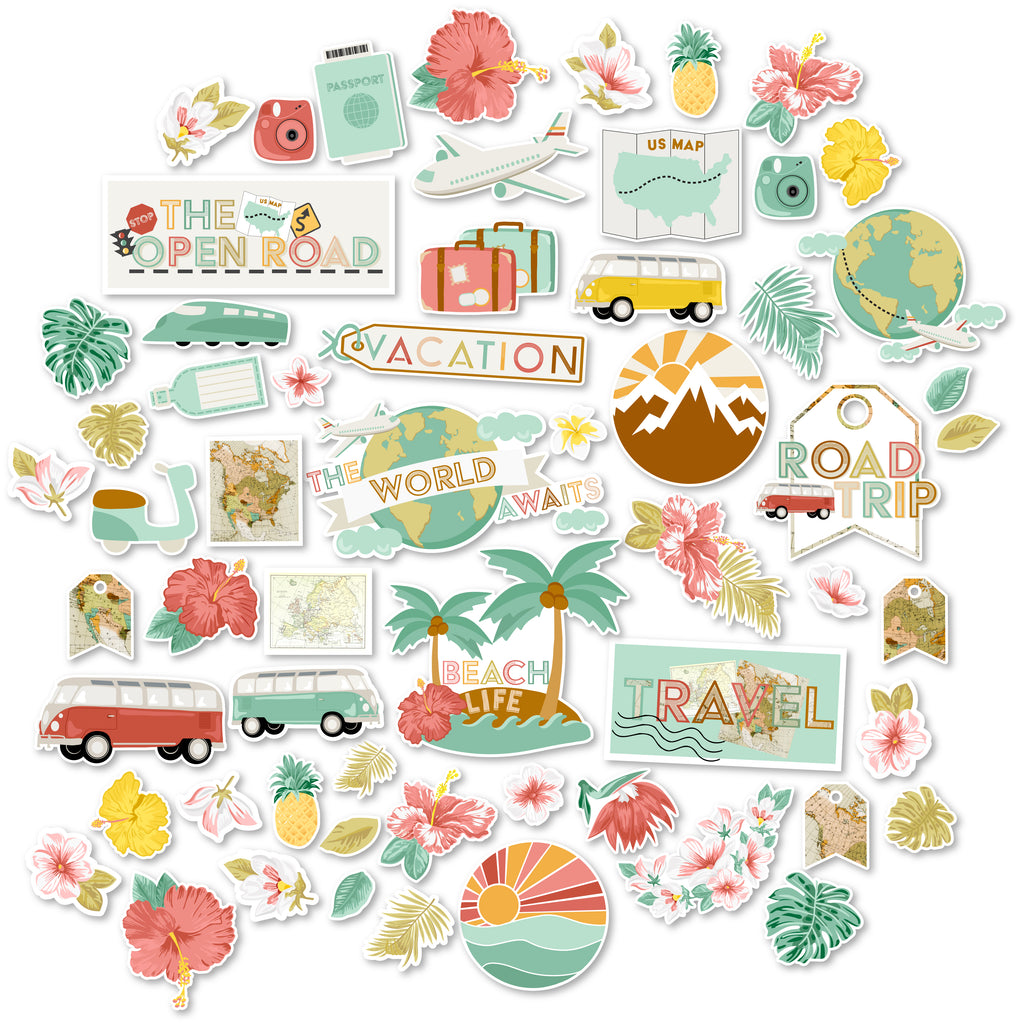 The World Awaits Die Cuts - have a wide variety of designs, including tropical flowers, palm trees, travel titles, and more!