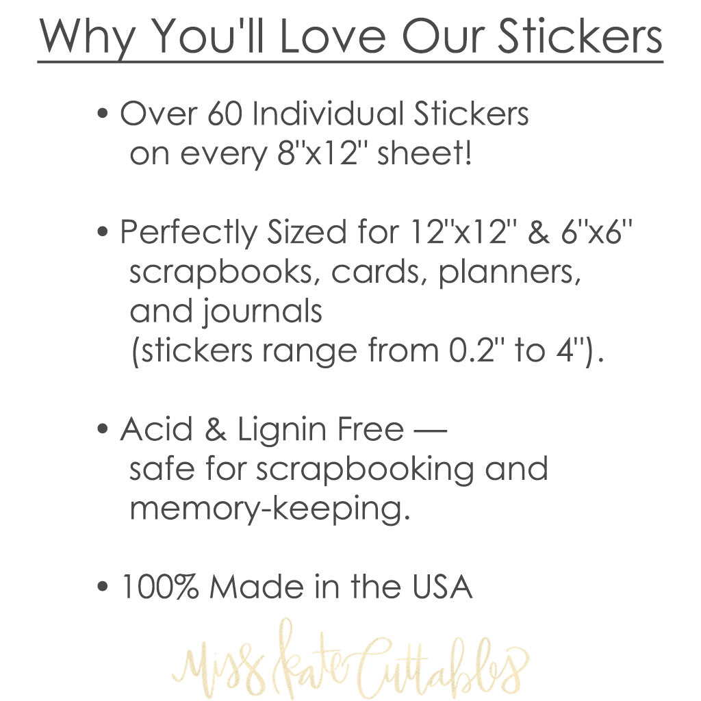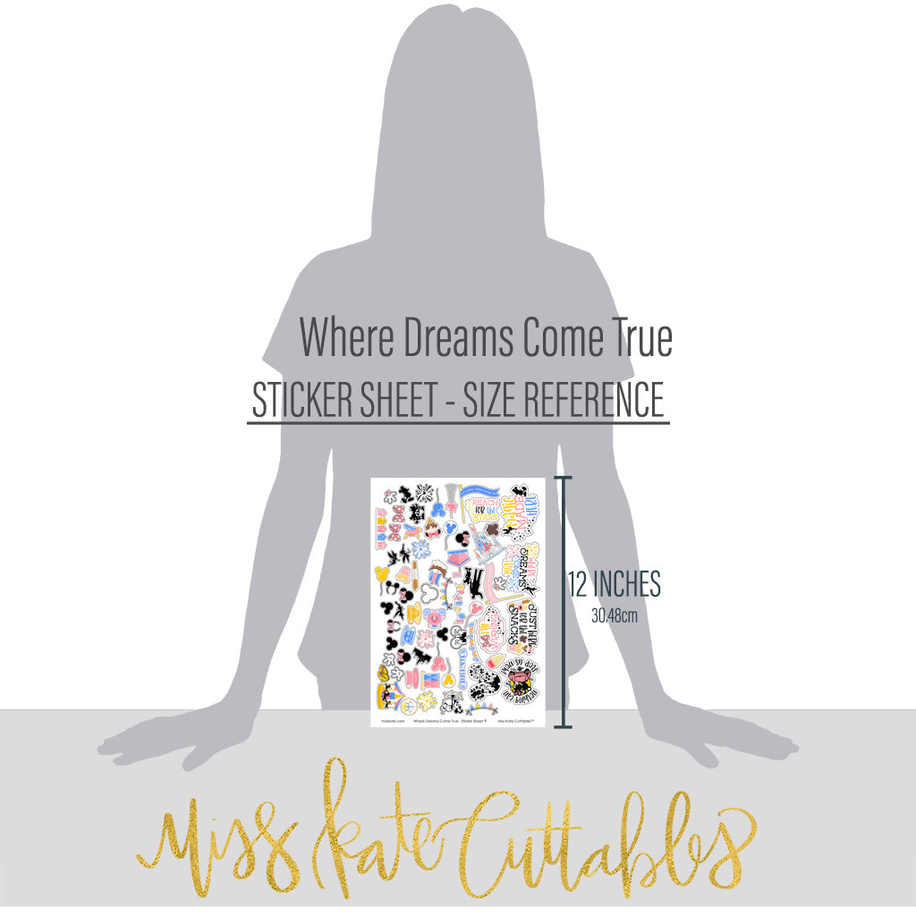 🎨 Where Dreams Come True - Stickers for Disney Parks✨ Dive into the magic of Disney parks with this "Where Dreams Come True" sticker sheet by Miss Kate Cuttables! It features playful illustrations and iconic silhouettes, capturing the enchantment of classic attractions and beloved snacks. Perfect for scrapbooking and decorating Disney-themed planners, this 8"x12" sheet is a joyful tribute to Disneyland, Magic Kingdom, EPCOT, Hollywood Studios, and Animal Kingdom. 🏰 Nods to Each Park• Cinderella’s castle for Magic Kingdom and Disneyland Sweet treats like Mickey ice cream bars, churros, cotton candy, and Dole Whip evoke magical mid-day snack breaks. Minnie bows, autograph books, and popcorn buckets add to the fun. 📝 Uplifting TitlesUplifting phrases like "Magic Made," "Reach for the Stars," and "Dreams Do Come True" add energy and joy. Rendered in bright pinks, blues, reds, and yellows, these phrases are perfect for preserving precious memories from Disneyland and all Disney parks worldwide. Enjoy crafting with this vibrant sticker sheet! |