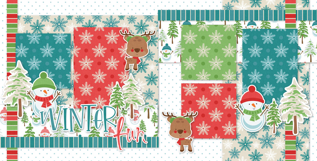 This cheerful winter scrapbook layout is filled with bright patterns, playful characters, and layered textures that create a lively seasonal scene. The background mixes soft polka-dot prints with panels of teal, red, green, and beige snowflake papers, giving the spread a cozy, quilt-like feel. Snowmen bundled in colorful hats and scarves, along with adorable reindeer wearing festive accessories, appear throughout the design, bringing charm and personality. Tall snowy pine trees pop up behind and between the photo mats, helping frame the page with a forest-like atmosphere. Striped borders in teal, green, and red tie the layout together, while the large title “Winter Fun” stands out prominently at the bottom, blending playful typography with bold color. Overall, the layout feels joyful, energetic, and perfect for capturing snowy day memories.
